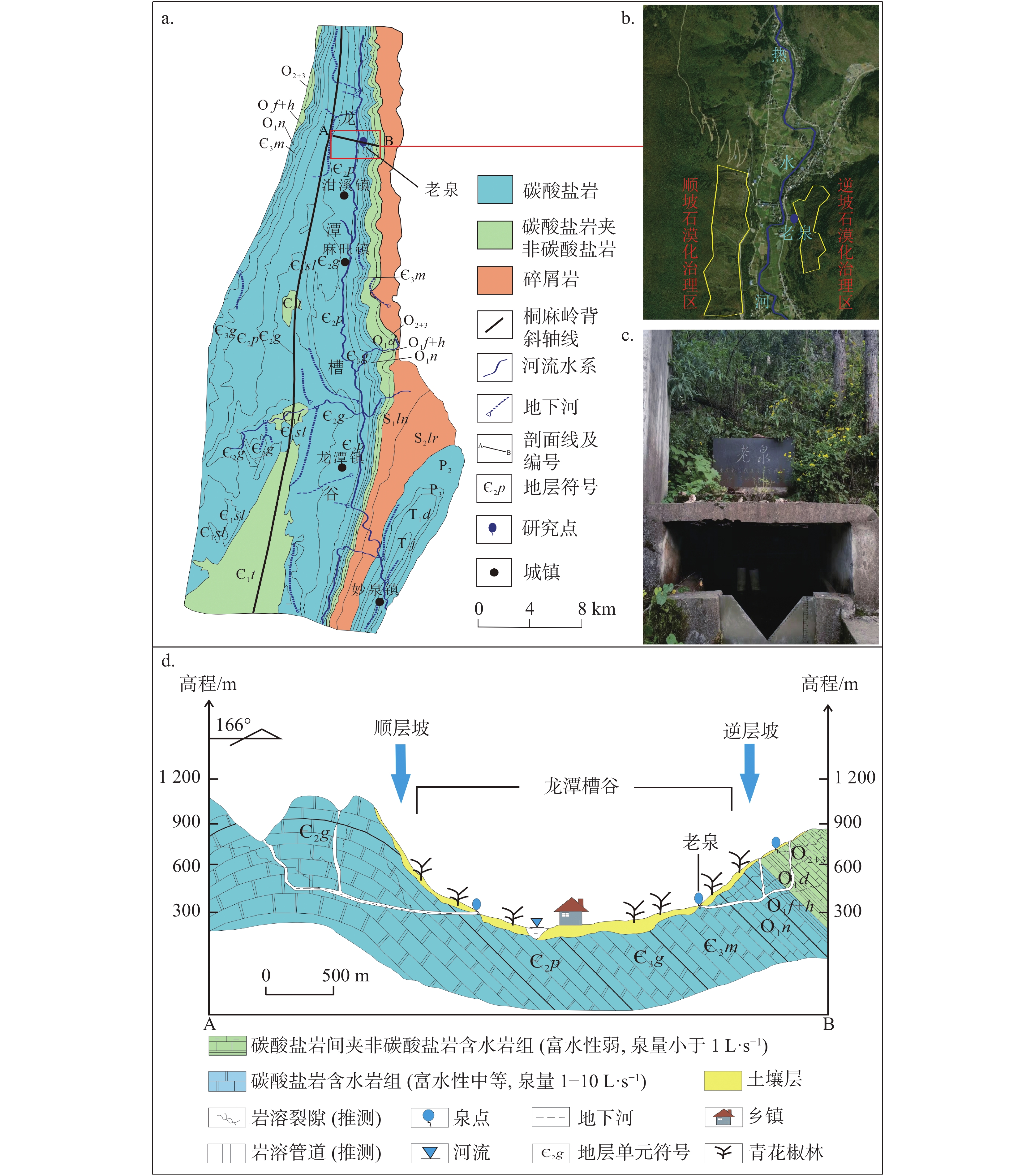 图 1 龙潭槽谷水文地质概况图(a-水文地质平面图,b-石漠化治理区卫星图(据Google Earth),c-老泉实景图,d-水文地质剖面图(修改自参考文献[25]))