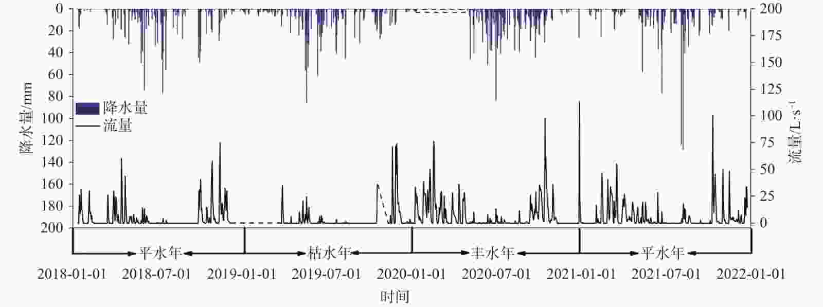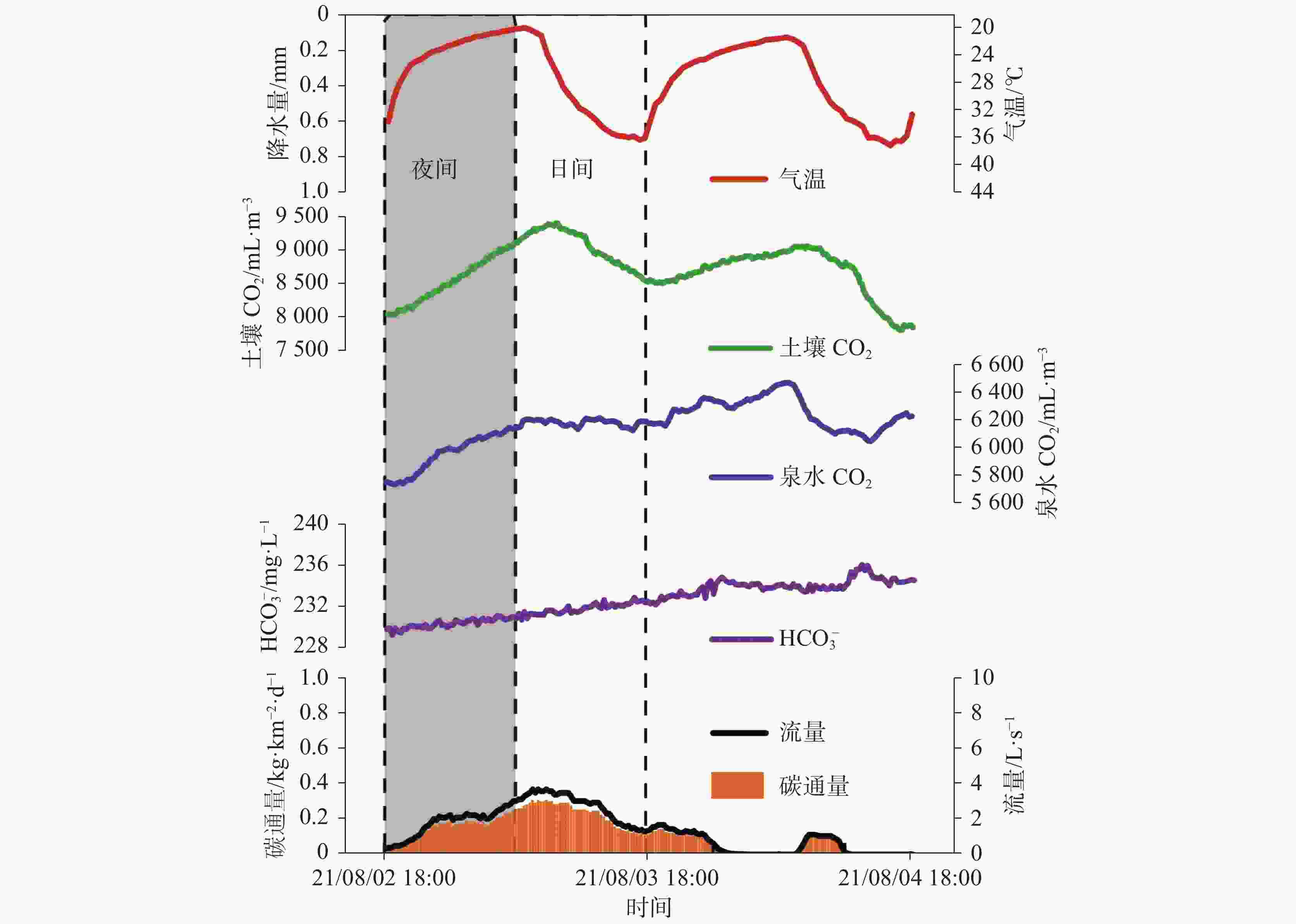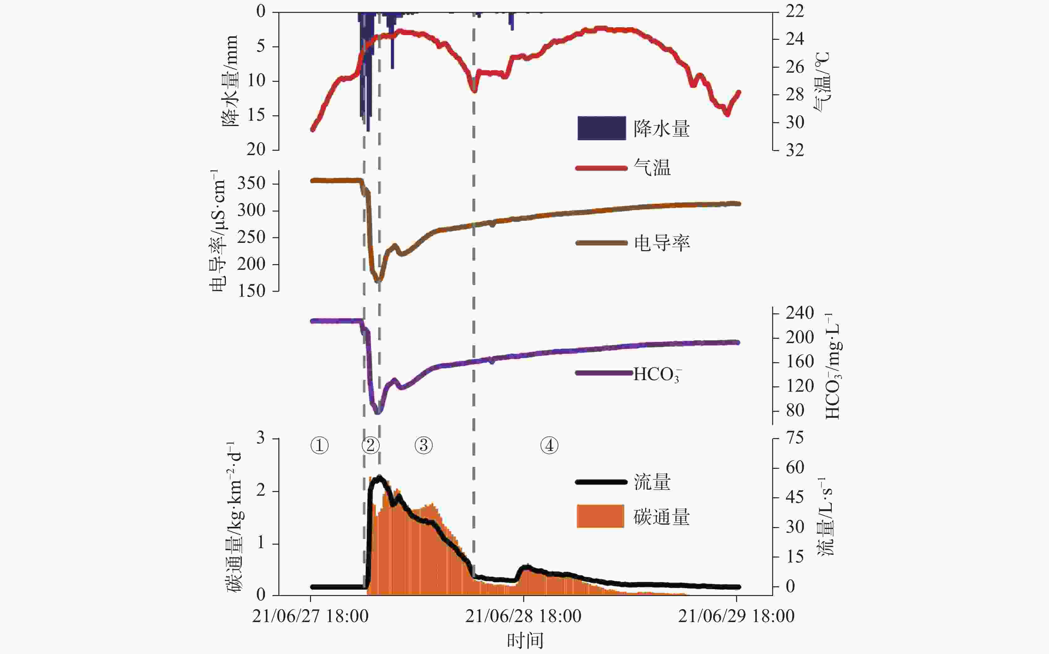 阶段 平均流量/L·s−1 ${\rm{HCO}}_3^{-}$平均浓度/mg·L−1 持续时间/h 各阶段累计的碳通量/kg·km−2·d−1 累计碳通量/kg·km−2·d−1 ① 0 227.53 6 0 97.64 ② 38.52 127.49 1.5 9.25 ③ 31.75 140.30 10.5 64.43 ④ 3.25 181.78 29 23.96 表 4 老泉2018-2021年的水文水化学与碳通量参数