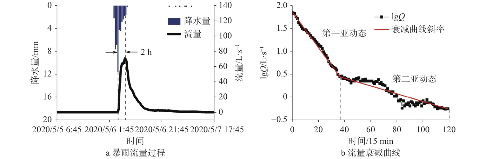 时间/年 2018 2019 2020 2021 多年平均值 降水总量/mm 1 485.2 1 461.6 1 500.2 1 429.8 1 470.0 伏旱期降水量/mm 103.8 139.6 216.8 491.2 237.9 伏旱期蒸发量/mm 166.9 178.7 178.7 226.9 187.8 伏旱期干旱天数/天 29 31 29 19 27 伏旱期降水天数/天 13 11 13 23 15 伏旱期高温天数(大于35 ℃)/天 27 29 23 25 26 伏旱期断流天数/天 37 34 18 23 28 伏旱期流量/L·s−1 0 0.03 0.65 2.38 0.76 表 2 老泉200506号暴雨的流量衰减参数