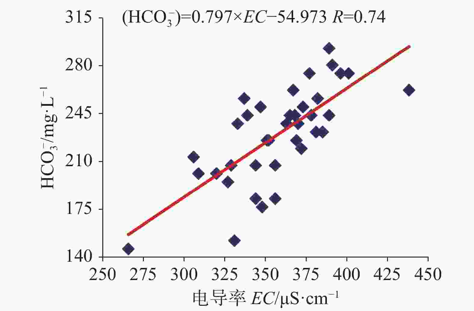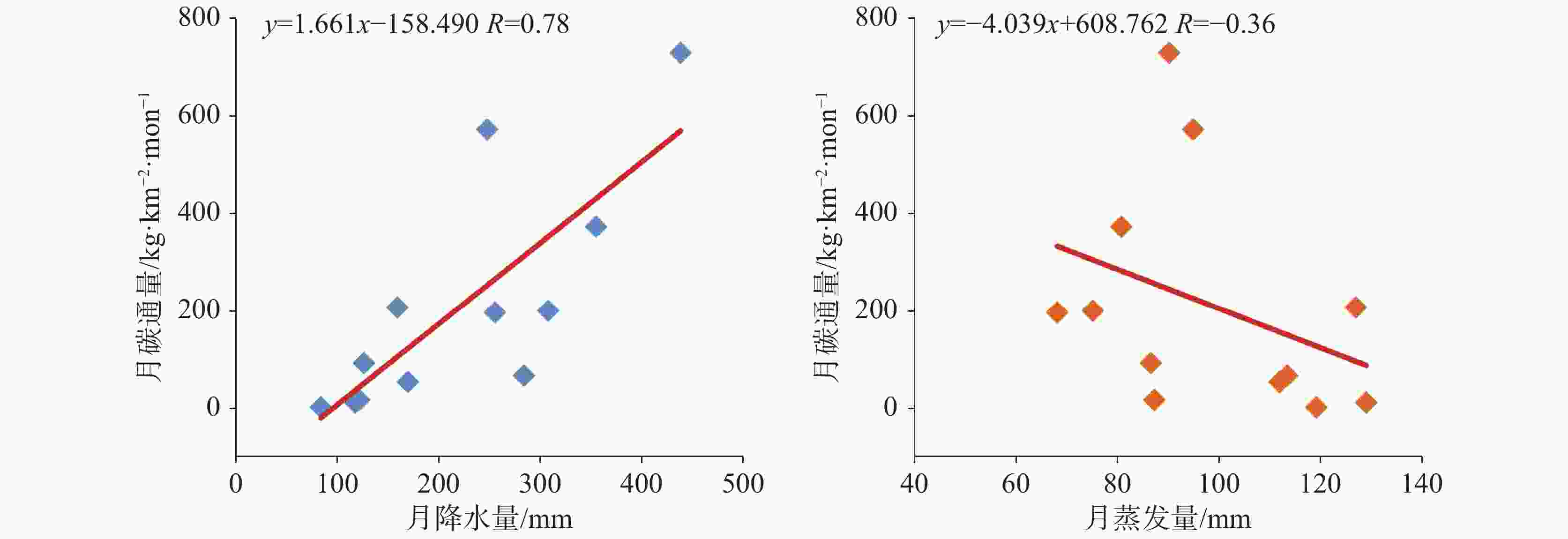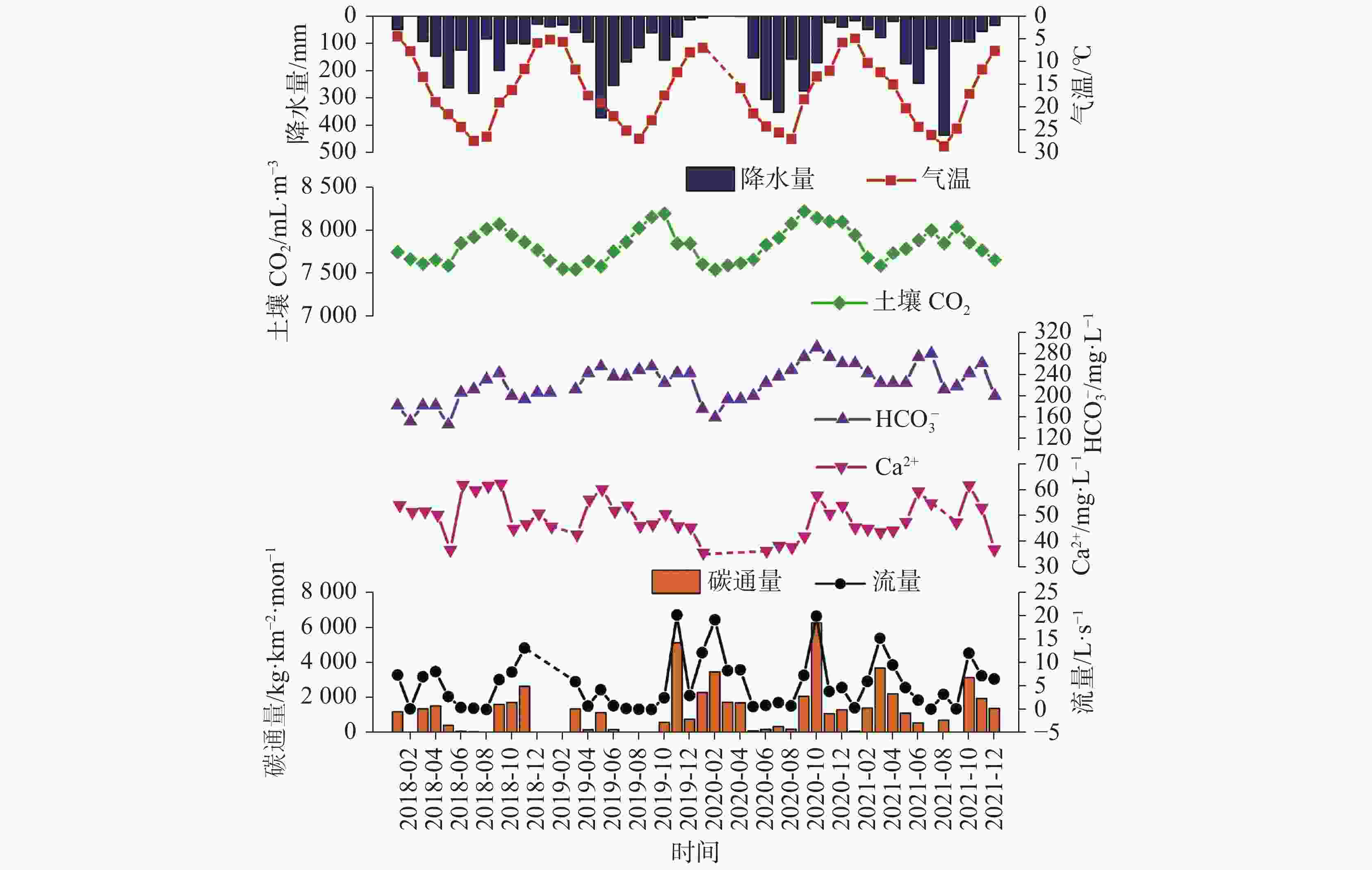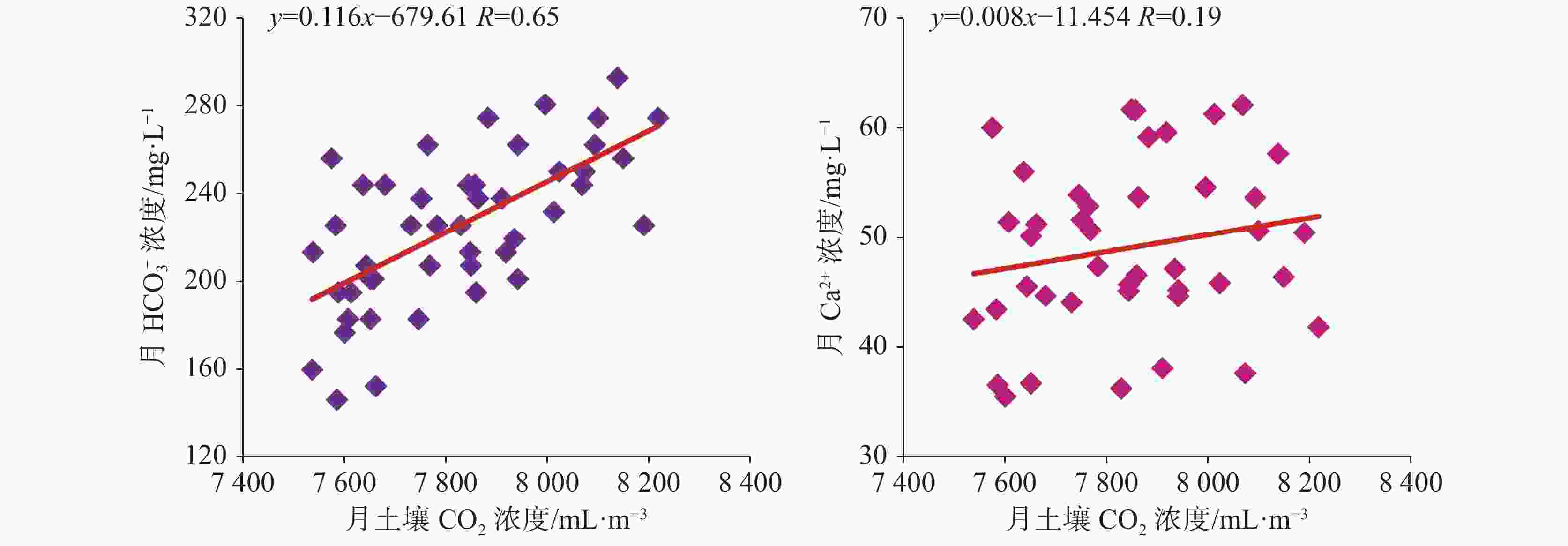 时间/年 ${\rm{HCO}}_3^{-}$浓度/mg·L−1 CO2消耗量/mg·L−1 年均流量/L·s−1 无机碳通量/t·km−2·a−1 2018年 197.23 71.13 4.68 11.66 2019年 234.85 84.70 3.48 10.33 2020年 231.03 83.32 7.30 21.31 2021年 239.64 86.43 5.58 16.90 平均值 225.69 81.40 5.26 15.05 表 5 老泉2018-2021年碳通量与土壤CO2浓度的相关性分析