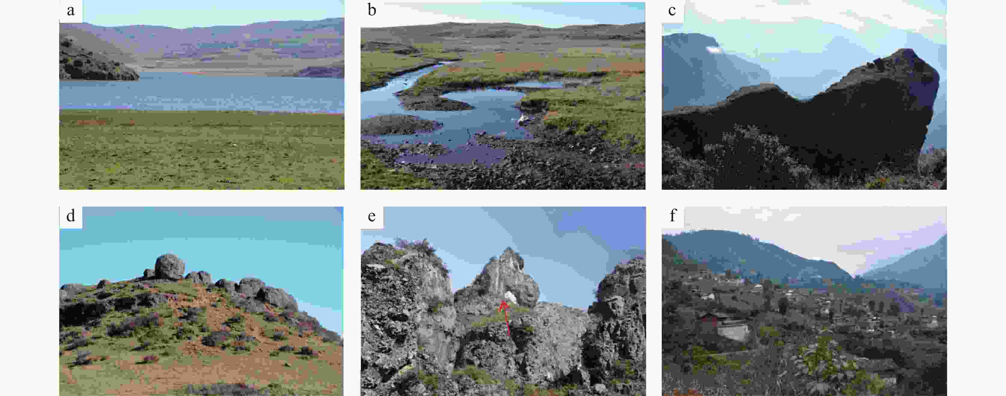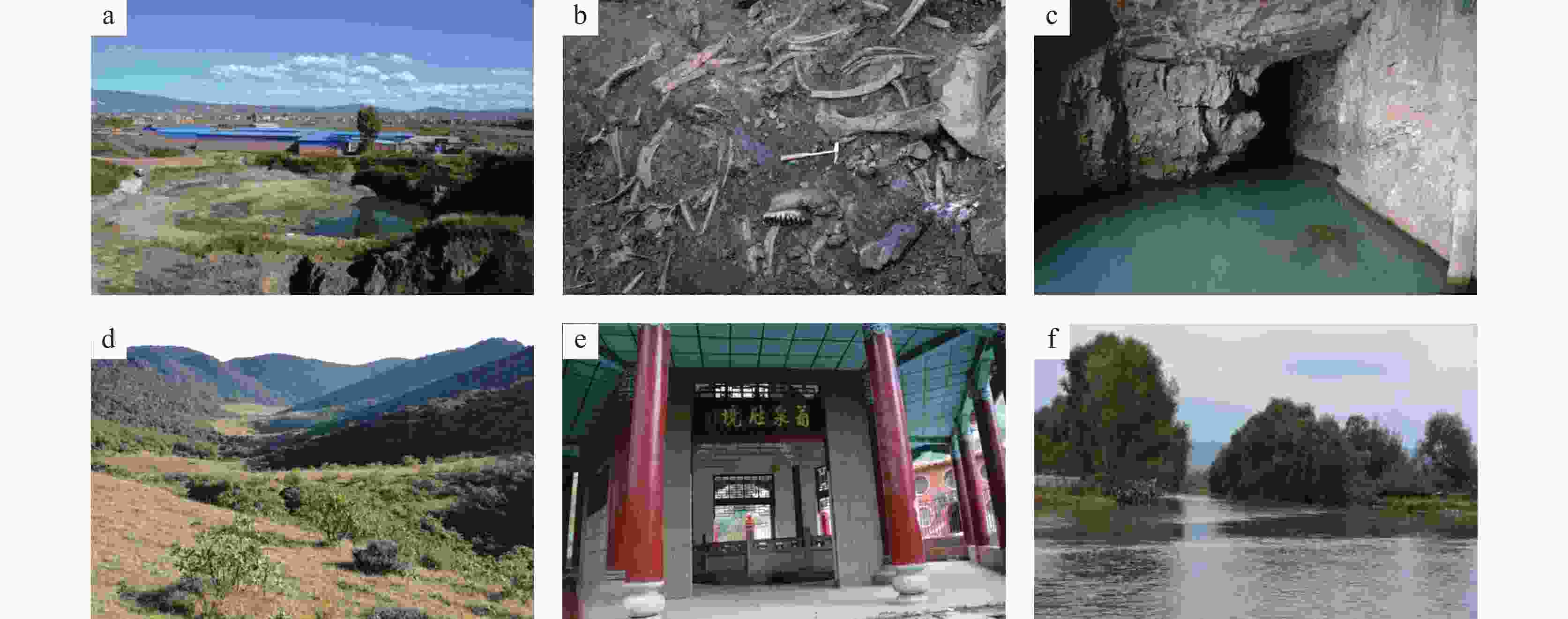 a.昭通盆地南部煤化石遗迹,蓝色房子为养殖场,地层由灰黑色厚层褐煤与深灰色粉砂质泥岩组成,遗迹长127 m,宽116 m b.褐煤层中剑齿象化石埋藏状态(水塘坝) c.大龙洞中的水潭及潭中石灰岩块,可能为洞顶掉落(北闸镇大龙洞公园内,小洞洞口宽约2 m) d.昭通盆地东缘岩溶地貌中的峰丛洼地和串珠状分布的落水洞(昭阳区小龙洞乡大咀口村附近) e.昭通盆地西部昭鲁河边的葡萄井(昭阳区旧圃镇) f.昭通盆地西部洒渔河谷地(昭鲁河与冷水河交汇形成洒渔河)