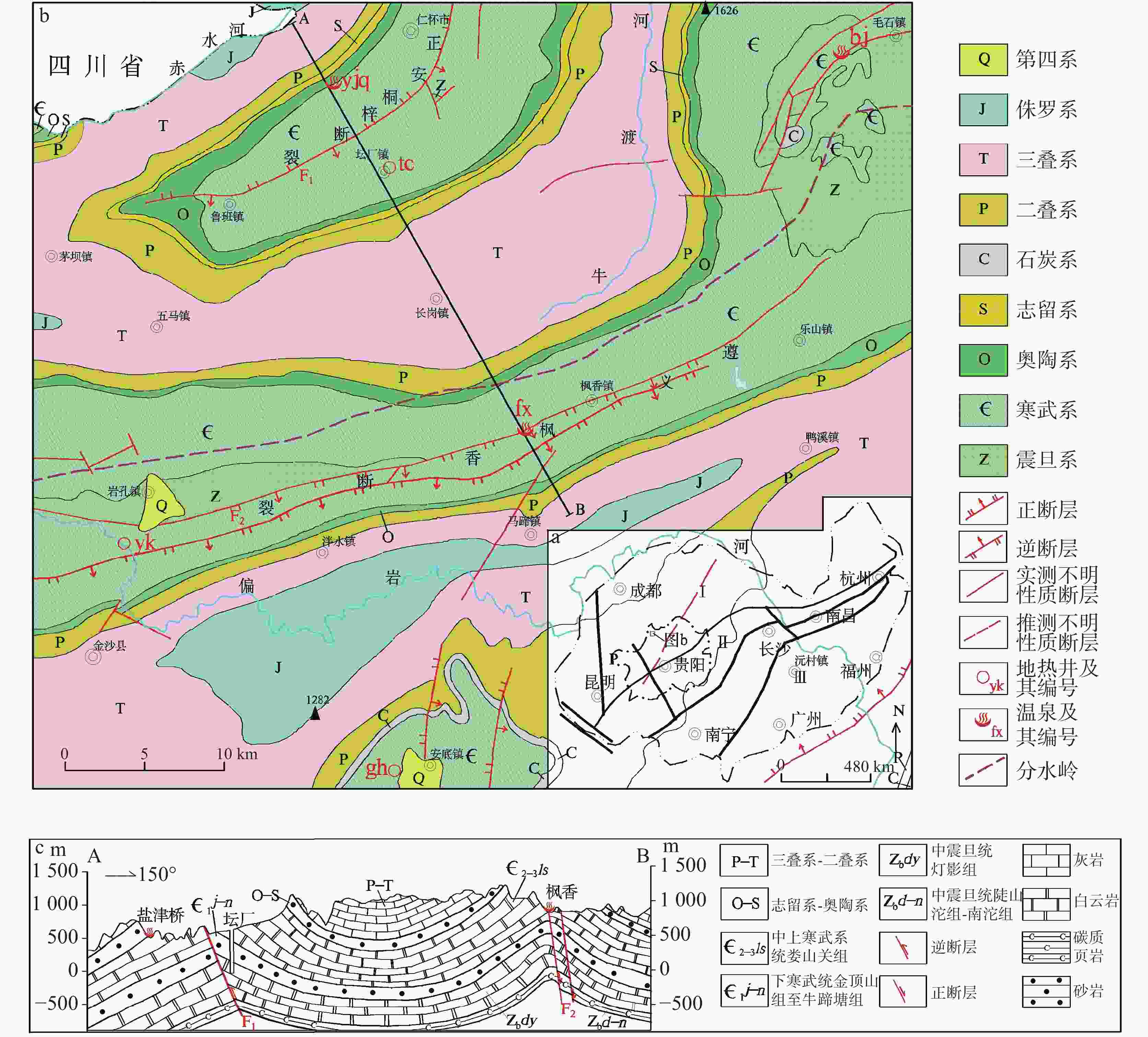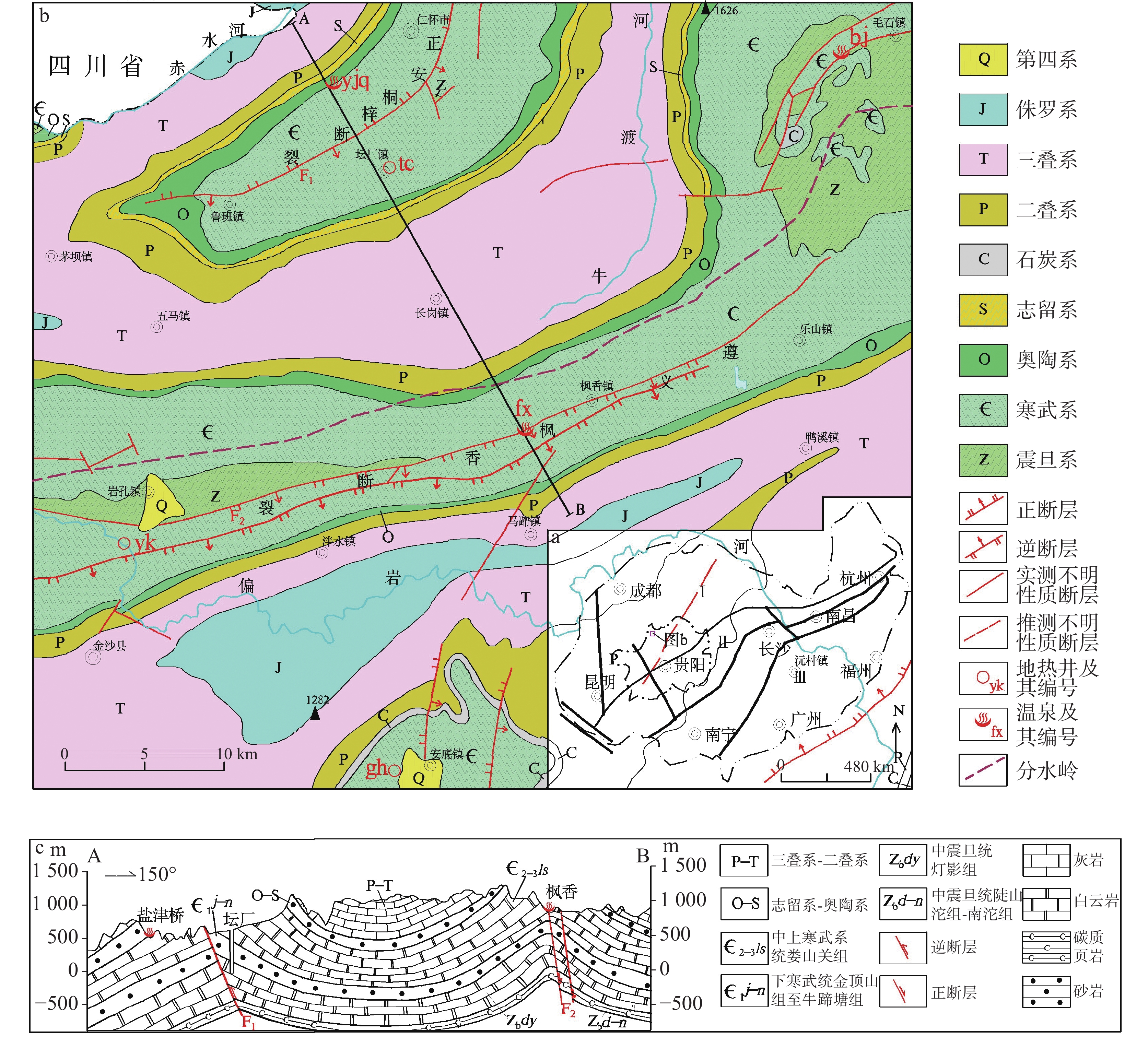 图 1 区域大地构造位置图(a:据文献[15]修改)、黔北遵义地区水文地质图(b:据文献[3]修改)及简易水文地质剖面图(c)