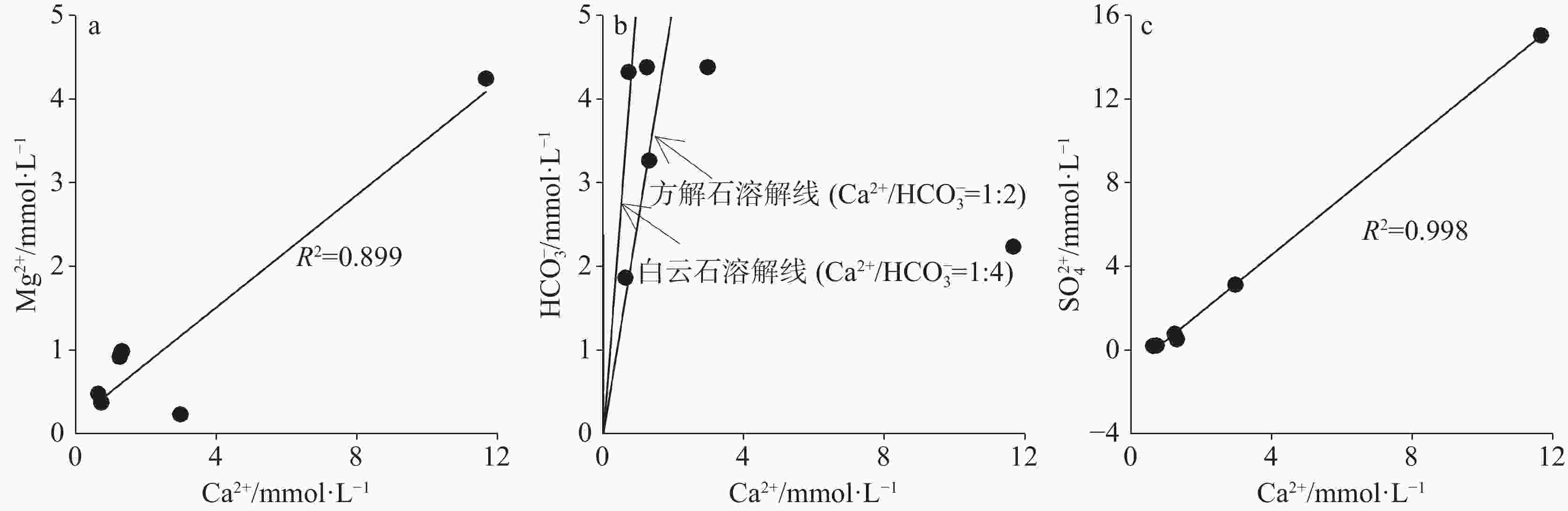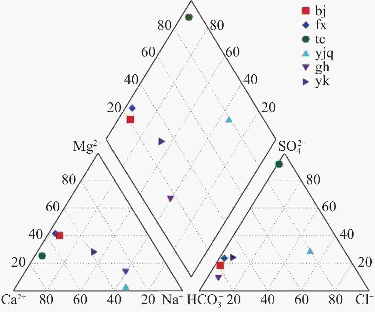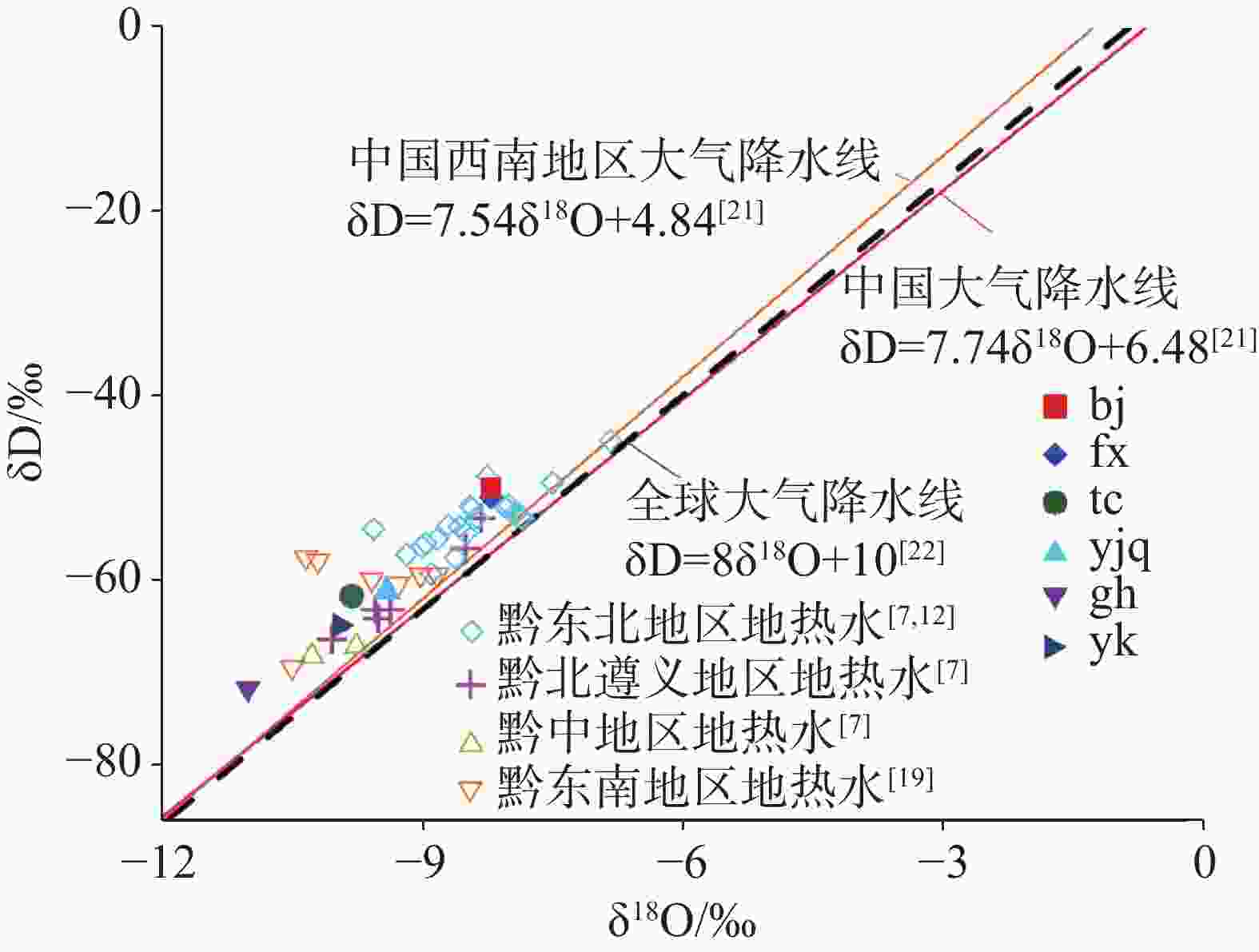 温泉名称 芭蕉温泉 盐津桥温泉 坛厂地热井 岩孔地热井 桂花地热井 枫香温泉 水样编号 bj yjq tc yk gh fx pH 7.63 7.38 7.30 7.83 7.95 7.43 F−/mg·L−1 0.12 0.67 1.75 2.34 6.82 0.32 Cl−/mg·L−1 2.38 384.38 12.37 17.10 11.96 4.12 ${\rm{NO}}_3^{-}$/mg·L−1 3.06 2.87 − − 2.15 4.95 ${\rm{SO}}_4^{2-}$/mg·L−1 21.13 301.60 1 449.01 75.72 23.19 50.86 ${\rm{HCO}}_3^{-}$/mg·L−1 114.11 267.88 136.68 267.88 264.22 199.54 Na+/mg·L−1 3.84 273.09 34.08 50.06 73.37 4.27 K+/mg·L−1 0.85 28.57 9.65 7.53 7.96 1.41 Mg2+/mg·L−1 11.70 5.68 103.29 22.42 9.16 24.10 Ca2+/mg·L−1 24.98 118.67 467.04 49.55 28.87 52.06 TDS/mg·L−1 187.95 1 448.88 2 322.74 514.77 439.66 353.19 H2SiO3/mg·L−1 21.91 55.28 37.65 44.92 47.08 27.81 Sr/μg·L−1 82.81 12 488.14 9 120.96 1 225.69 1 028.67 310.13 Li/μg·L−1 0.39 66.70 44.80 130.00 85.80 5.73 δDV-SMOW/‰ −49.97 −61.18 −61.74 −65.34 −72.10 −50.98 δ18OV-SMOW/‰ −8.24 −9.37 −9.85 −9.94 −11.03 −8.23 注:${\rm{CO}}_3^{2-}$低于检测限(5 mg·L−1)未列出,−表示低于检测限。