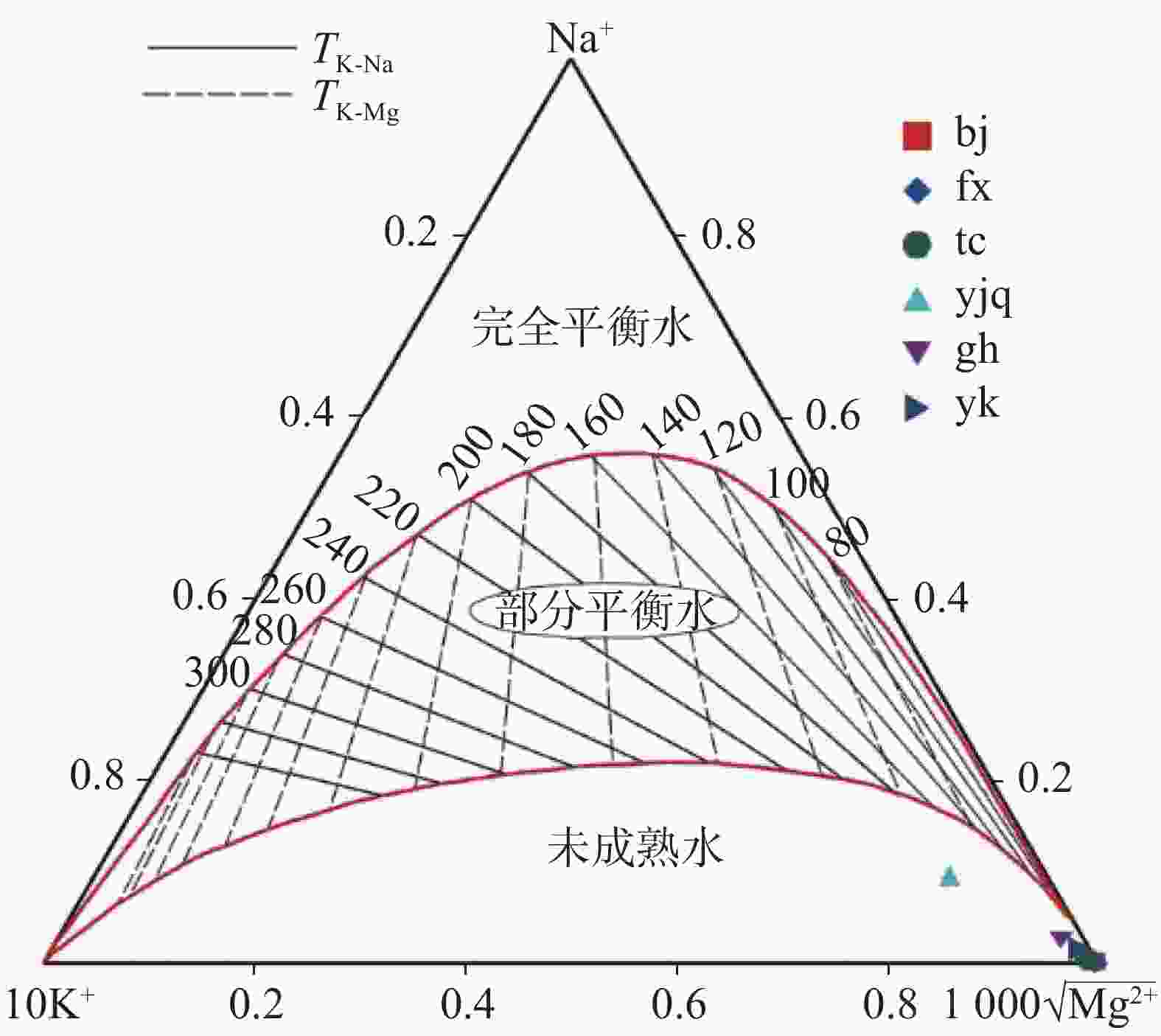 温泉名称 水样编号 水温/ ℃ 计算热储温度/ ℃ 估算热储温度/ ℃ 公式(5) 公式(6) 公式(7) 公式(8) 芭蕉温泉 bj 29 57.06 57.12 63.32 24.82 55~60 枫香温泉 fx 36 66.29 65.99 71.21 34.01 65~70 坛厂地热井 tc 38 78.47 77.96 81.78 46.53 46~78 盐津桥温泉 yjq 44 94.90 94.40 96.14 63.95 64~95 桂花地热井 gh 48 87.89 87.35 90.00 56.45 56~88 岩孔地热井 yk 48 85.87 85.33 88.24 54.31 54~86 注:公式(5):石英温标−无蒸汽分离或混合作用 T(℃)=−42.198+0.28831×SiO2−3.6686×10−4×(SiO2)2+ 3.1665 ×10−7×(SiO2)3+77.034×lg(SiO2);