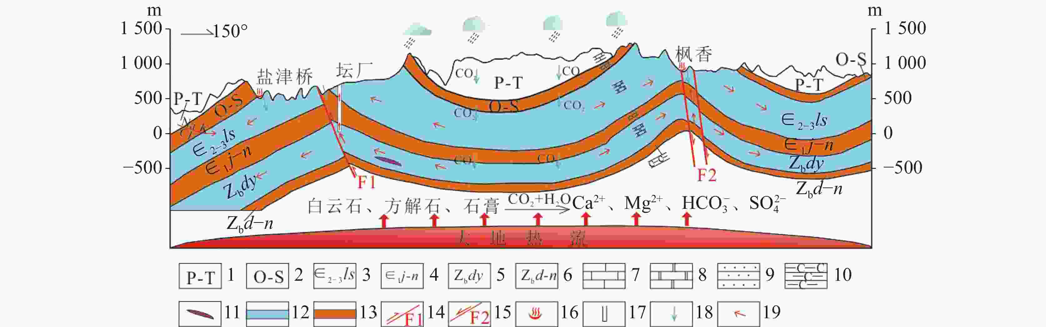 1.二叠系−三叠系 2.奥陶系−志留系 3.中−上寒武统娄山关组 4.下寒武统金顶山组至牛蹄塘组 5.中震旦统灯影组 6.中震旦统陡山沱组−南沱组 7.灰岩 8.白云岩 9.砂岩 10. 碳质页岩 11.膏盐层 12.热储层 13.盖层 14.正安−桐梓逆断裂 15. 遵义−枫香正断裂 16.温泉 17.地热井 18.大气水渗入补给 19.地热水流向