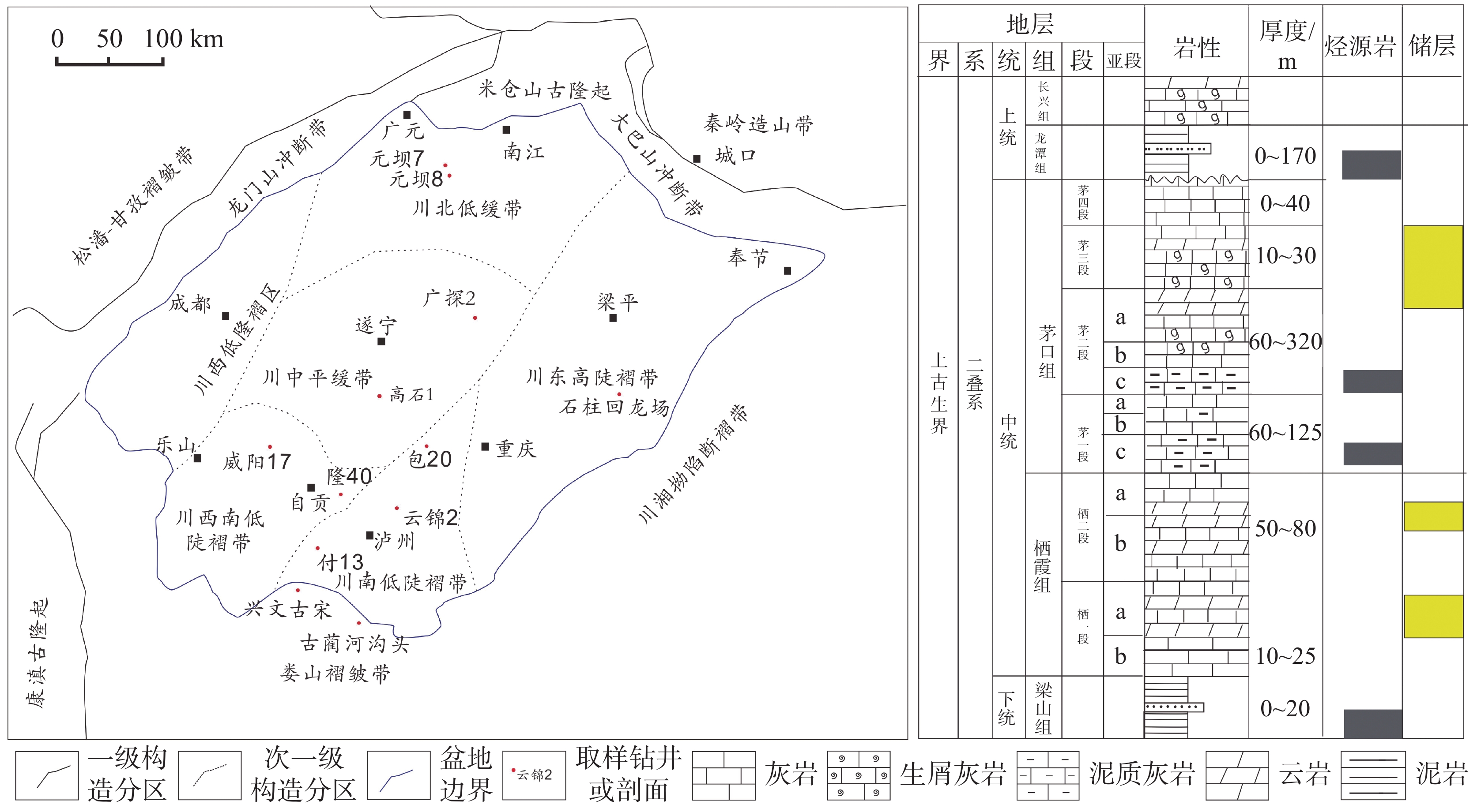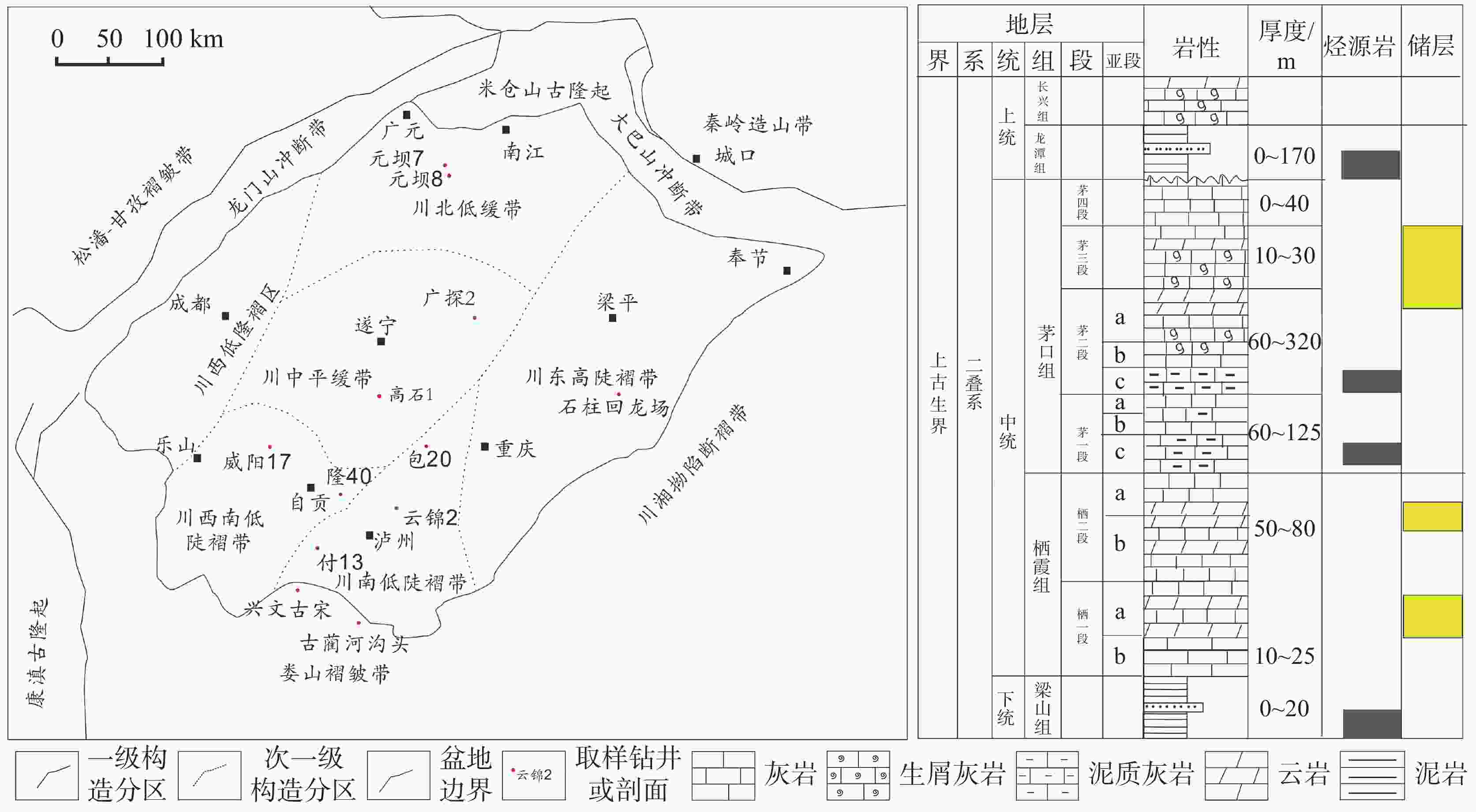 图 1 四川盆地构造分区及二叠系茅口组取样井分布(据[26]有修改)