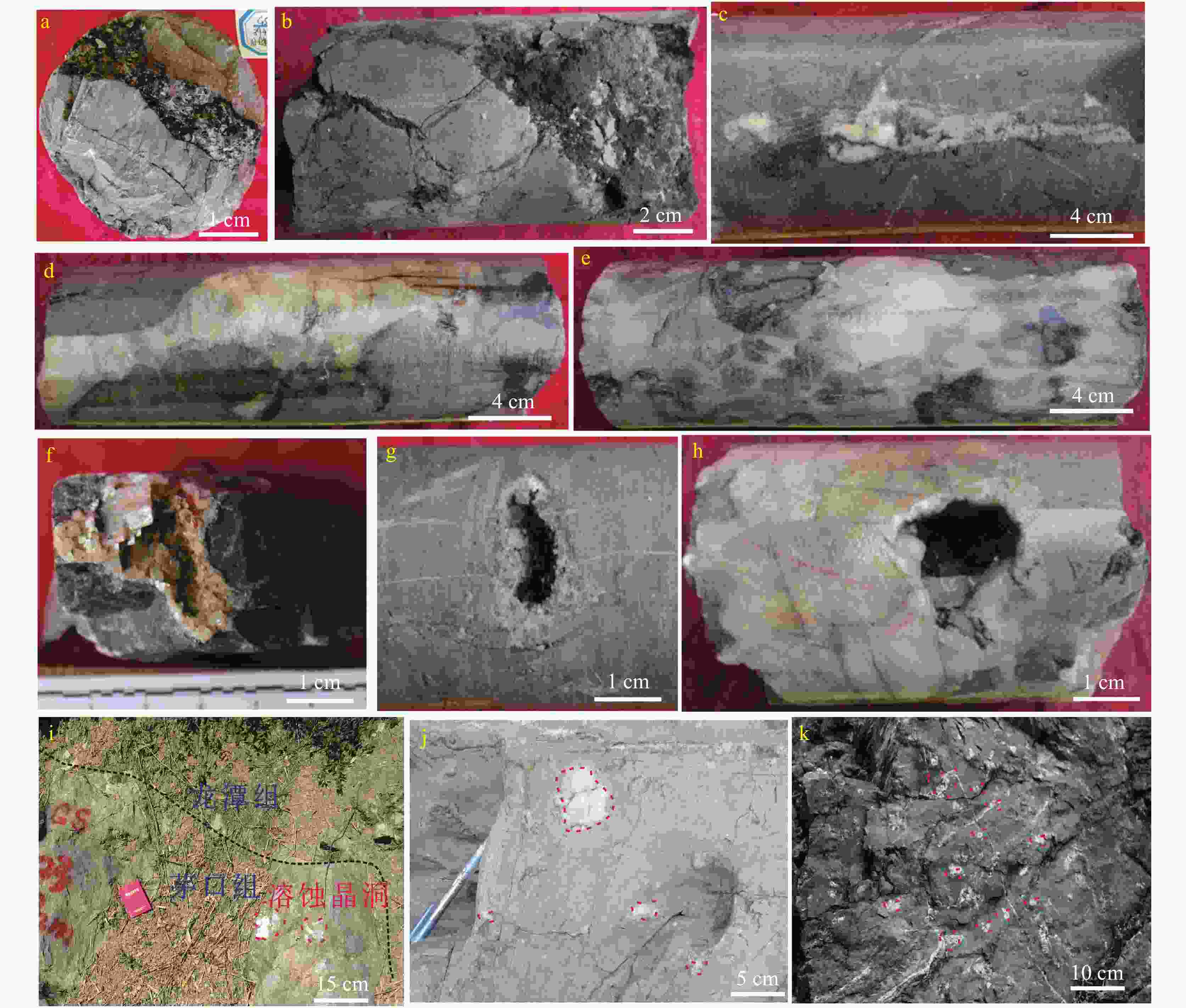 a. 溶缝中方解石和沥青充填,茅四段 3 949.06~3 949.16 m,高石1;b. 构造网裂缝极发育,泥质和方解石充填,茅三段 1 683.06~1 683.18 m,威阳17井;c. 构造高角度缝充填方解石,茅二b ,隆40;d. 扩溶缝,方解石全充填,茅二b,3 652.16~3 652.44 m,包20;e. 扩溶缝,方解石晶体充填,茅二b,3 630.56~3 630.73 m,包20;f. 溶蚀孔洞,方解石晶体半充填,茅三,元坝8;g.溶蚀孔洞,方解石半充填,茅二a,1 722.75~1 723.09 m,威阳17井;h. 溶洞,方解石半充填,茅二b 3 652.75~3 652.84 m,包20;i.不整合面下发育溶洞,方解石充填,茅三,兴文古宋;j.亮晶砂屑灰岩中发育溶蚀孔洞,方解石全充填,茅二a,古蔺河沟头;k. 白云岩内密集发育孔洞,5~8 个·m−1,方解石充填,茅二b,重庆石柱回龙场