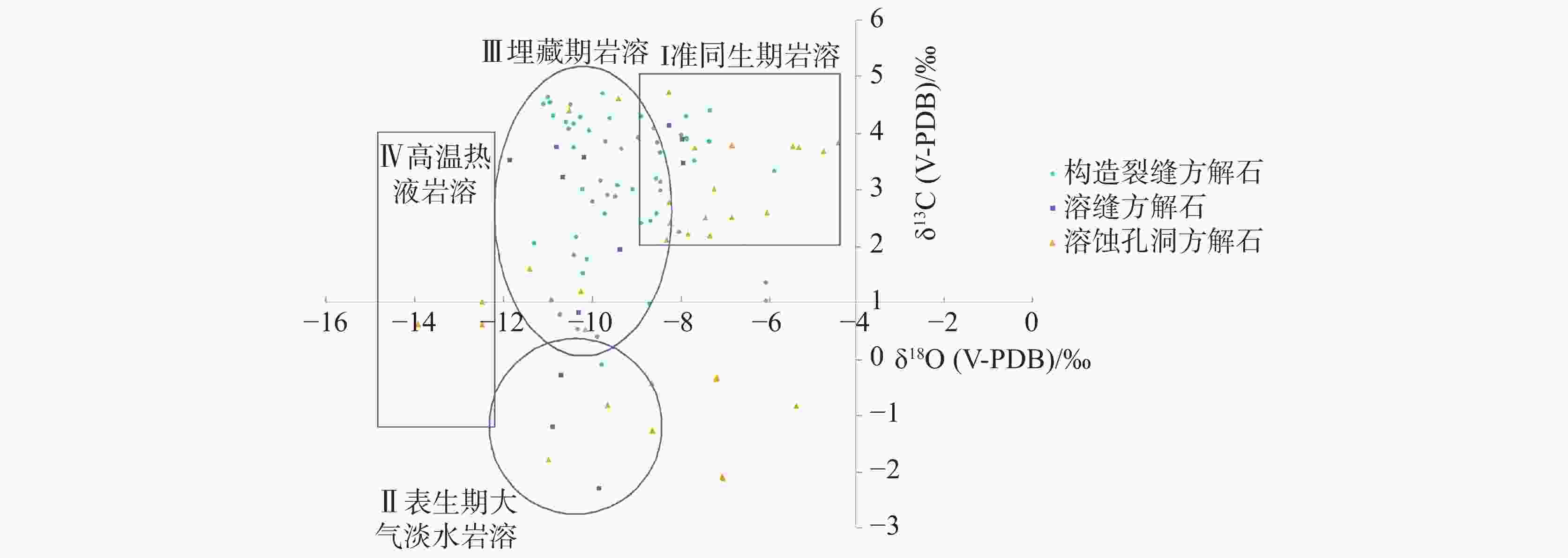 发育期次 形成环境 同位素特征 δ13C(PDB)‰ δ18O(PDB)‰ Ⅰ 准同生期岩溶环境 1.80~3.83 −8.95~−4.11 Ⅱ 表生期大气淡水岩溶环境 <0 −12.00~−9.00 Ⅲ 埋藏期岩溶环境 0~3.83 −12.00~−8.50 Ⅳ 高温热液岩溶环境 / <12.00 -