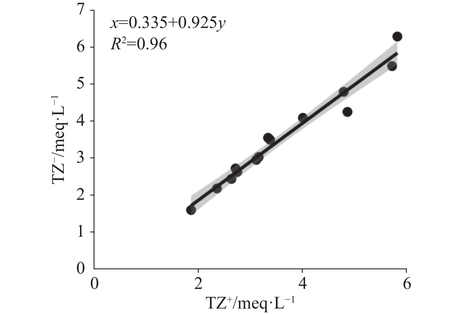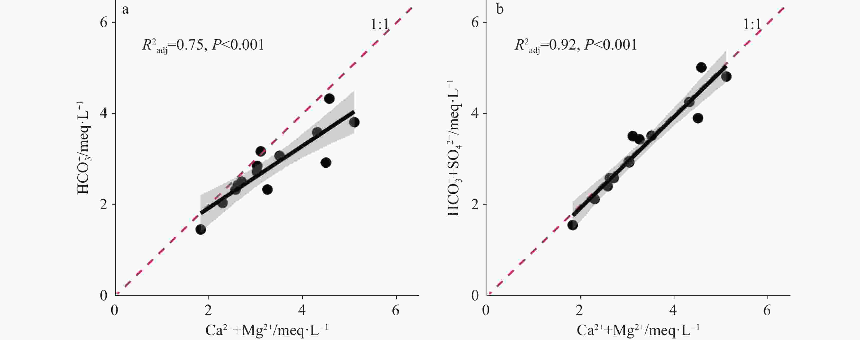 Figure 6. Participation of sulfuric acid in the rock weathering. a: relationship between changes in chemical equivalent concentrations of [(Ca2++Mg2+)/${\rm{HCO}}_3^{-}$]. b: relationship between changes in chemical equivalent concentrations of [(Ca2++Mg2+)/(${\rm{HCO}}_3^{-}$+${\rm{SO}}_4^{2-}$)]