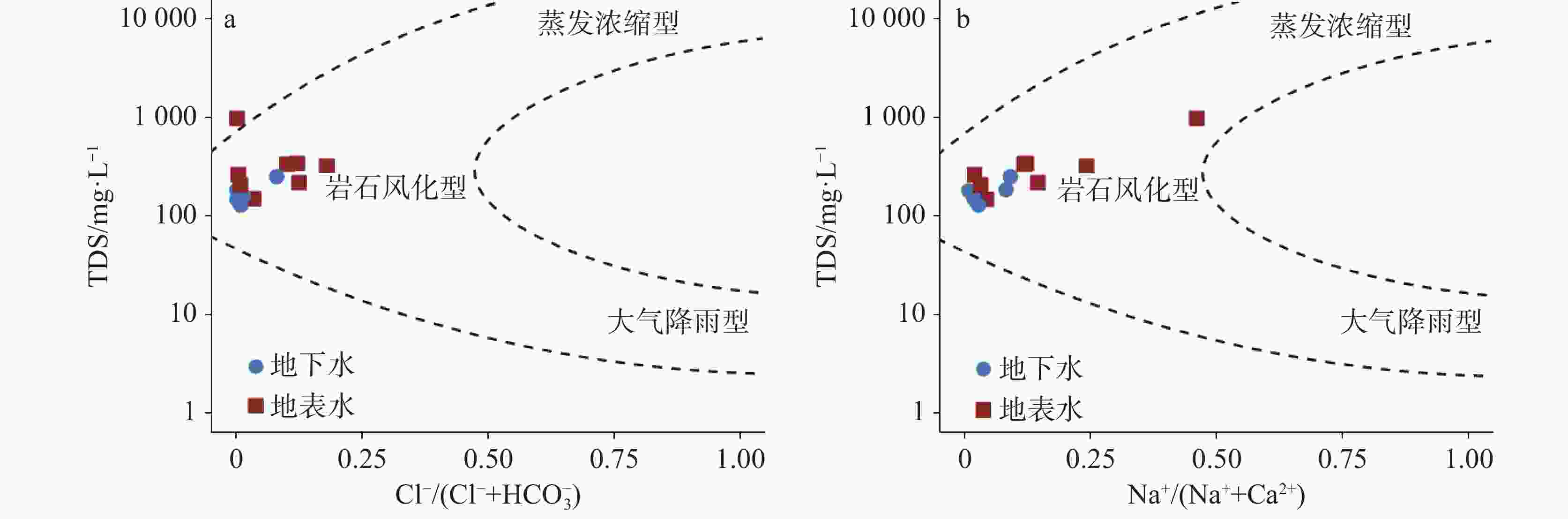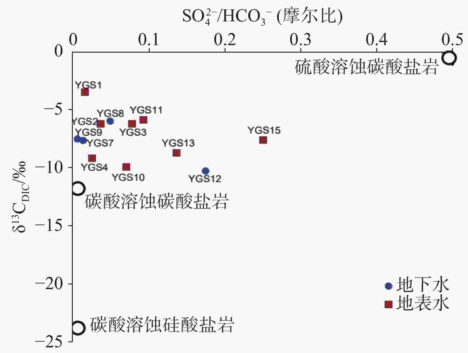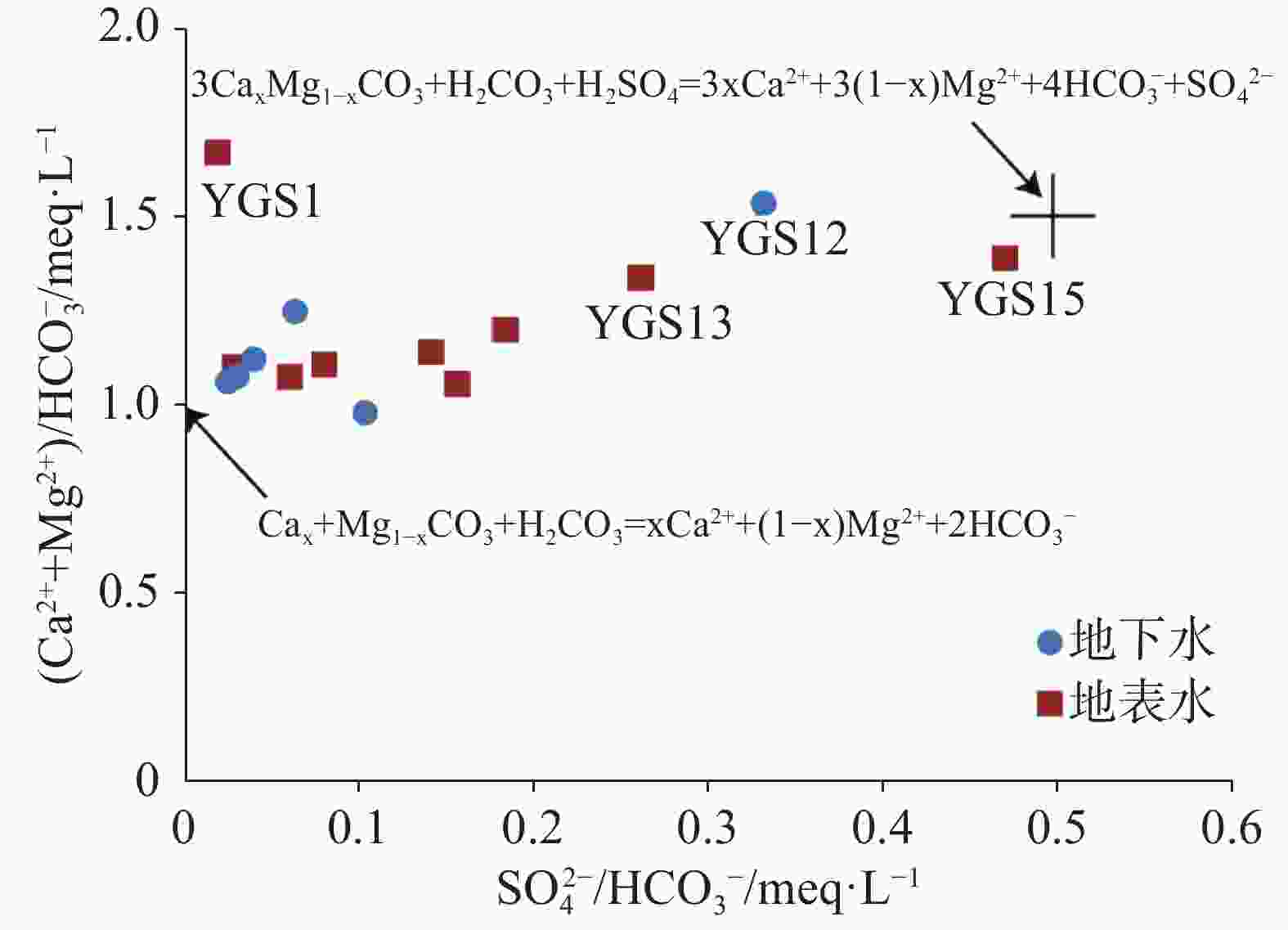 图 6 硫酸参与漾弓江流域岩石风化的证据 a:(Ca2++Mg2+)/${\rm{HCO}}_3^{-}$化学当量浓度的变化关系;b:(Ca2++Mg2+)/(${\rm{HCO}}_3^{-}$+${\rm{SO}}_4^{2-}$)化学当量浓度的变化关系