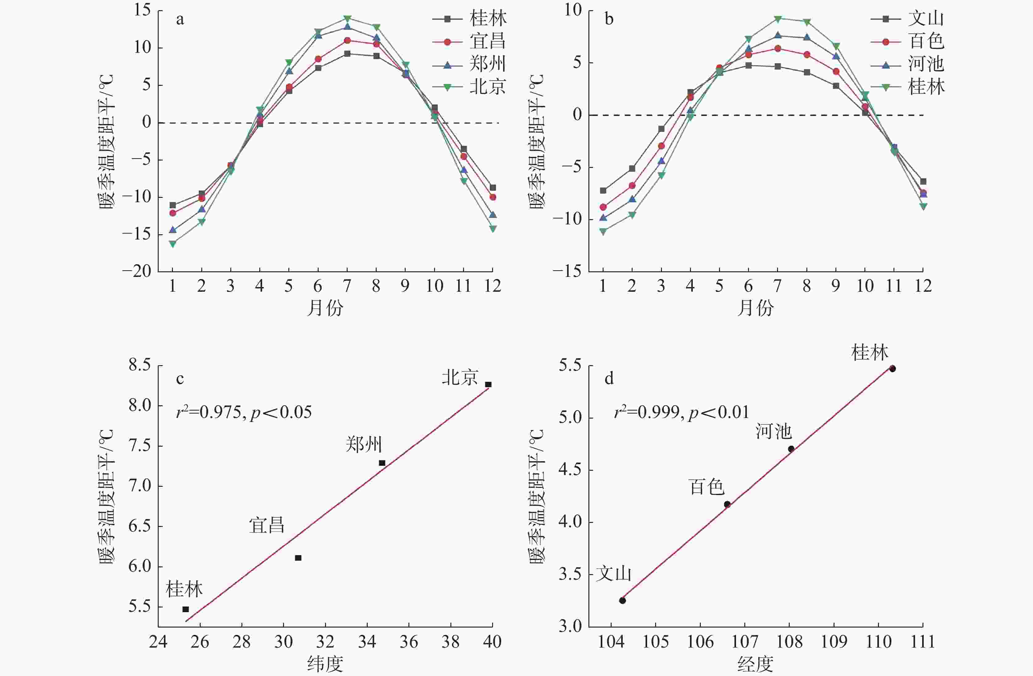 洞穴多年平均气温/ ℃ 当地多年平均气温/ ℃ 内外温度差值/ ℃ 纬度 −0.658** −0.794** 0.367* 经度 0.149 −0.034 0.345* 洞穴海拔高度/m −0.511** −0.396** −0.149 洞穴长度/m 0.044 −0.157 0.338* 洞穴上覆基岩厚度/m 0.172 0.167 −0.028 洞顶年均植被指数 −0.396** −0.335* −0.066 注:*表示两种因子的相关性达到显著水平(P<0.05);**表示两种因子的相关性达到极显著水平(P<0.01)。