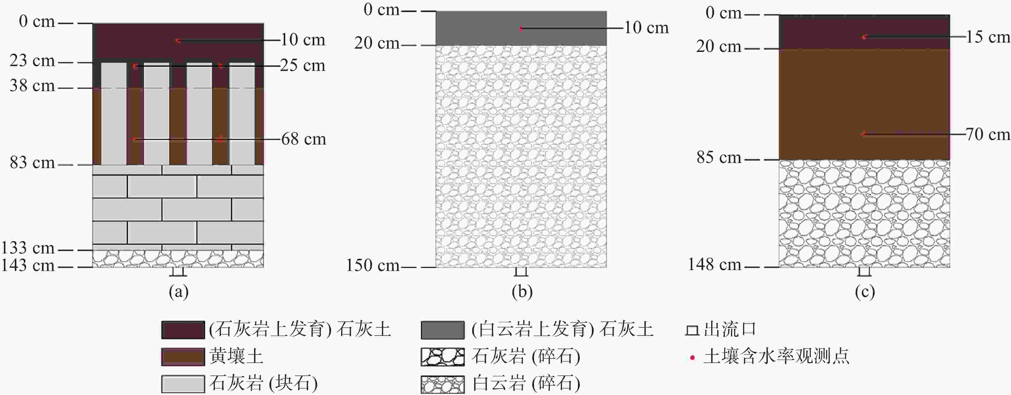土柱 分层特征 土壤占比/% 土壤容重/g·cm−3 岩石裂隙率/% 渗透系数(10−3) cm/·s−1 a ① 0~23 cm (石灰岩上发育)石灰土 100 1.34 − 0.815 ② 23~38 cm 石灰土—岩块 20 1.34 − 13.7* ③ 38~83 cm 黄壤土—岩块 20 1.25 − 13.7* ④ 83~133 cm 岩块 − − 8 18.9 ⑤ 133~143 cm 反滤层(碎石) − − 25 4.79 b ① 0~20 cm (白云岩上发育)石灰土 100 1.00 − 3.14 ② 20~150 cm 白云岩(碎石) − − 40 17.8 c ① 0~15 cm (石灰岩上发育)石灰土 100 1.34 − 0.815 ② 15~85 cm 黄壤土 100 1.25 − 0.0221 ③ 85~148 cm 石灰岩(碎石) − − 12.1 21.3 注:*23~83 cm层在注水实验中测出的渗透系数值。