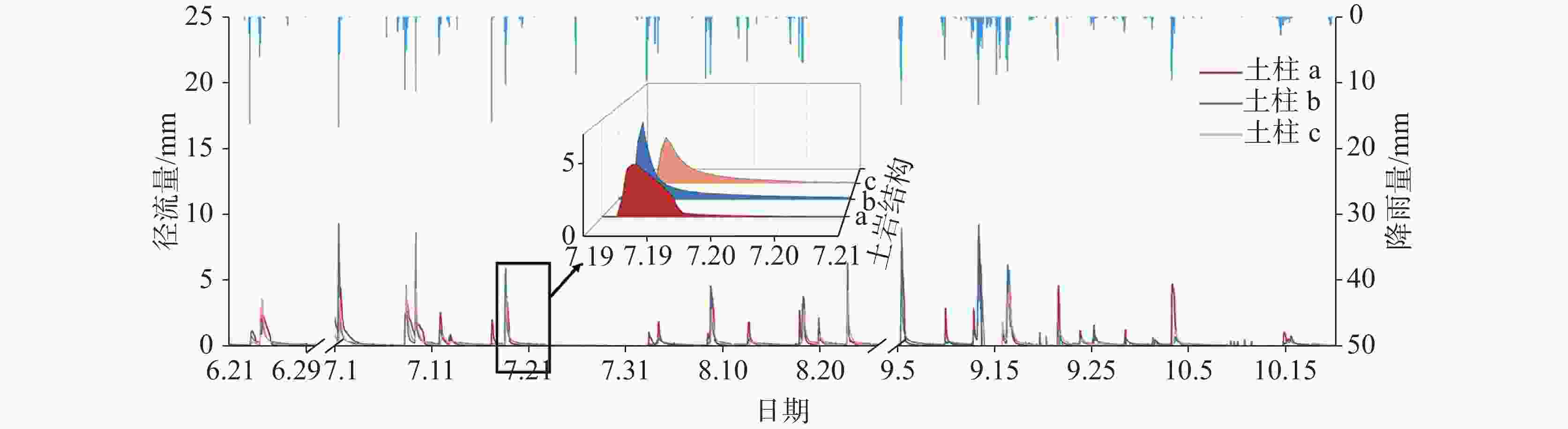 This study was conducted at the Puding Karst Ecosystem Research Station, Chinese Academy of Sciences. Three square columns were set up in the experiment to simulate different soil-rock structures. Each column has a cross-sectional area of 1 square meter and a height of 2 meters. The station is located in a warm, humid mid-subtropical monsoon climate zone, with an average annual rainfall of 1,315 mm and an average annual temperature of 15.1 ℃. The soil-rock structures in this area are diverse, mainly comprising limestone, dolomite, and associated soils. This study aims to reveal the impact of complex soil-rock structures on hydrological processes in the karst areas of Southwest China. In this study, physical models of three typical soil-rock structures (Column a: thin limestone soil over limestone blocks; Column b: thin limestone soil over dolomite gravel; Column c: thick soil over limestone gravel) were constructed, the underground runoff processes formed by natural rainfall were observed, and the water balance and runoff response characteristics under different soil-rock structures were compared. The research findings provide scientific insights into better understanding of the transformation and effective utilization of water resources in karst areas. Three square columns were used as experimental devices in this study to simulate different types of soil-rock structures (combinations of limestone, dolomite, overlying lime soil, and yellow soil). During natural rainfall events, evaporation and runoff of the soil columns with different soil-rock structures were compared and analyzed. Various methods of statistical analysis were employed to quantitatively assess the impact of these structures, revealing the hydrological processes of the complex soil-rock structures in epikarst zones. The main results are as follows. (1) Water Balance: As soil thickness increased (20 cm, 23 cm, 85 cm), evaporation increased and runoff decreased. Dolomite gravel (Column b) retained more water than limestone blocks (Column a), leading to higher evaporation and lower runoff. Seasonal runoff variability was significant in areas covered with thinner soil, in which flood and drought are prone to occur. (2) Rainfall-Runoff Relationship: Linear regression revealed a threshold-linear two-stage pattern. Runoff started after reaching a threshold, becoming linear beyond that. The increase of soil thickness raised the rainfall threshold for runoff formation. Column a had the highest runoff efficiency, while Column c had the lowest. The specific surface area of the gravel in Column b is larger, so its evaporation is twice as much as that of Column a, and the regression slope is lower. (3) Impact of Rainfall Patterns: Small-event rainfall (Patterns B and D) caused higher peaks in Column a, while large-event rainfall (Patterns A and C) caused higher peaks in Column b. Thicker soil in Column c delayed initial runoff and peak flow, especially in small events. Additionally, the initial runoff response time of soil-rock structures with thin soil layers depends on the rainfall process, while the initial runoff response time of soil-rock structures with thick soil layers is negatively correlated with soil moisture content. This study reveals the significant impact of different soil-rock structures on hydrological processes in the karst areas of Southwest China. The physical properties of soil-rock structures (e.g., soil thickness and characteristics of underlying rocks) not only affect the water balance but also determine the rainfall-runoff relationship and runoff characteristics under different rainfall patterns. Firstly, the soil layer thickness is a key factor influencing water balance and underground runoff response. Thicker soil can significantly delay the response time of underground runoff, reduce peak flow, and increase the rainfall threshold required for runoff generation. Additionally, the physical properties of rock fractures affect the water balance, with dolomite gravel under the soil having a higher water retention capacity than limestone blocks, leading to higher evaporation losses and lower runoff. Lastly, the response of water balance and underground runoff to different rainfall patterns varies significantly with soil-rock structures. Low-fracture limestone blocks beneath the soil (fracture porosity of 8%) have high water conductivity, allowing small rainfall to easily infiltrate and form substantial peak flows. In contrast, dolomite gravel beneath the soil, with a higher water storage capacity (fracture porosity of 40%), facilitates the accumulation of infiltrated water during heavy rainfall, leading to larger peak flows. -