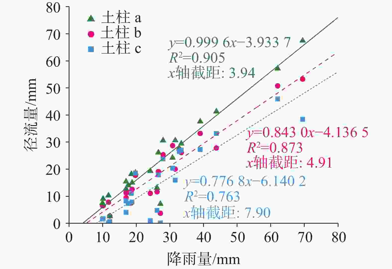 次径流深/mm 次洪峰流量/mm 次初始径流响应时间/h 次洪峰响应时间/h $ {R}_{a} $ $ {R}_{b} $ $ {R}_{c} $ $ {Q}_{m,a} $ $ {Q}_{m,b} $ $ {Q}_{m,c} $ $ {T}_{0,a} $ $ {T}_{0,b} $ $ {T}_{0,c} $ $ {T}_{m,a} $ $ {T}_{m,b} $ $ {T}_{m,c} $ $ P $ 0.873** 0.871** 0.817** 0.686** 0.683** 0.684** −0.201 −0.043 −0.115 −0.160 −0.324 −0.615** $ T $ 0.322 0.265 0.194 0.085 −0.009 −0.040 0.530** 0.690** 0.409 0.213 0.325 0.384 $ I $ 0.140 0.186 0.239 0.243 0.396 0.281 −0.676** −0.685** −0.318 −0.302 −0.484* −0.590** $ {P}_{m} $ 0.375 0.516* 0.458* 0.339 0.557* 0.378 −0.523** −0.438** −0.356 −0.334 −0.570* −0.794** $ {S}_{w,a} $ 0.283 0.558* −0.150 −0.137 $ {S}_{w,b} $ 0.118 0.355 0.083 0.072 $ {S}_{w,c} $ 0.247 0.447 −0.626* 0.004 注:**表示在0.01水平(双侧)上显著相关;*表示在0.05水平(双侧)上显著相关。