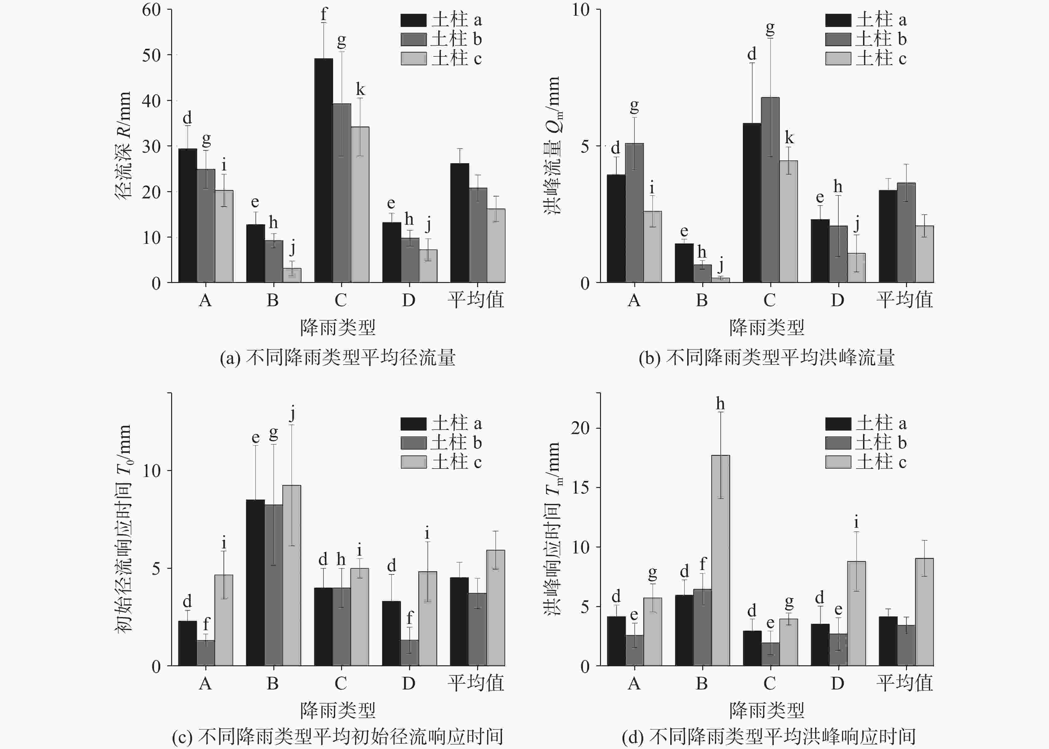 统计指标 指标符号 单位 变化范围 次降雨量 $ P $ mm 10.0~69.4 降雨历时 $ T $ h 2~40 降雨强度 $ I $ mmh−1 0.43~8.50 最大1 h雨量 $ {P}_{m} $ mm 0.6~16.8 土壤初始含水率 $ {S}_{w} $ − 0.178~0.365 径流深 $ R $ mm 0.33~67.37 洪峰流量 $ {Q}_{m} $ mm 0.04~9.26 初始径流响应时间 $ {T}_{0} $ h 0.1~18.0 洪峰响应时间 $ {T}_{m} $ h 0.1~25.0 表 4 不同降雨类型特征指标均值