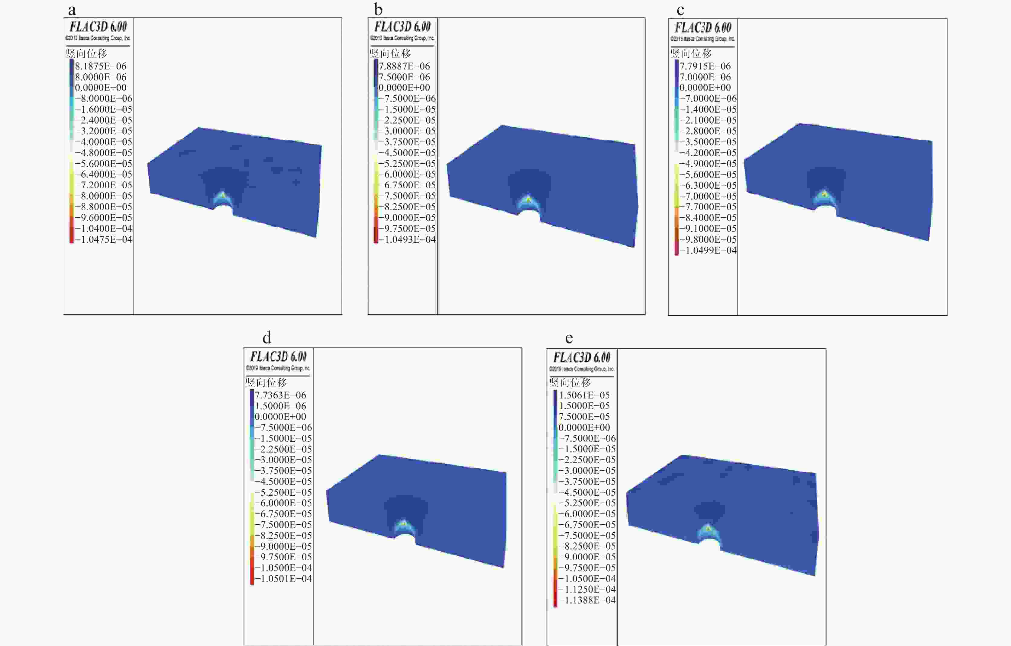 图  15  不同排水速率下竖向位移分布图 (a)排水速率为2.08×10−4 m·s−1; (b)排水速率为2.78×10−4 m·s−1; (c)排水速率为4.17×10−4 m·s−1; (d)排水速率为8.34×10−4 m·s−1 ;(e)排水速率为4.17×10−3 m·s−1