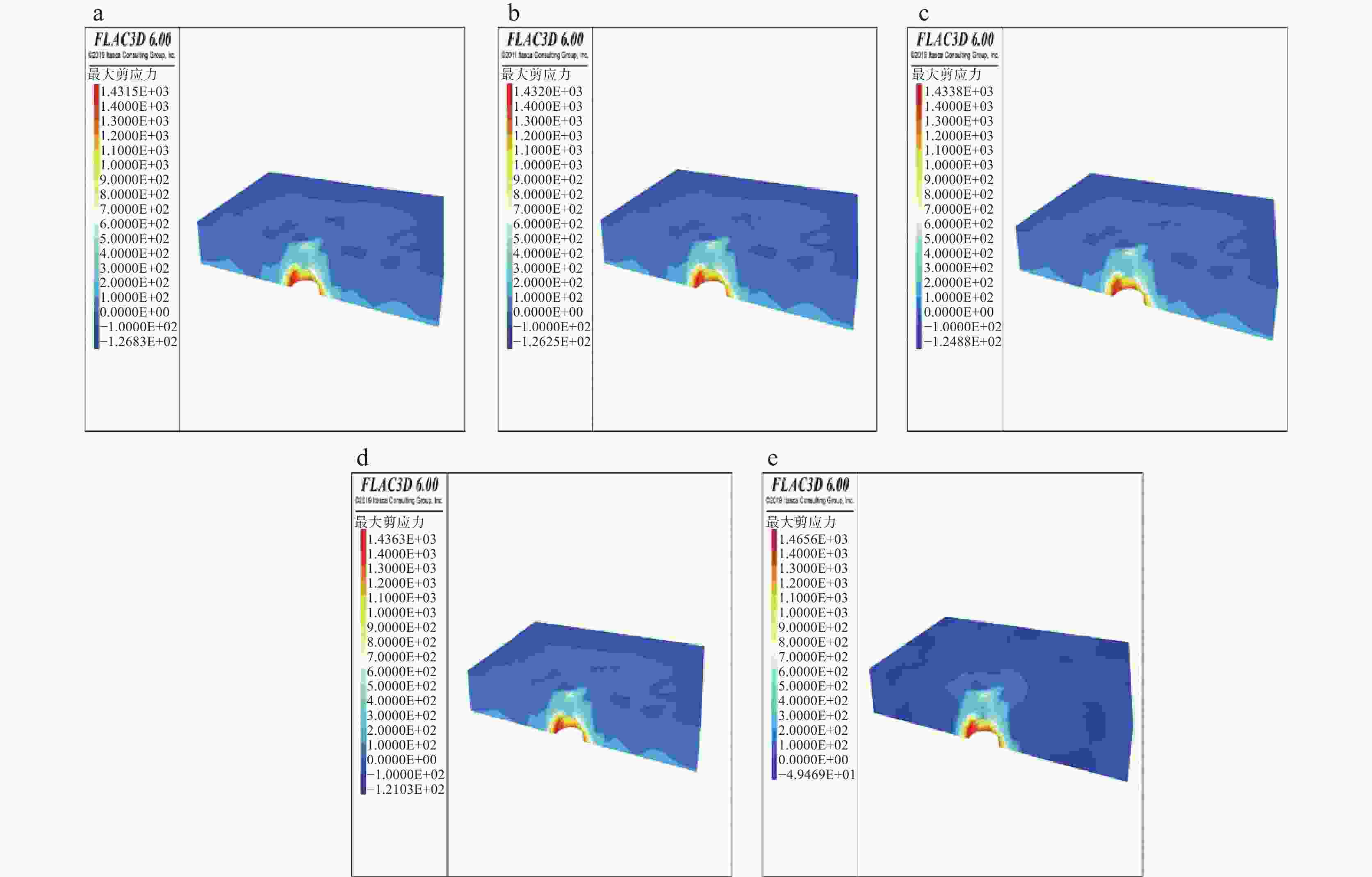 图  16  不同排水速率下最大剪应力分布图 (a)排水速率为2.08×10−4 m·s−1; (b)排水速率为2.78×10−4 m·s−1; (c)排水速率为4.17×10−4 m·s−1; (d)排水速率为8.34×10−4 m·s−1 ; (e)排水速率为4.17×10−3 m·s−1