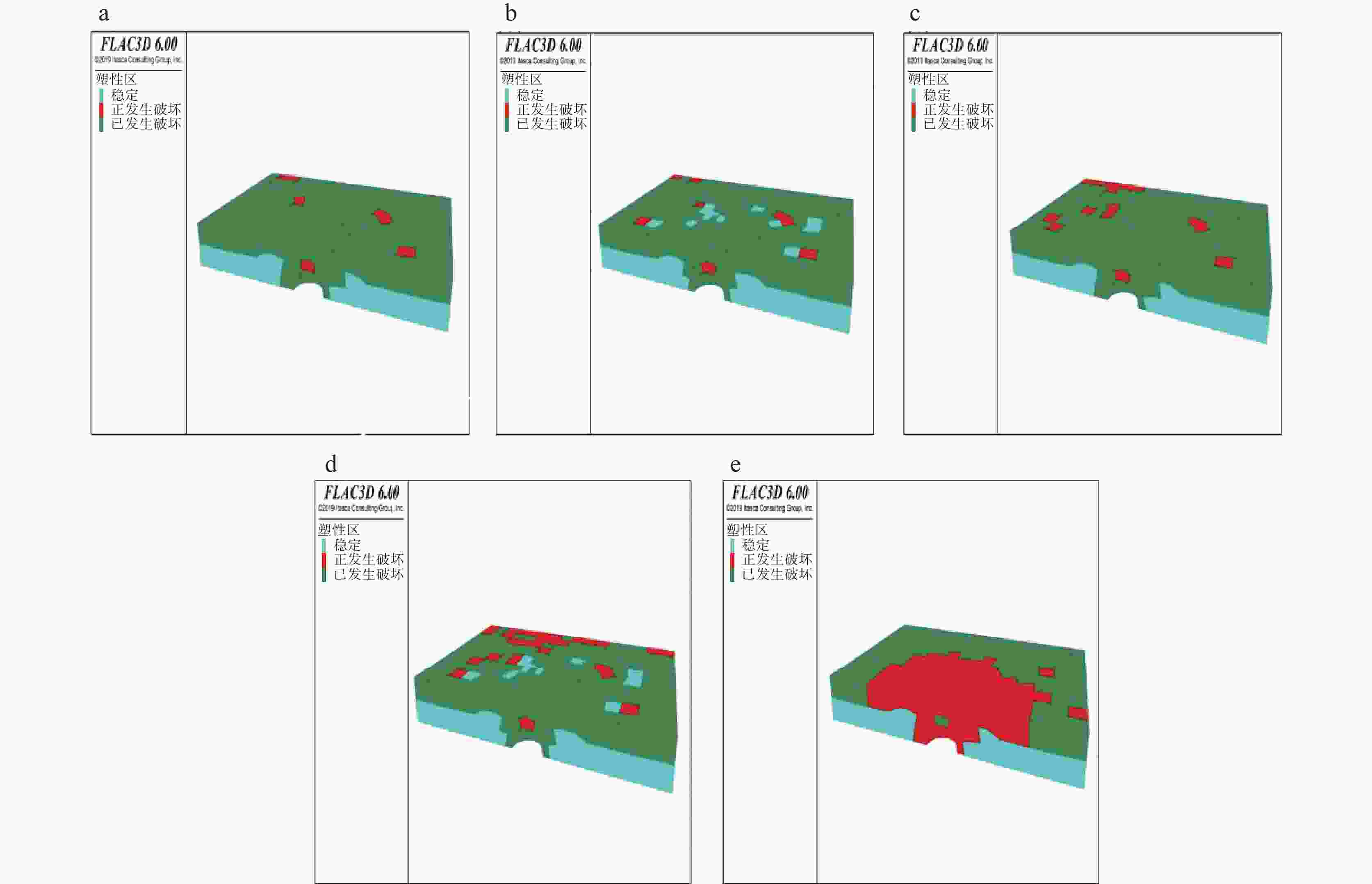 图  17  不同排水速率下塑性区分布图 (a)排水速率为2.08×10−4 m·s−1; (b)排水速率为2.78×10−4 m·s−1; (c)排水速率为4.17×10−4 m·s−1; (d)排水速率为8.34×10−4 m·s−1 ; (e)排水速率为4.17×10−3 m·s−1