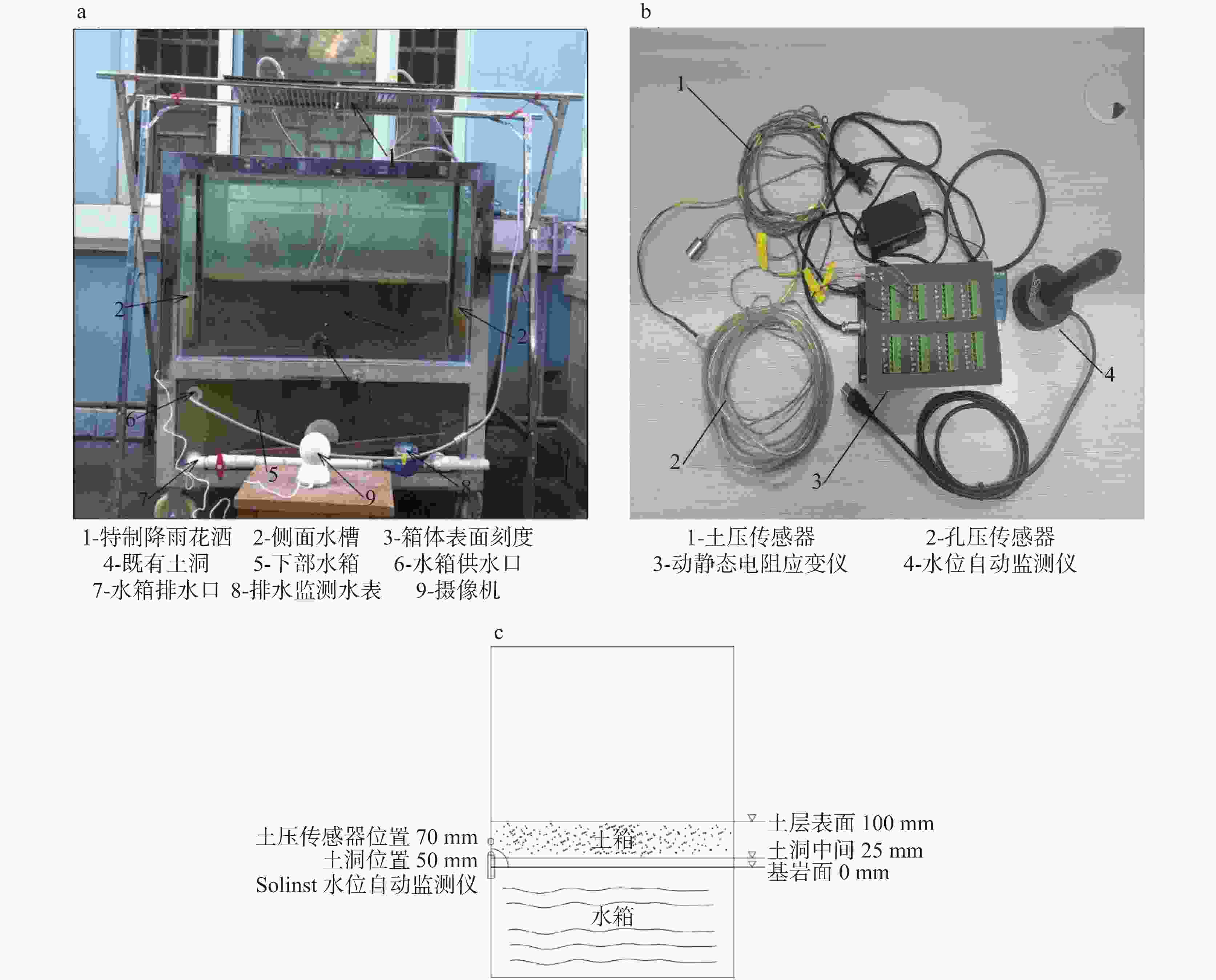 图  3  模型装置及测量设备图(a)模型装置正面图(b)测量设备图(c)模型装置剖面图