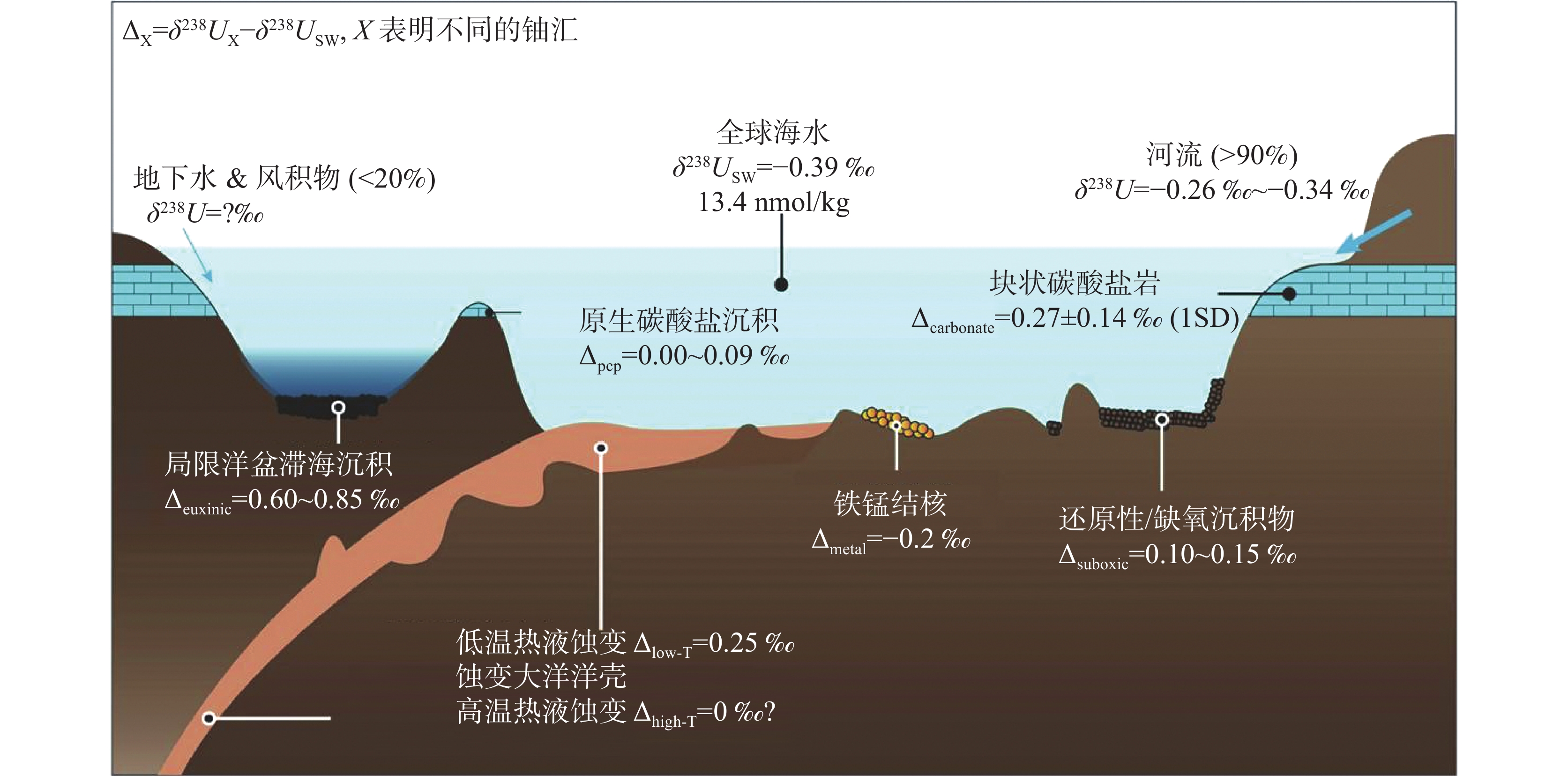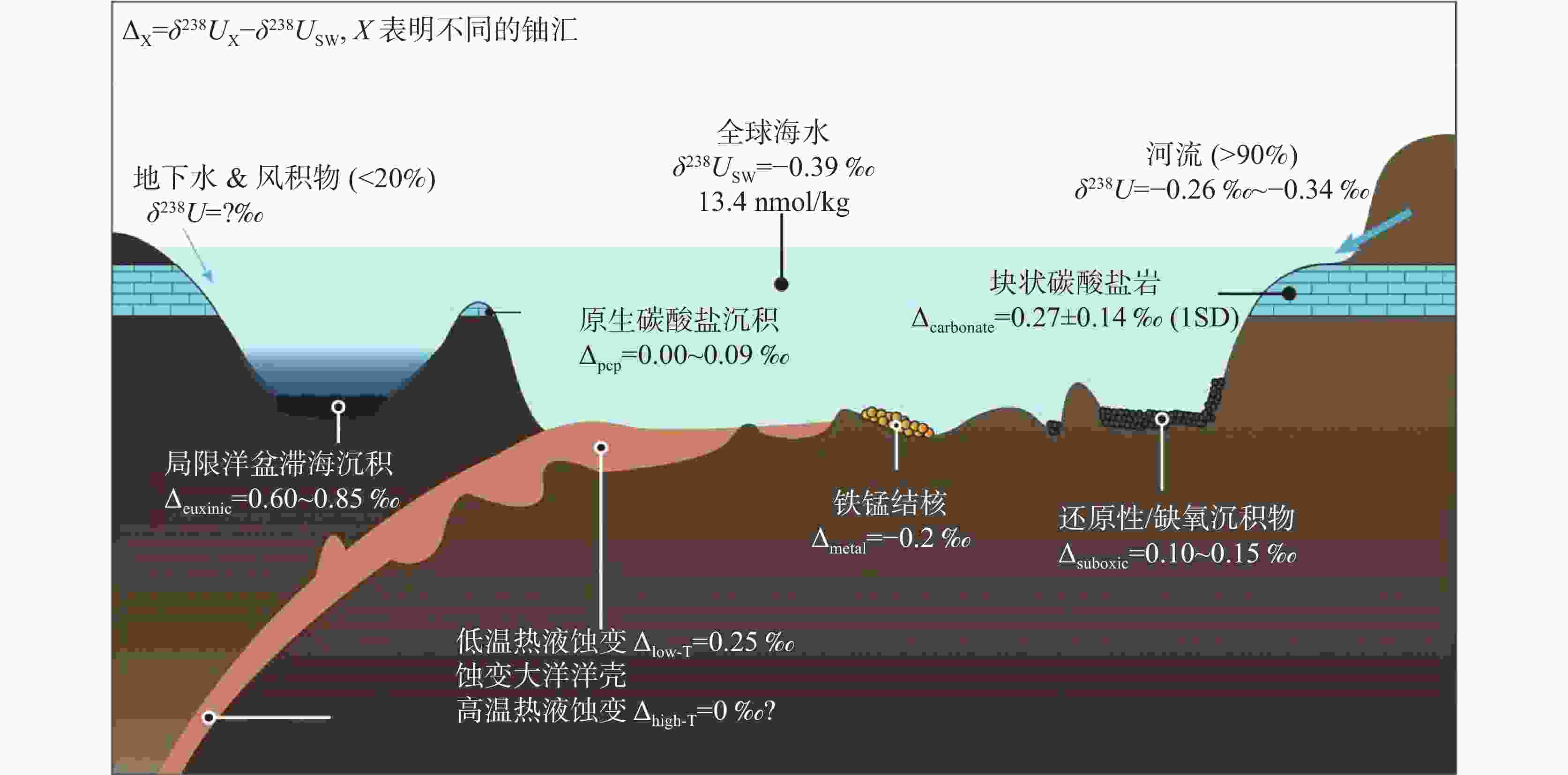 图 1 海洋中铀同位素平衡模型(海洋中主要的溶解铀来源于陆地河流,海洋铀会包括还原性/缺氧沉积物、局限性滞海洋盆沉积、海相碳酸盐、铁锰结核及蚀变大洋洋壳)(据[59])