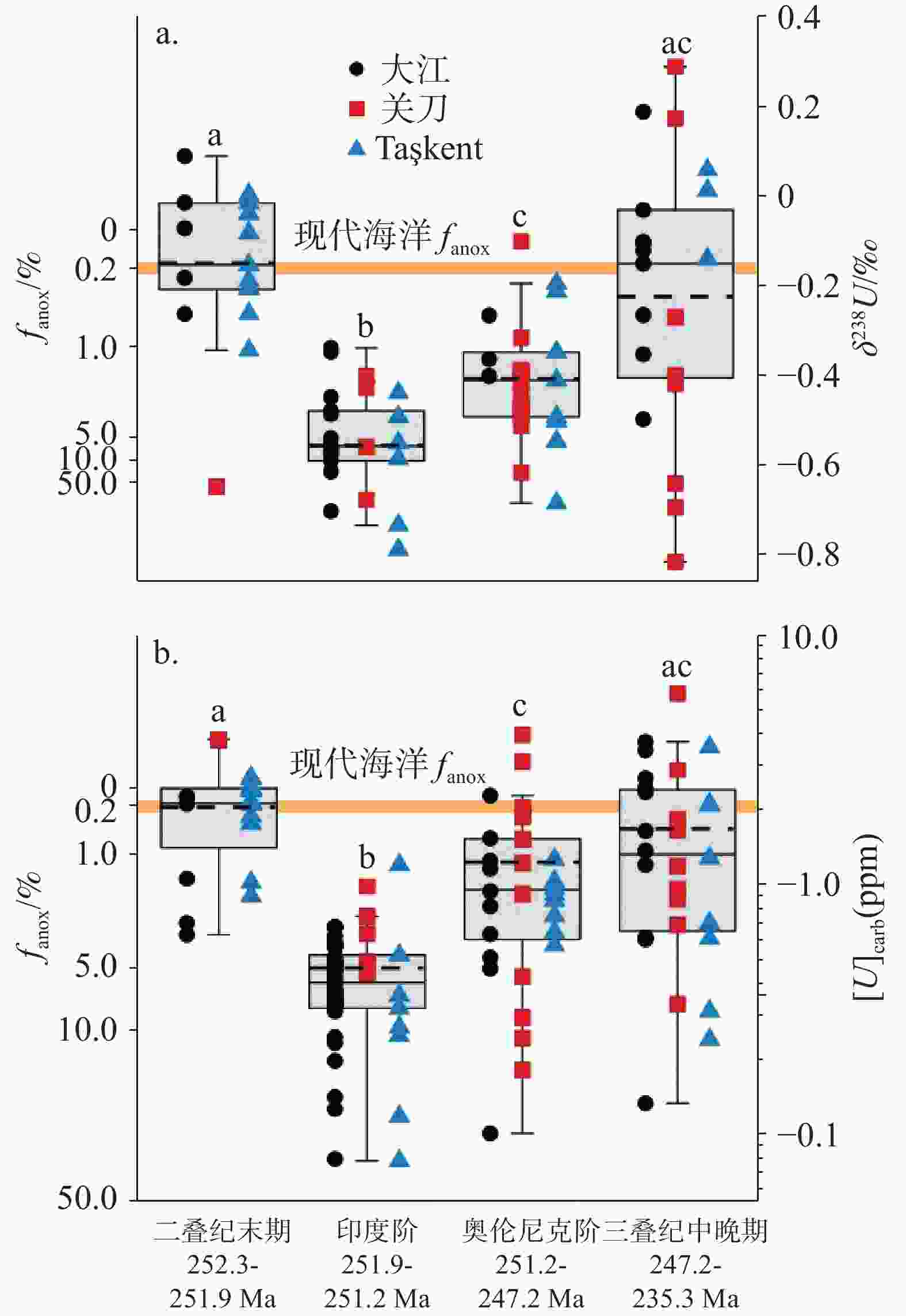 Figure 2. Proportion of anoxic seafloor area (fanox, %) of Late Permian–Late-Middle Triassic by using Uranium Box Model (Figure A: δ238U and Figure B: [U] value) (According to literature[37])