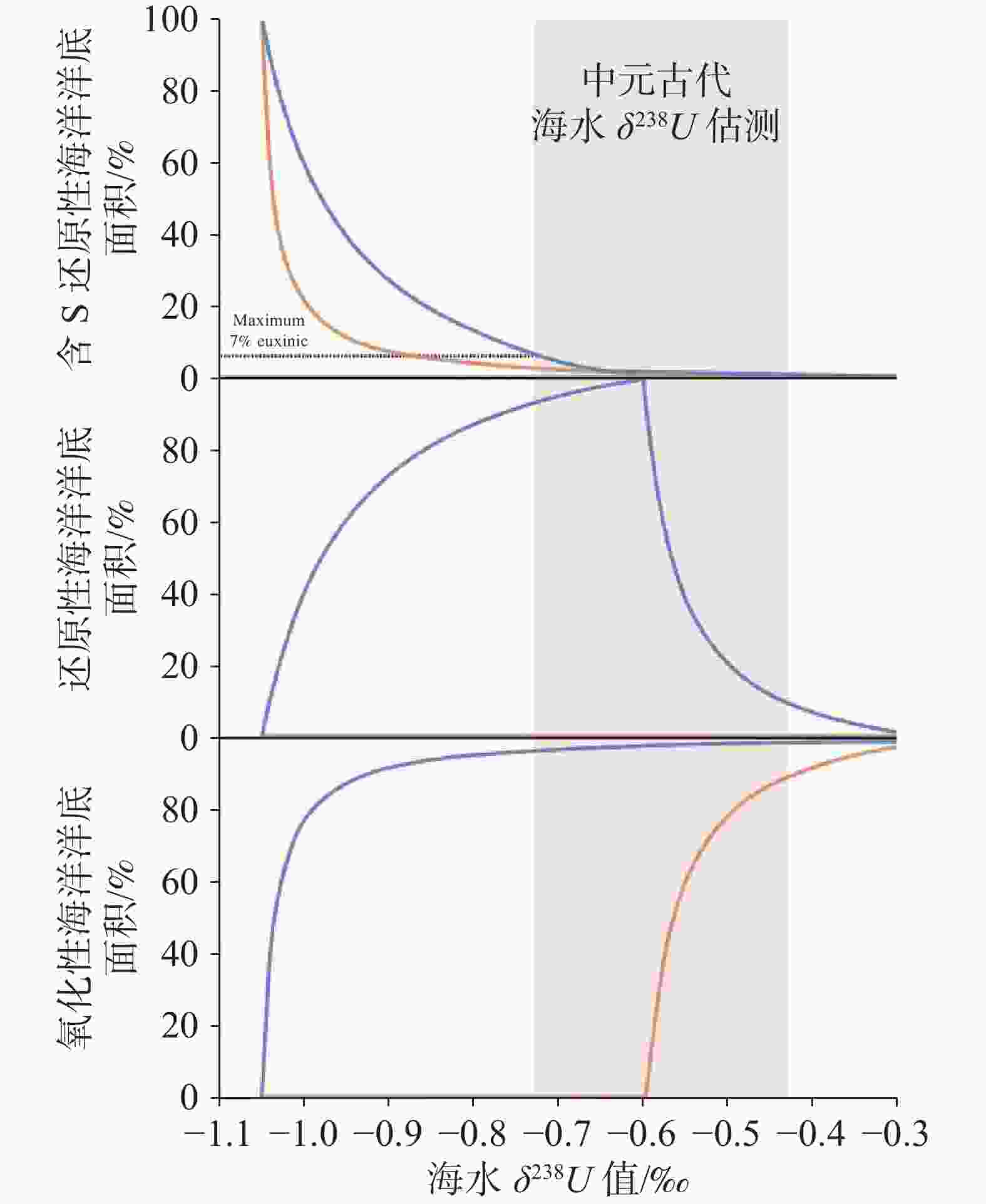橙线代表各种可能的模型迭代下的最小洋底面积,蓝色代表最大洋底面积,红色块状部分为中元古代海水δ238USW(–0.43%至–0.73‰),图中虚线交汇处,代表含S的还原性静海洋底面积占比最大为7%。