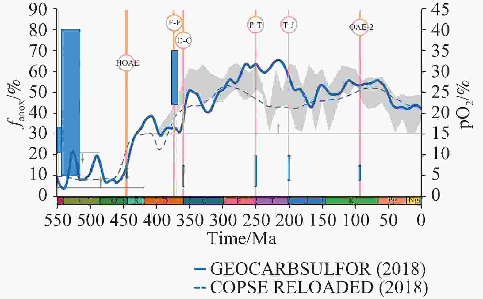 注:深蓝色实线为GEOCARBSULFOR生物地球化学模型模拟出的大气氧气含量变化范围[77];深蓝色虚线为COPSE生物地球化学模型模拟出的大气氧气含量变化范围[78];灰色不规则区域代表通过化石木炭重建的大气氧气含量变化曲线[79]。灰色线条代表通过地球化学指标、寒武纪生物群和大火燃烧记录重建的大气氧气浓度阈值[80−84]。浅蓝色方框代表对应年代还原性海洋洋底面积占比变化范围。