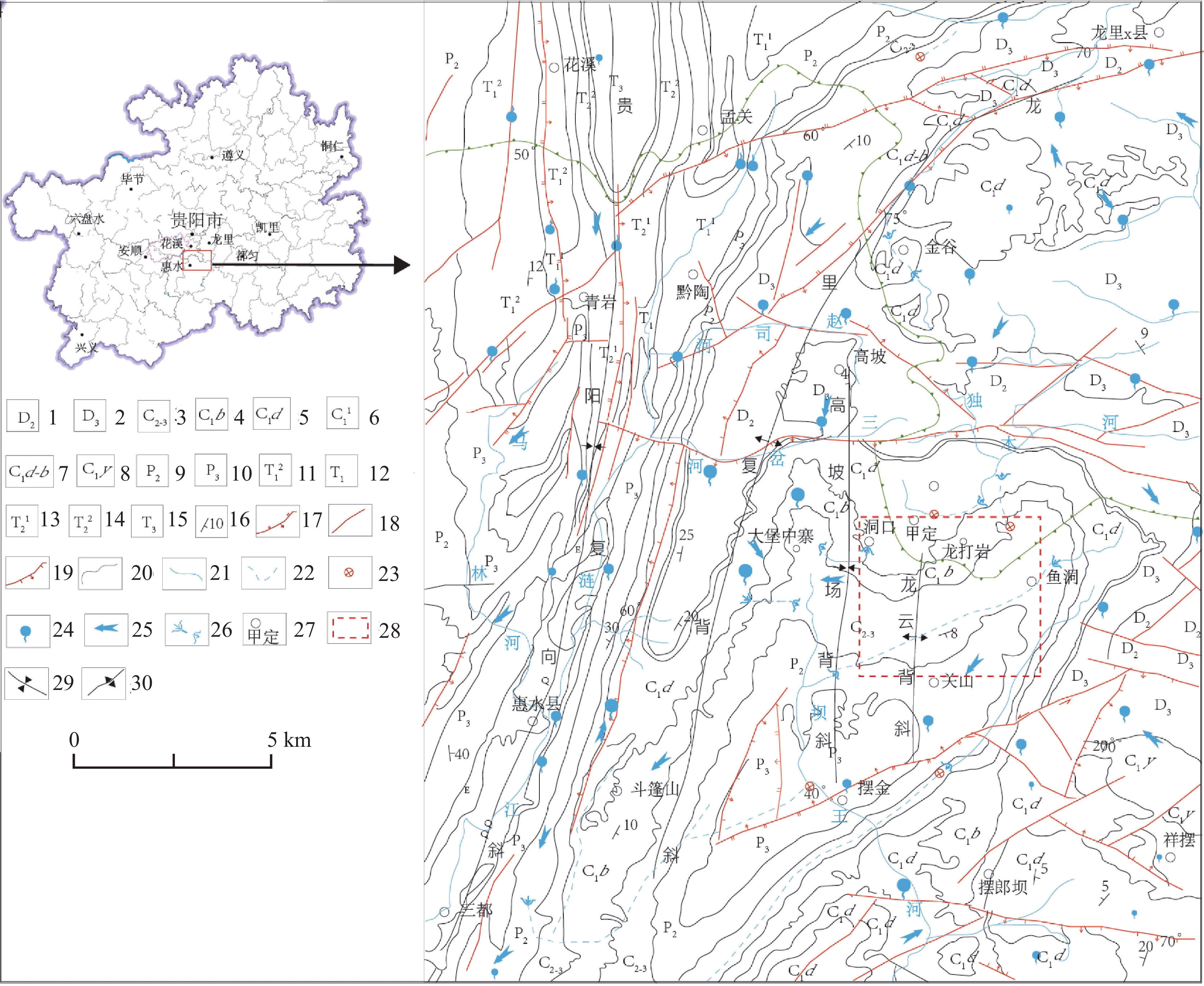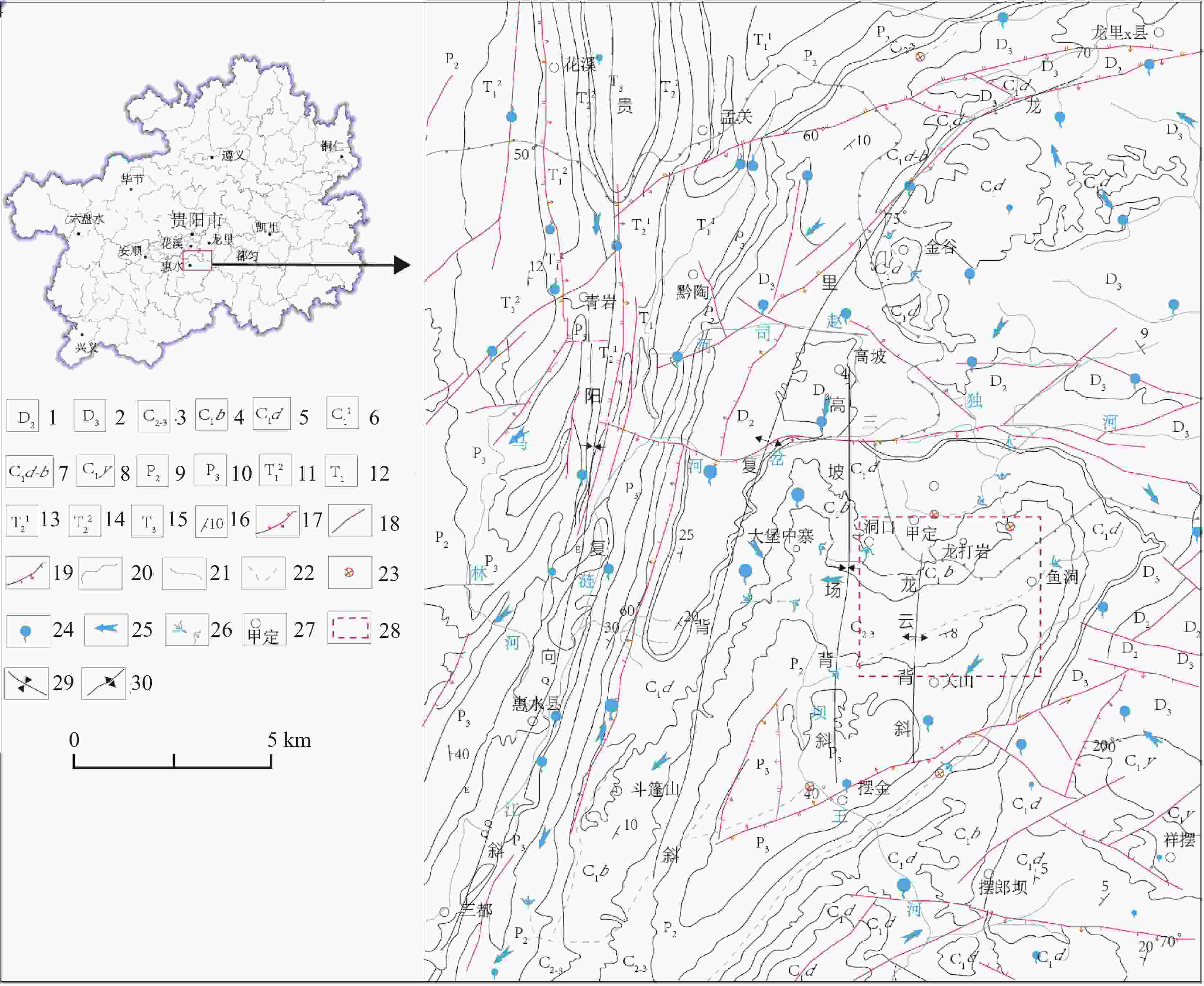 1.泥盆系中统 2.泥盆系上统 3.石炭系中上统 4.石炭系下统摆佐组 5.石炭系下统大塘阶 6.石炭系下统一段 7.石炭系下统大塘阶至摆佐组 8.石炭系下统严关阶 9.二叠系中统 10.二叠系上统 11.三叠系下统二段 12.三叠系下统 13.三叠系中统一段 14.三叠系中统二段 15.三叠系上统 16.岩层产状 17.逆断层 18.性质不明断层 19.正断层 20.地层线 21.地表河流 22.地下河 23.落水洞 24.泉水 25.径流方向 26.地下河出入口 27.地名 28.研究区 29.向斜 30.背斜