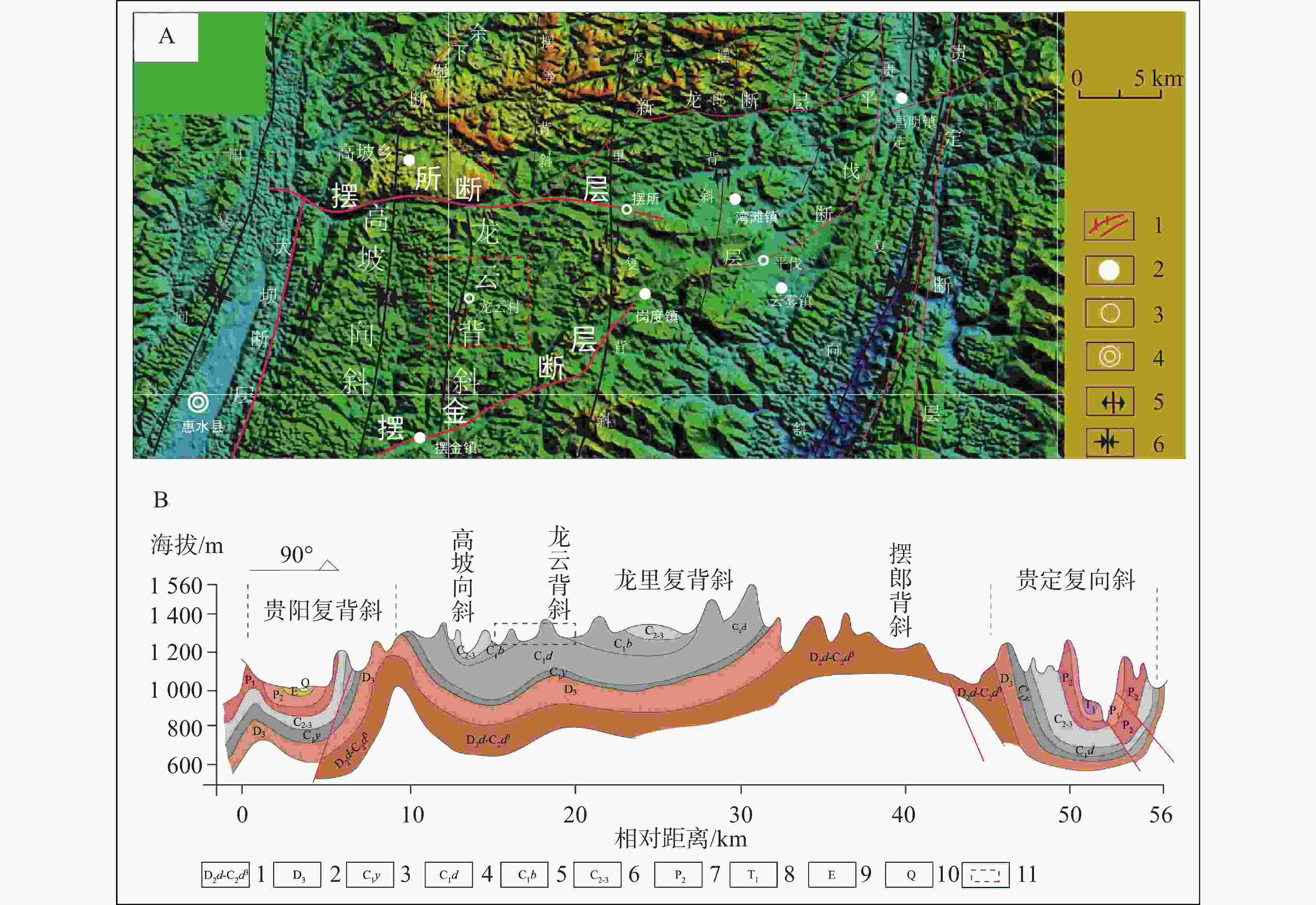 A:1.断层 2.村 2.乡镇 3.县城 5.背斜 6.向斜B:1.泥盆系中统独山组 2.泥盆系上统 3.石炭系下统严关阶 4.石炭系下统大塘阶 5.石炭系下统摆佐组 6.石炭系中上统 7.二叠系中统 8.三叠系下统 9.第三系 10.第四系 11.研究区