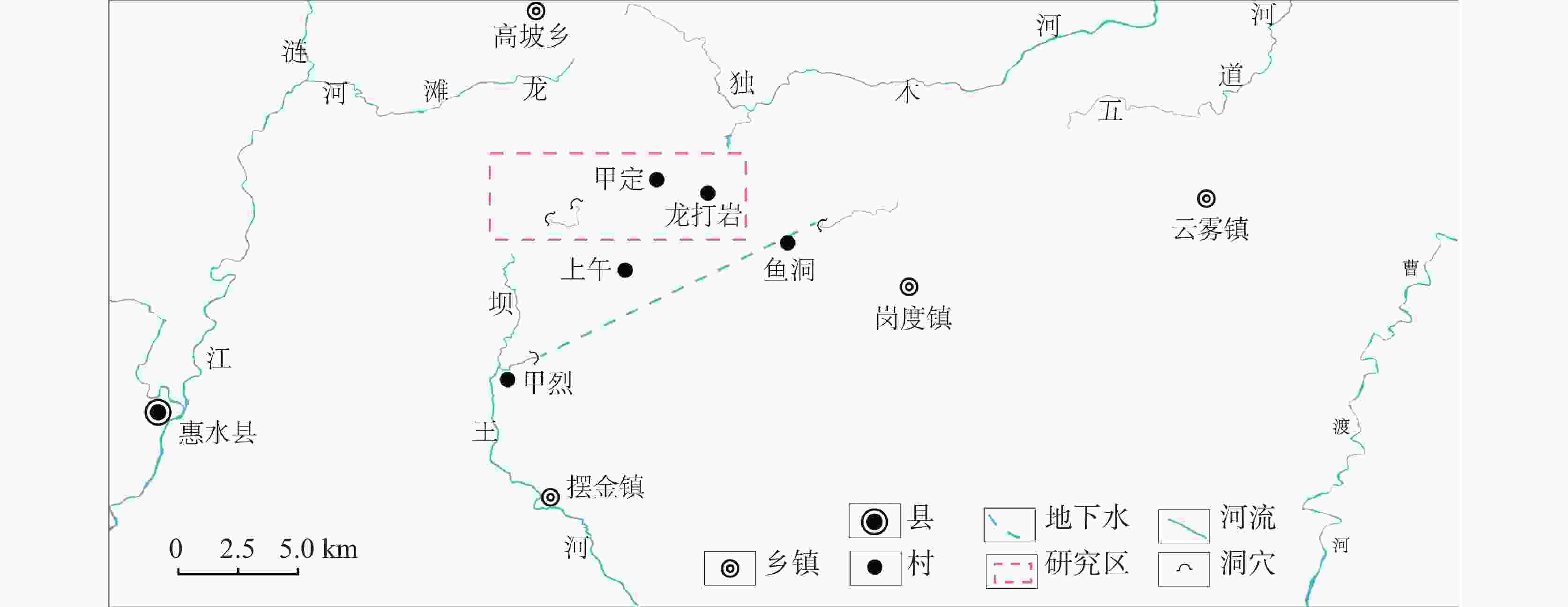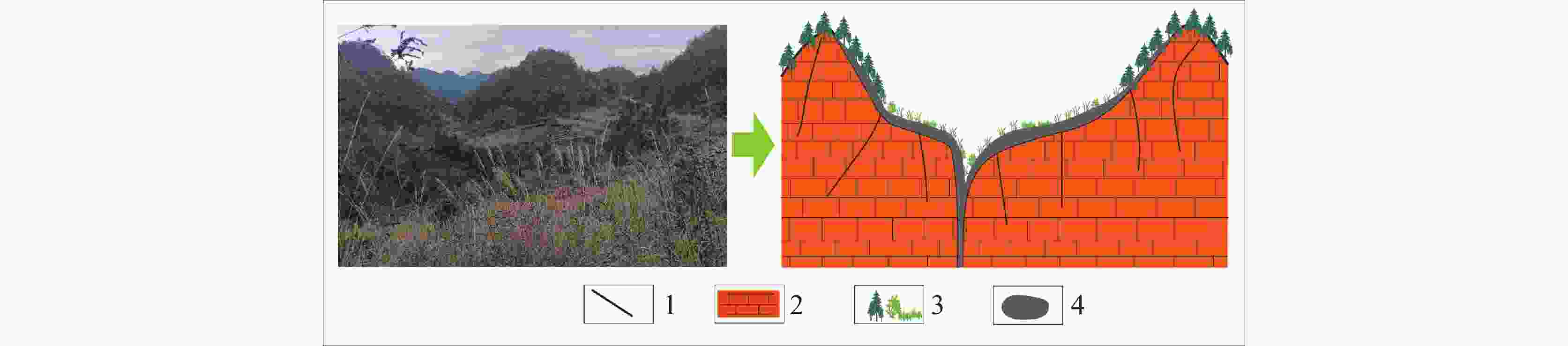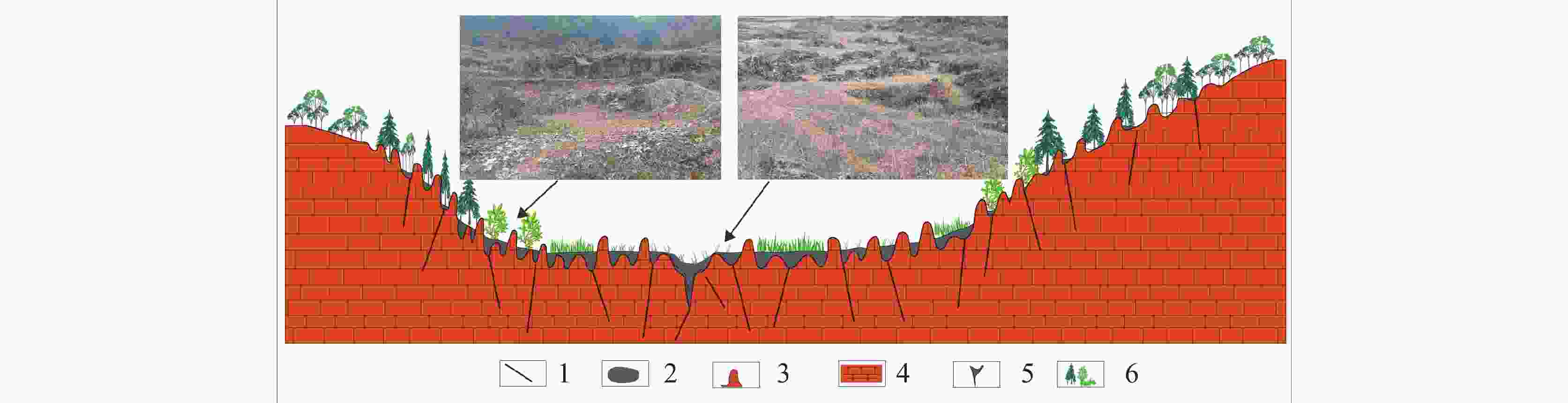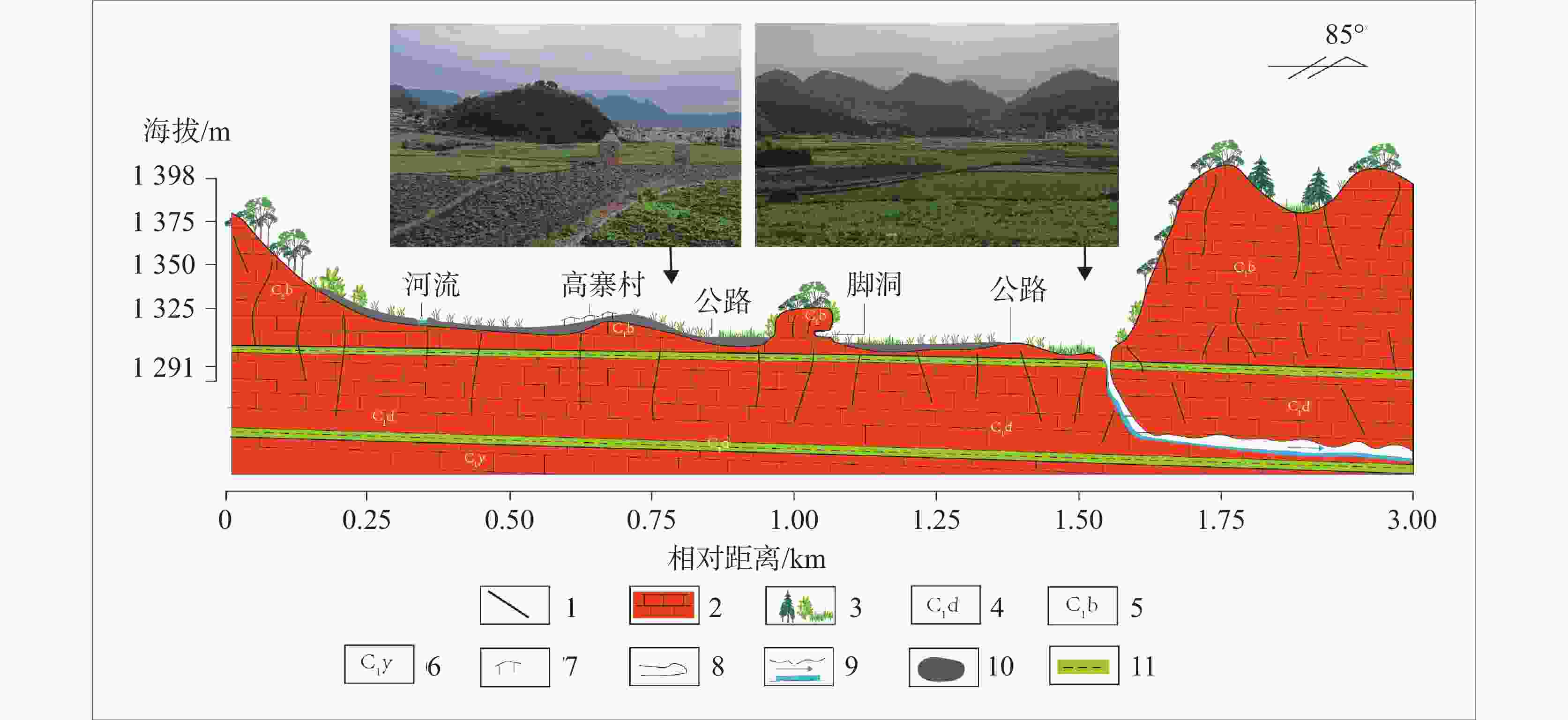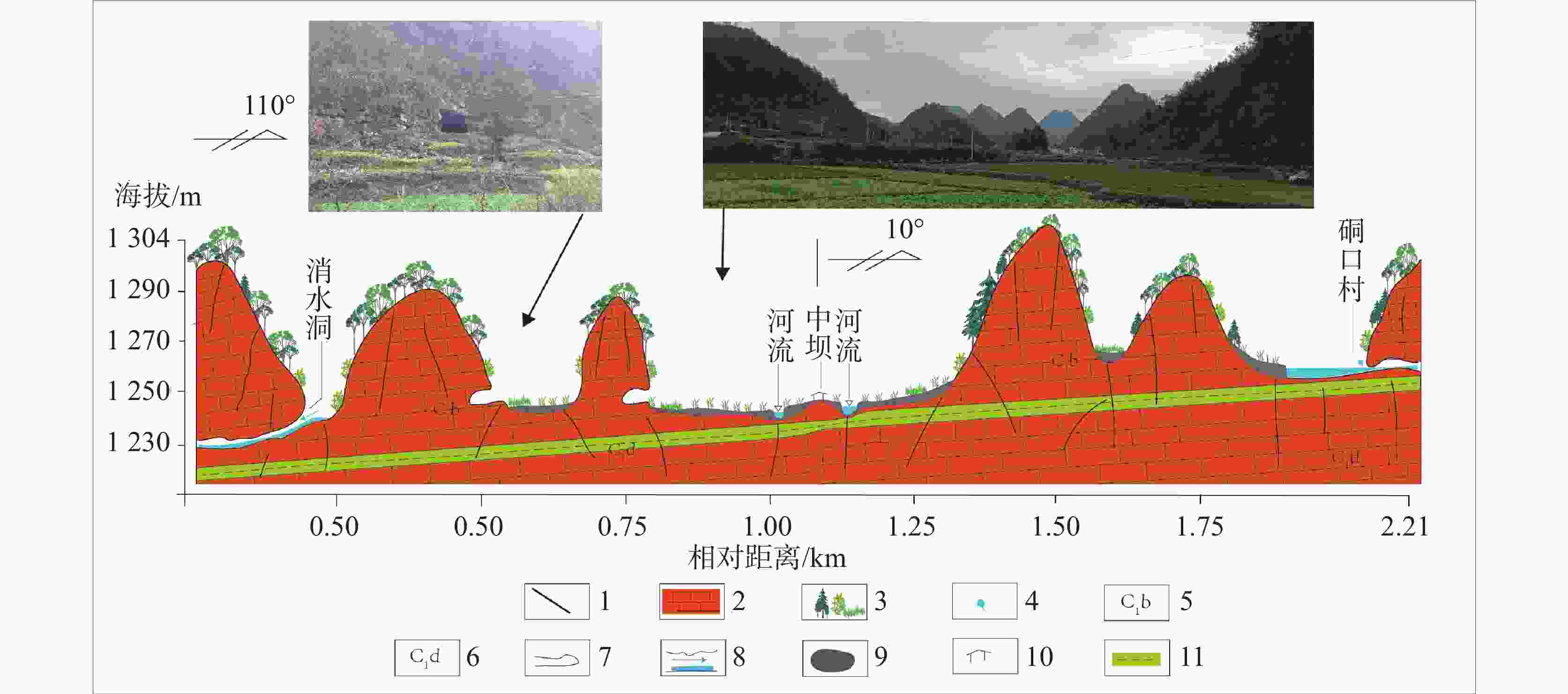 1.节理 2.碳酸盐岩 3.植被 4. 石炭系下统大唐阶 5.石炭系下统摆佐组 6.石炭系下统严关阶 7.房屋 8.洞穴 9.地下河及方向 10.土壤 11.非碳酸盐岩夹层