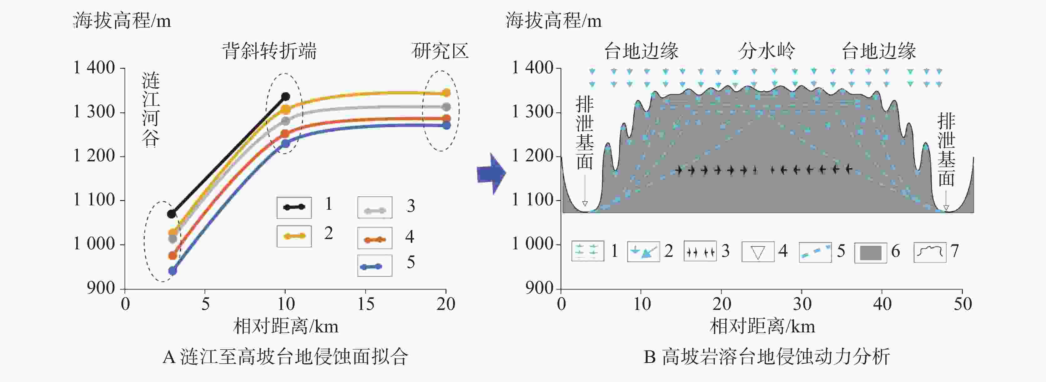 摘要: 为了探讨贵州花溪高坡岩溶高原台地分水岭水文地貌特征及形成机制,文章通过实地调查区内地质构造、岩性、地貌空间展布特征,结合区内水系特征,运用岩溶水文地貌学理论探讨其发育与演化。结果表明:①高坡岩溶台地坡立谷、边缘坡立谷、峰林谷地、岛状峰丛和岩溶洞穴等岩溶地貌较为发育,展现出层状结构特征;②峰林谷地主要发育在独木河与摆金河之间的分水岭区域;③地貌由分水岭向排泄基面呈峰林谷地→峰丛洼地→谷地(或孤峰)的展布特征。分析认为:①裂隙、节理与断裂等构造是控制区内谷地向北东、东南走向的主导因素,碳酸盐岩和非碳酸盐岩地层空间展布对岩溶地貌形态具有一定决定作用,地壳抬升是塑造层状地貌结构的直接动力;②区内岩溶台地地貌形成演化是随台地水文结构演变而演进,在地质历史过程中,台地水系受周围河流溯源侵蚀影响,由边缘向中心解体;③在此过程,高坡岩溶台地岩溶地貌经历了:石牙-湖泊、峰丛洼地、峰林谷地和台地地貌系统退化消亡等4个时期。Abstract:
