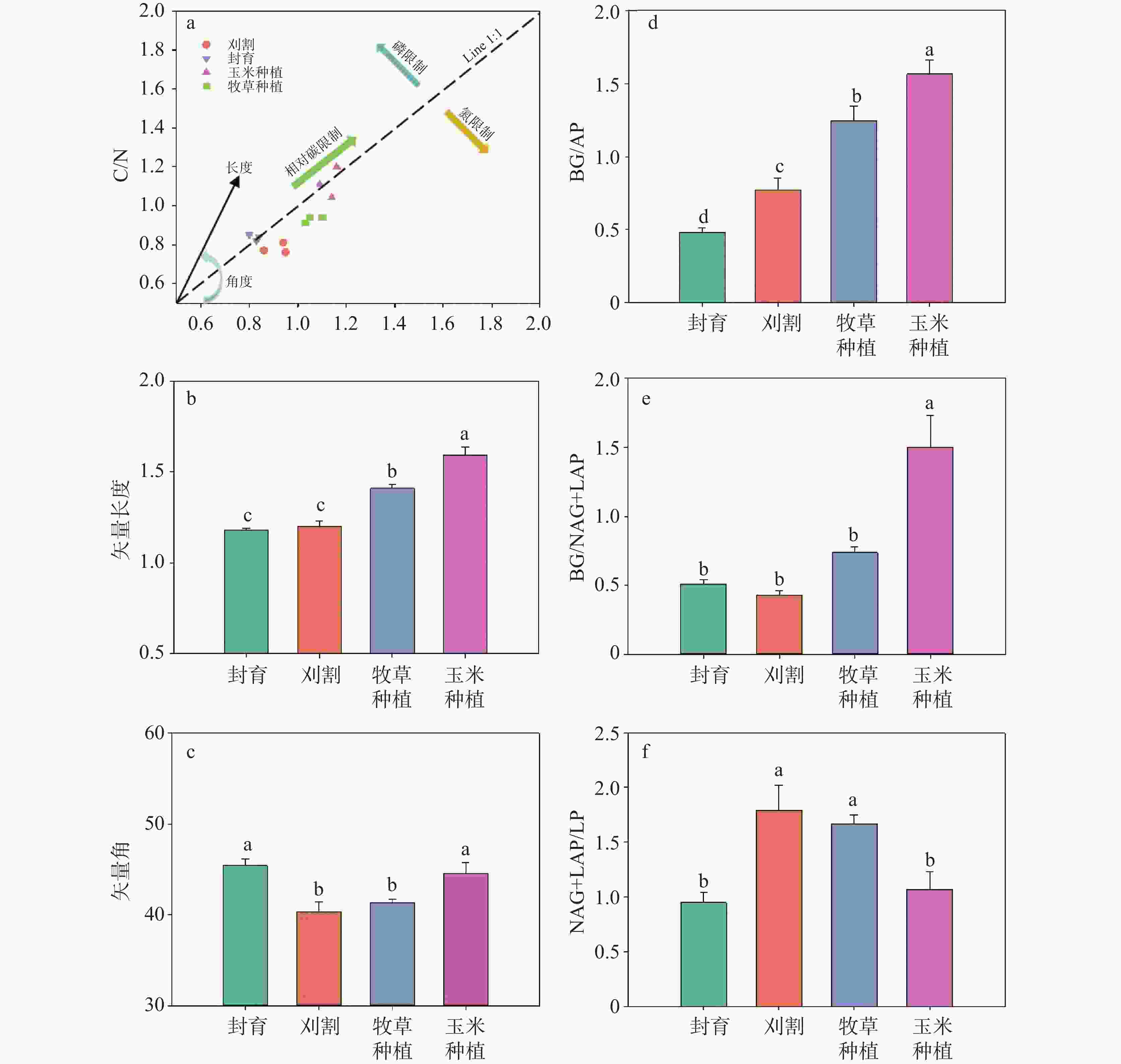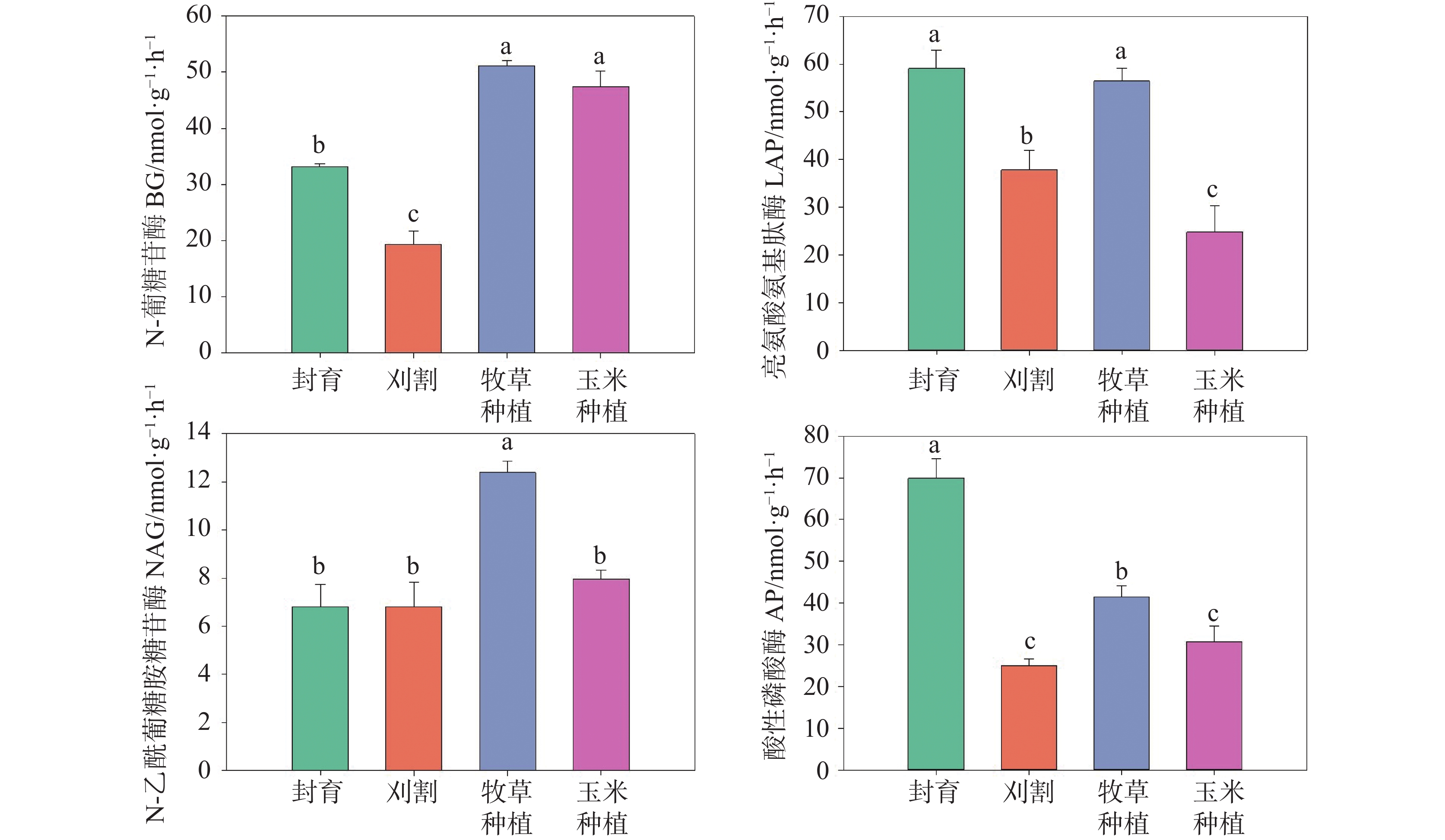 N肥和K肥作追肥表 2 土壤酶的类群、功能、名称及缩写 Table 2. Groups, functions, names, and abbreviations of soil enzymes 类群 功能 酶名称 缩写 C获取 水解纤维素二糖 β-葡萄糖苷酶 BG N获取 水解几丁质 N-乙酰氨基葡萄糖苷酶 NAG 水解蛋白质和多肽 亮氨酸氨基肽酶 LAP P获取 水解磷酸多糖和磷脂 酸性磷酸酶 AP 表 3 不同利用方式下土壤理化性质 Table 3. Soil physical and chemical properties under different land use patterns 封育 刈割 牧草种植 玉米种植 有机碳 /g·kg−1 52.96 (1.98) a 45.37 (3.14) a 44.96 (3.76) a 31.74 (5.50) b 全氮/g·kg−1 4.20 (0.37) a 3.99 (0.80) a 3.12 (0.13) ab 2.45 (0.05) b 全磷/g·kg−1 1.24 (0.16) a 1.17 (0.12) a 1.09 (0.12) a 1.02 (0.02) a C/N 12.72(0.88) a 11.86 (1.80) a 14.43(1.02) a 12.95(2.26) a C/P 43.37(3.97) a 39.05(2.74) ab 41.47(1.72) ab 31.18 (5.61) b N/P 3.40 (0.14) a 3.36(0.32) a 2.90(0.22) ab 2.40 (0.02) b DOC /mg·kg−1 47.18 (7.77) a 37.66 (6.25) a 42.36 (5.69) a 37.94 (6.04) a TIN /mg·kg−1 24.49 (0.96) a 18.48 (2.76) b 24.04 (1.45) a 17.52 (1.09) b SAP /mg·kg−1 4.97 (0.21) b 5.60 (0.67) b 9.20 (0.77) a 6.03 (0.67) b MBC /mg·kg−1 718.07 (55.35) a 836.74 (40.76) a 817.69 (132.99) a 274.01 (36.26) b MBN /mg·kg−1 78.10 (8.37) a 75.80 (1.85) a 52.11 (10.58) b 12.39 (2.66) c MBP /mg·kg−1 11.17 (2.42) a 7.88 (0.95) ab 7.58 (1.24) ab 4.38 (0.68) b Soil pH 7.57 (0.16) a 7.75 (0.07) a 7.12 (0.03) b 7.45 (0.12) a
