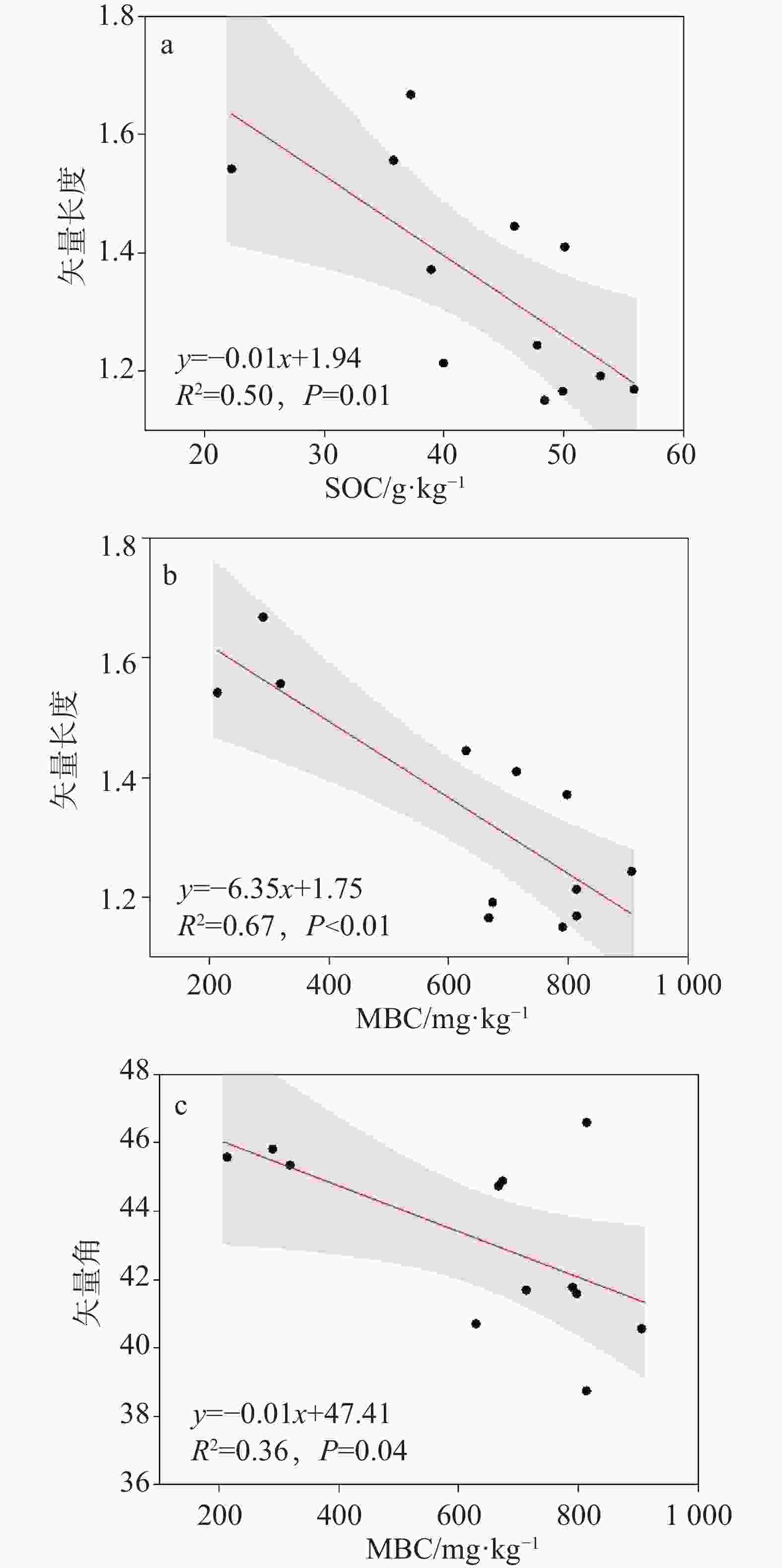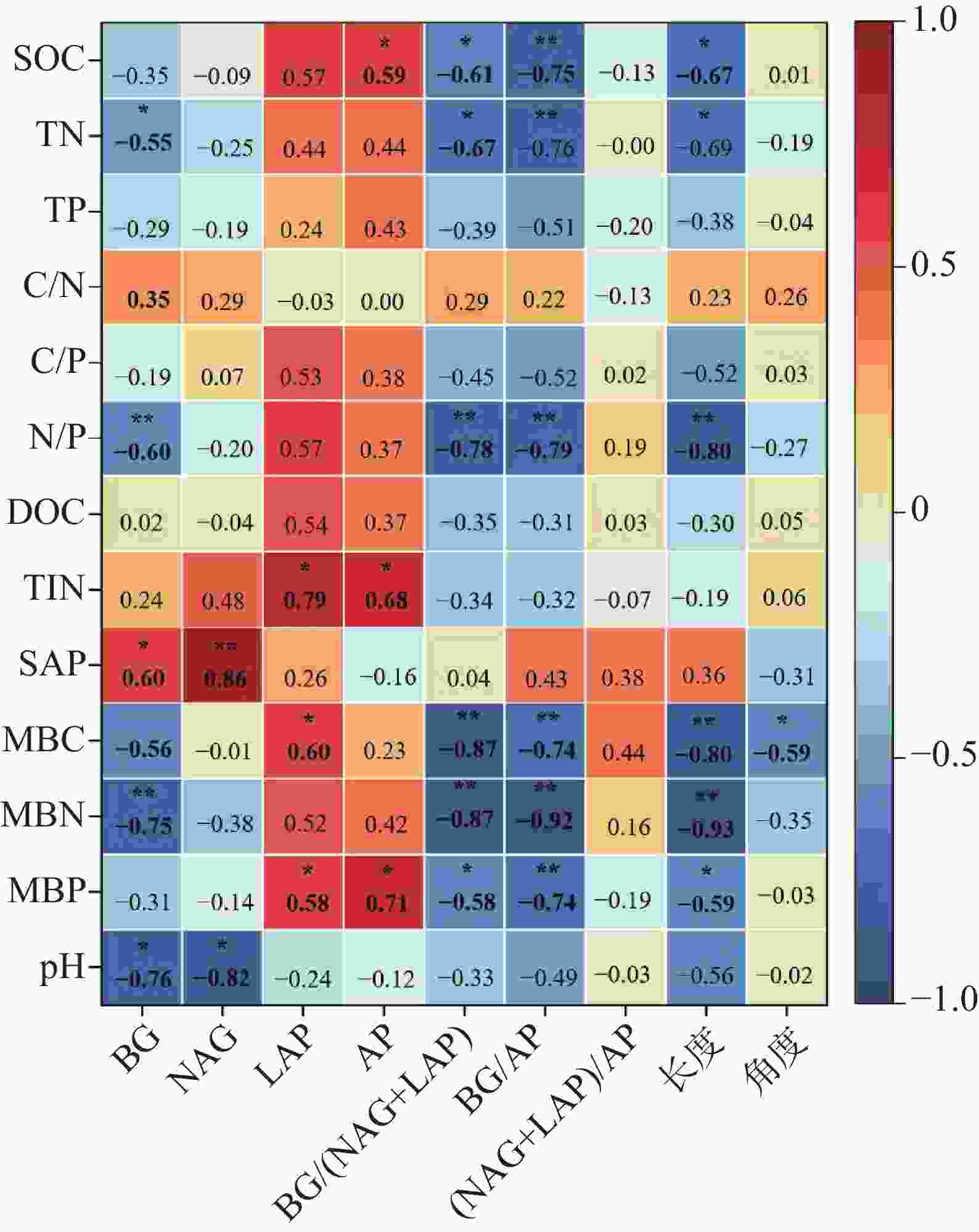 图 1 不同利用方式下土壤酶活性 注:相同字母表示不同处理差异不显著(P>0.05);不同字母表示不同处理差异显著(P<0.05)。 Figure 1. Soil enzyme activities under different land use patterns Note: The same letters indicate no significant difference between different treatments (P>0.05), while different letters indicate significant difference between different treatments (P<0.05). 图 3 土壤性质与酶活性、酶化学计量学相关性 注:蓝色表示两因子间呈负相关关系,红色表示两因子间呈正相关关系,数字表示相关性大小。*表示关系显著(P < 0.05),**表示关系极显著(P < 0.01)。 Figure 3. Correlations among soil properties, enzyme activity and enzymatic stoichiometry Note: Blue indicates a negative correlation between the two factors; red indicates a positive correlation, and the number indicates the size of the correlation. * indicates significance at the level of 0.05, and ** indicates significance at the level of 0.01. 图 4 酶化学计量学矢量长度与SOC、MBC及矢量角与MBC的关系 注:实线和阴影区域分别表示线性模型拟合和95%置信区间。 Figure 4. Relationship between vector length of enzyme stoichiometry and SOC and MBC, and relationship between vector angle and MBC Note: The solid lines and shaded areas represent linear model fit and 95% confidence intervals, respectively. 表 1 各利用方式的详细处理及施肥水平 Table 1. Treatment and fertilization level of each land use pattern 利用方式 相应处理及施肥措施 封育 保留原植被,作为参照;植物优势种为圆叶乌桕(Triadica rotundifolia (Hemsley) Esser)、黄荆(Vitex negundo L.)、楤木(Aralia elata (Miq.) Seem.)、臭蒿(Artemisia annua L.)等 刈割 每年12月施加处理一次,地上植被完全移除,根系保留 牧草种植 牧草每3个月收割一次,免耕,每年于牧草返青后施用底肥,氮(N)、磷(P2O5)、钾(K2O)施用量均为45 kg·hm−2,每次收割后施用N和K2O肥各50 kg·hm−2,P2O5肥15 kg·hm−2 玉米种植 施用的N、P2O5、K2O肥分别为160 kg·hm−2、90 kg·hm−2和90 kg·hm−2,其中100%的P肥、70%的N肥和K肥作基肥,30%的