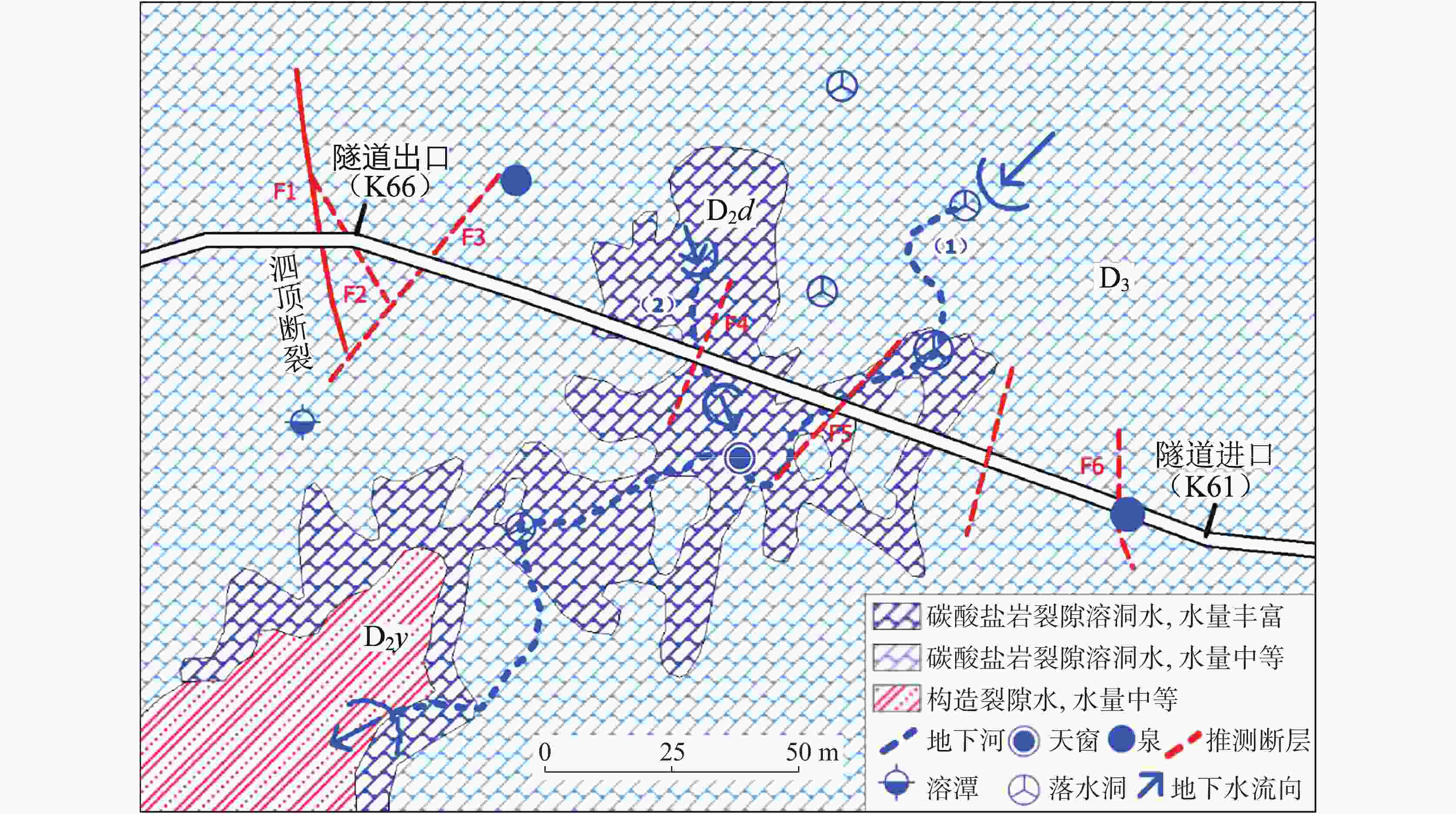 育程度①地表岩溶点密度 >10个·km−1 大 2~10个·km−1 中 <2个·km−1 小 ②岩性分界线密度 密度>2条·km−1 大 1<密度≤2条·km−1 中 密度≤1条·km−1 小 ③断层线密度 密度>2条·km−1 大 1<密度≤2条·km−1 中 密度≤1条·km−1 小 ④钻孔遇溶率 遇洞率≥30% 大 10%≤遇洞率<30% 中 遇洞率<10% 小 ⑤隧道纵断面溶洞