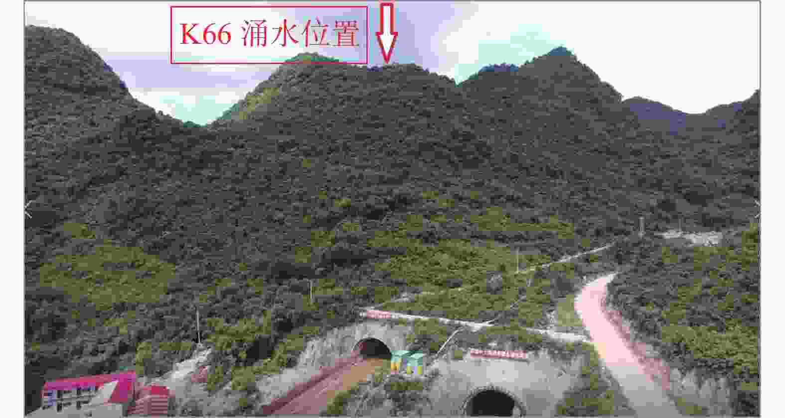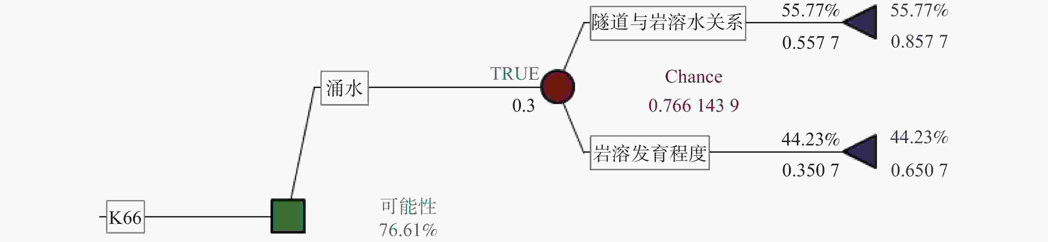 带(地下河等)情况密度≥1条·km−1 大 0<密度<1条·km−1 中 0条·km−1 小 表 4 隧道涌水突泥快速判别决策树模型计算参数表(K66) Table 4. Calculation parameters of decision tree model for rapid assessment of water and mud inrush in the tunnel (K66) 里程段 状态枝 概率条件 涌水权重/% 对应可能性 可能性加权/% 加权涌水权重/% 状态枝概率/% k66+000~k67+000 岩溶发育程度 地表岩溶点密度 1.65 中 75.00 1.24 33.61 岩性分界线数量 3.56 小 25 0.89 断层线密度 4.90 大 100 4.90 钻孔遇洞率 2.93 小 25 0.73 纵断面岩溶规模 9.82 大 100 9.82 轴线岩溶率 8.15 中 75.00 6.11 横断面岩溶率 13.22 中 75.00 9.92 隧道与岩溶水关联度 补径排关系 1.03 大 100 1.03 55.77 地下水位 20.45 大 100 20.45 强径流带数量 34.29 大 100.00 34.29 表 5 隧道不同里程段状态枝概率 Table 5. Probability of state branch in each mileage of the tunnel 里程段 状态枝 状态枝概率/% k61+000~k62+000 岩溶发育程度 25.20 隧道与岩溶水关联度 14.72 k62+000~k63+000 岩溶发育程度 24.87 隧道与岩溶水关联度 14.46 k63+000~k64+000 岩溶发育程度 13.51 隧道与岩溶水关联度 13.94 k64+000~k65+000 岩溶发育程度 20.71 隧道与岩溶水关联度 50.40 k65+000~k66+000 岩溶发育程度 24.87 隧道与岩溶水关联度 29.80 k66+000~k67+000 岩溶发育程度 35.07 隧道与岩溶水关联度 55.77