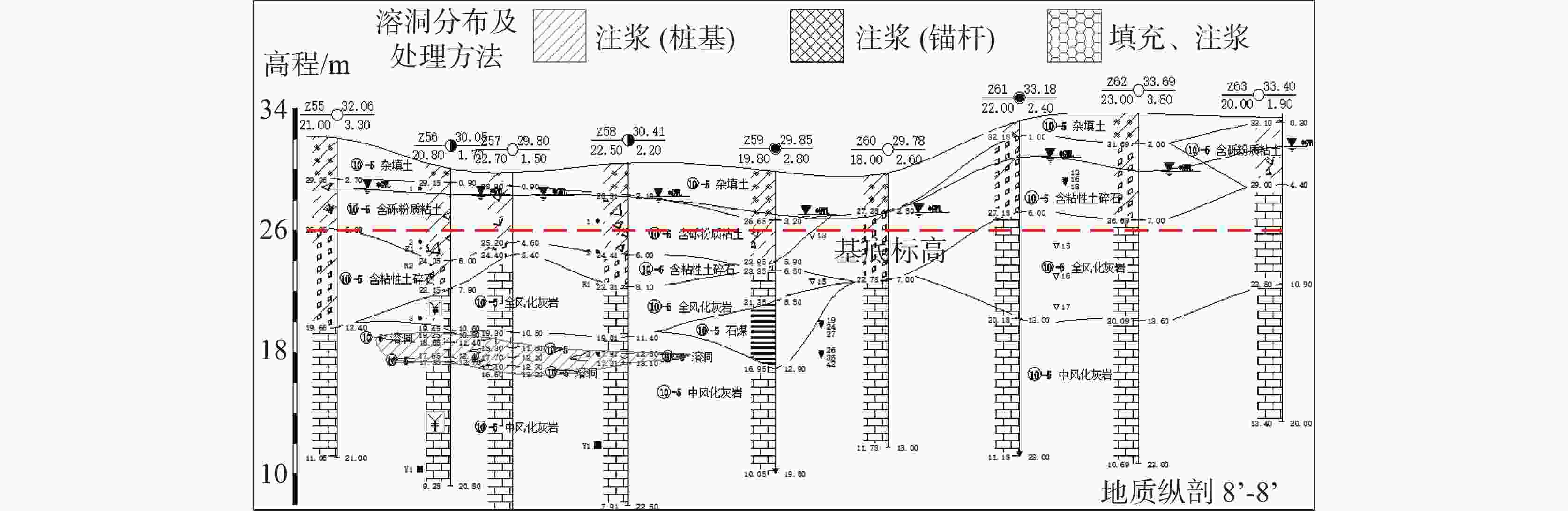土层编号 土层名称 土层厚度/m 土层性质 ① 杂填土 6.70~0.40 结构松散,工程性能及均一性差 ②-1 含砾粉质黏土 10.40~0.90 中等压缩性,切面粗糙,干强度高 ②-2 含黏性土碎石 6.60~0.60 粗颗粒的矿物成分主要为长石、石英等,岩质坚硬 ⑤-1 全风化灰岩 14.40~0.60 可塑为主,局部硬可塑,风化成泥土状,夹砂砾,原岩结构清晰可辨,手掰易碎 ⑤-0 溶洞 14.60~0.50 岩芯不成形、烂泥状,夹少量中风化岩块,岩石表面可见明显溶蚀凹槽 ⑤-夹层 石煤 4.40~1.40 夹大量0.5~2 cm煤屑,手掰易碎 ⑤-3 中风化灰岩 最大揭露厚度16.10 m 岩芯多呈柱状、短柱状,少量碎块状,锤击声脆,较难击碎,