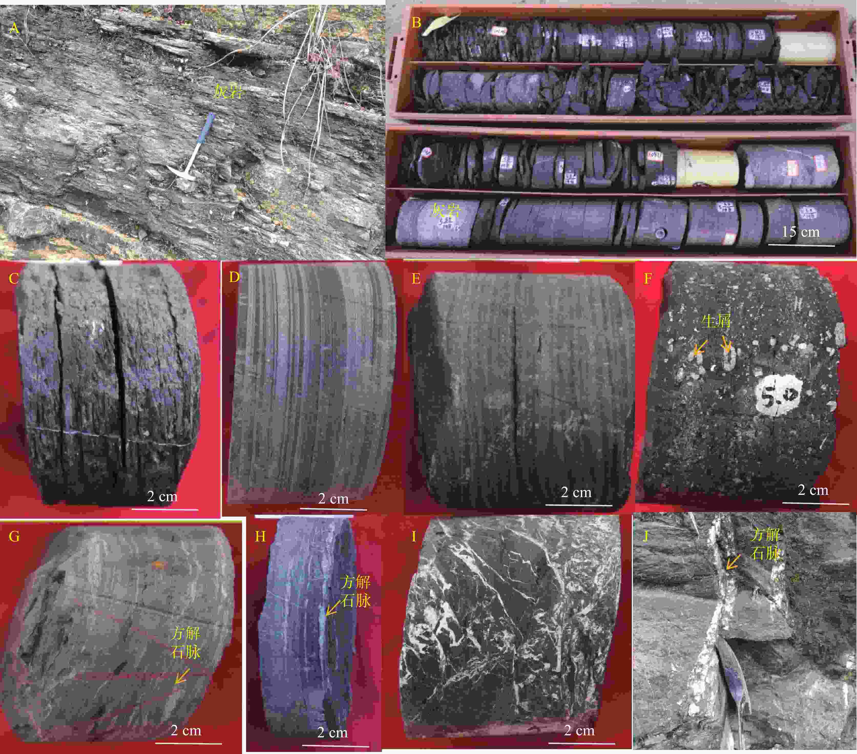 A.Dark gray calcareous shale with micrite stripes and lenses, Rongshuidaliang profile B.Dark gray calcareous mudstone with micite, 1,602.3–1,606.4 m, Guirongye Well 1 C.Gray-black calcareous mudstone, 1,544 m, Guirongye Well 1 D.Horizontally laminated micrite alternating with calcareous mudstone, 1,414.32 m, Guirongye Well 1 E.Cross-stratified calcareous silty mudstone, 1,539.66 m, Guirongye Well 1 F.Carbonaceous mudstone containing "floating" bioclastics, 1,603.66 m, Guirongye Well 1 G.Calcareous mudstone with lens-shaped and vein-shaped calcite, 1,412.1 m, Guirongye Well 1 H.Calcareous mudstone with horizontally vein-shaped calcite, 1,534.4 m, Guirongye Well 1 I.Dark gray calcareous mudstone with developed net fractures, completely filled with calcite, 1,416.9 m, Guirongye Well 1 J.Calcite veins are constructed in vertical plane of calcareous mudstone, Rongshuidaliang profile