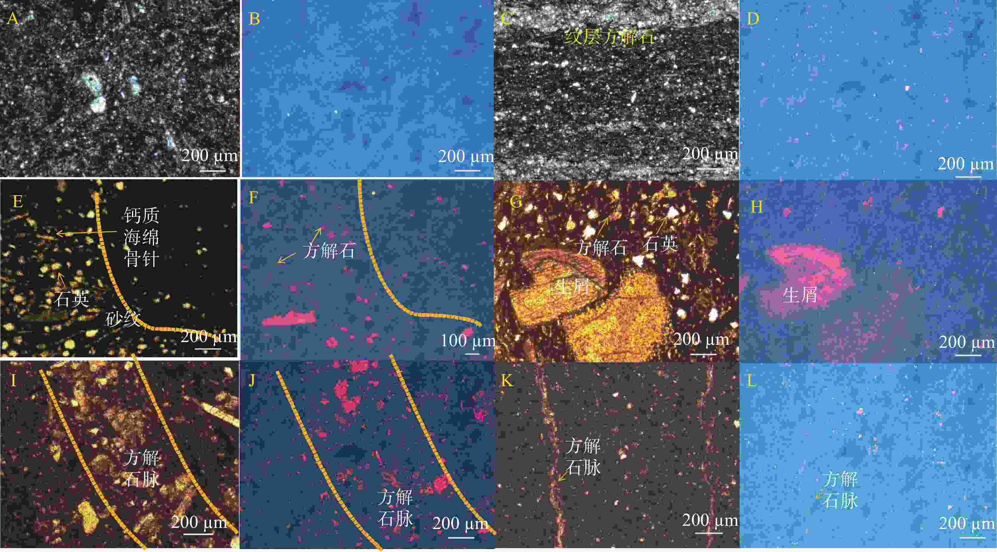 1544 m B.为A阴极发光,显示不发光,1544 m C.为图4D水平纹层泥灰岩镜下照片,深色钙质泥岩与浅色泥微晶方解石呈条带状互层 D.阴极发光为不发光,1414.32 m E.为图4E具交错层理粉砂质泥岩镜下特征,左下为粉砂质泥岩纹层,由石英、黏土、方解石混积,右上主要为黏土和方解石,为钙质泥岩纹层,1539.66 m F.为E阴极发光,部分方解石具有弱红阴极发光,部分不发光,发光碳酸盐矿物为钙质胶结物和一些钙质生屑,1539.66 m G.图4F含生屑炭质泥岩镜下特征,生屑含量可达到20%,有珊瑚、海百合、钙质海绵骨针等,生屑具有泥晶—细晶结构,泥岩中含少量石英,1603.66 m H.G中生屑阴极发光中具有弱红光,1603.66 m I.为图4G具透镜状方解石钙质泥岩镜下特征,两条黄色线内为脉体,方解石呈细晶结构,1412.1 m J.I中脉体方解石具弱红色阴极发光,1412.1 m K.为图4I网裂缝镜下特征,方解石全充填,1416.9 m L.为K阴极发光,左侧裂缝发很弱光,右侧裂缝基本不发光,1416.9 mFigure 5. Microscopic characteristics and cathodoluminescence of carbonate minerals from the Luzhai Formation in Guirongye Well 1
