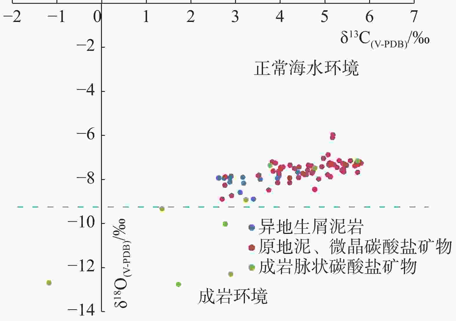 发育位置 发育类型 碳酸盐矿物含量 发育形态 阴极发光 碳氧同位素 成因分析 发育规模 纯泥岩 钙质泥岩 10%~50% 泥晶状分散于泥岩中 基本不发光 δ13C为2.70‰~5.81‰,δ18O为−8.89‰~
