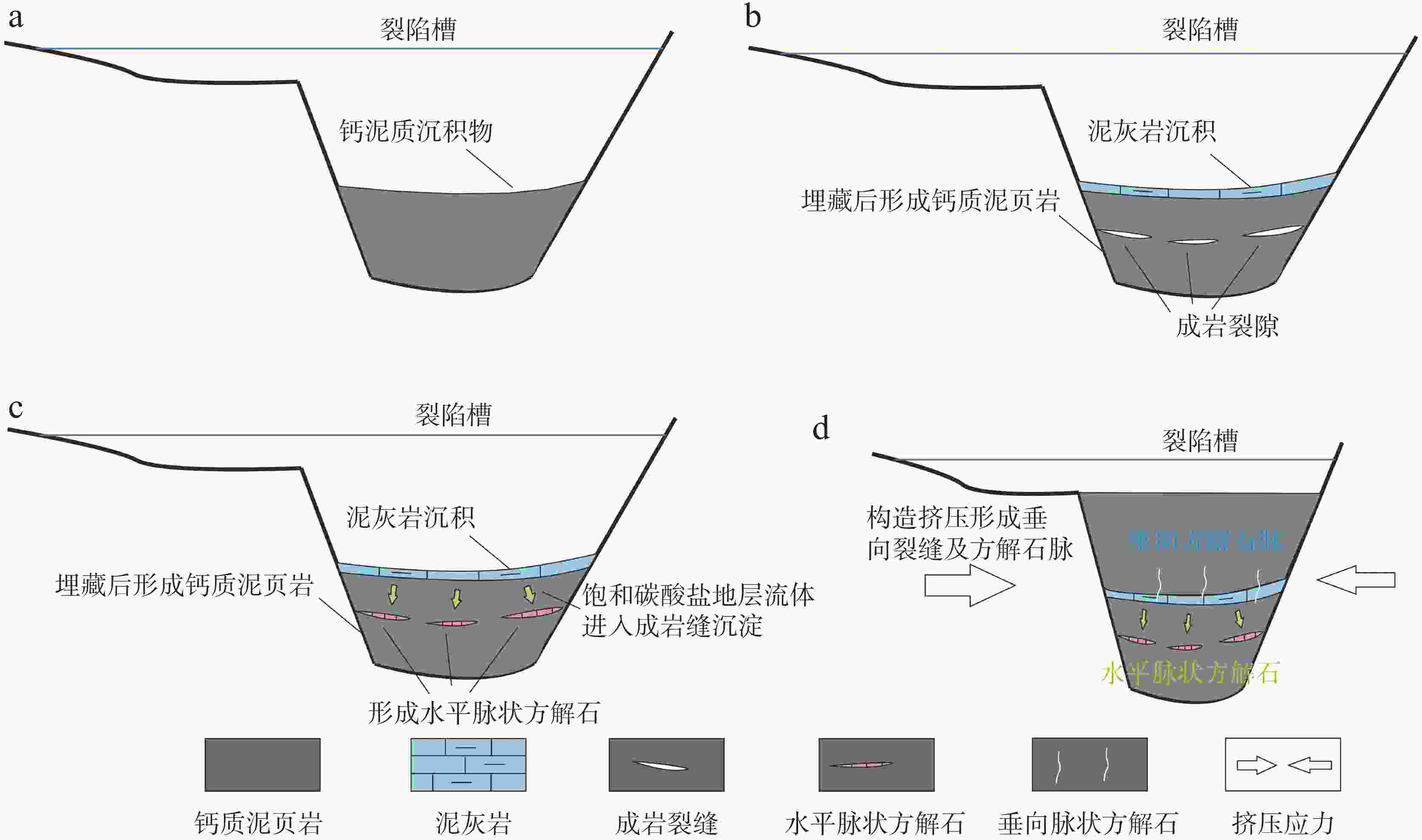a.碳酸盐矿物与黏土混合沉积 b.埋藏期差异压实形成成岩裂缝 c.成岩裂缝被地层流体充填并生长水平脉状方解石,地层流体碳酸盐过饱和 d.受构造影响,垂向脉状方解石发育