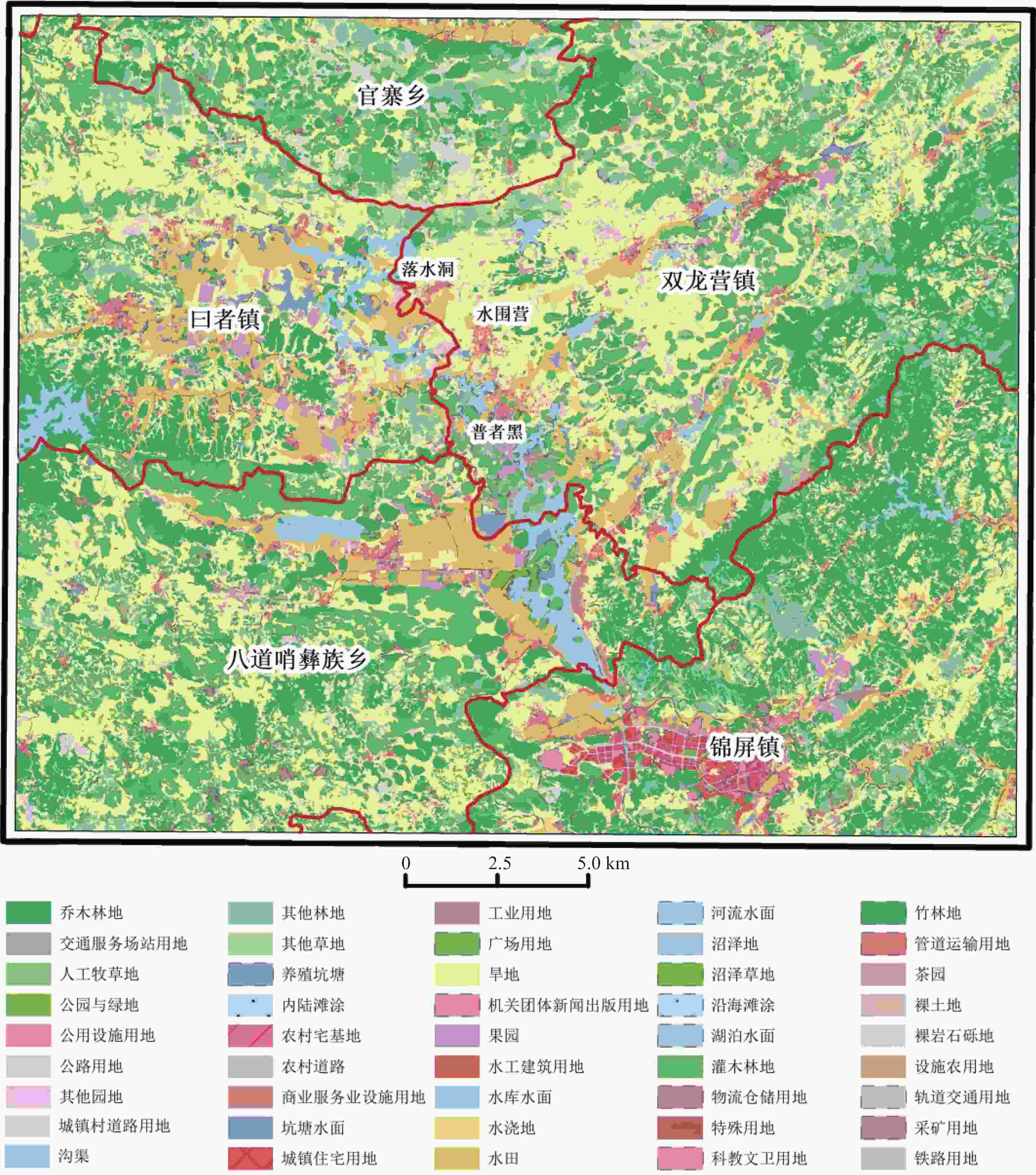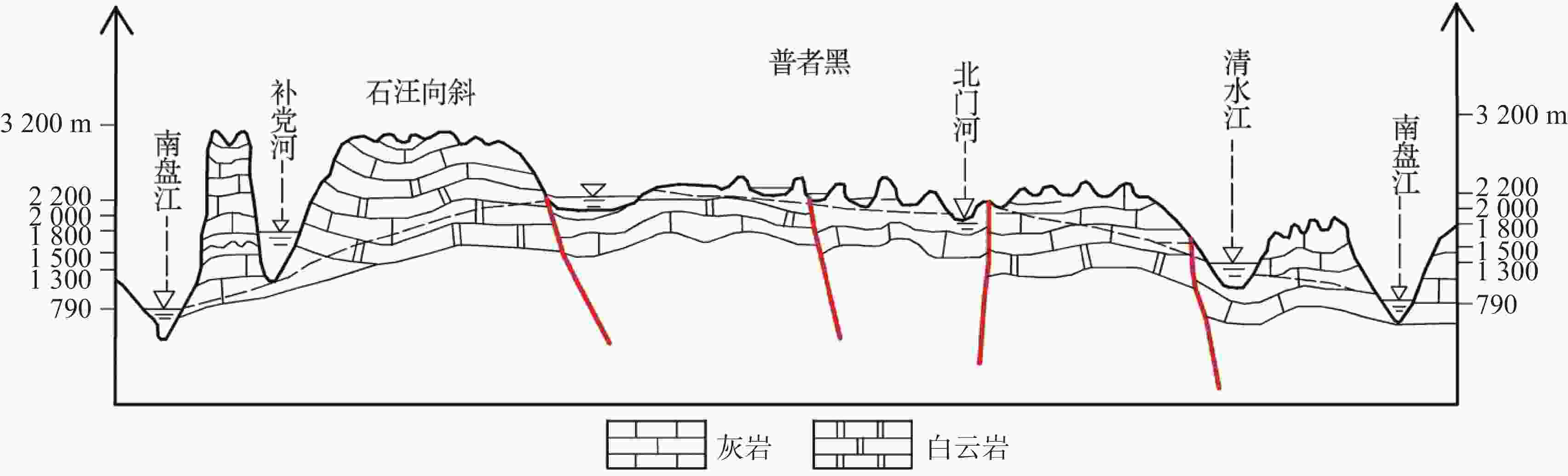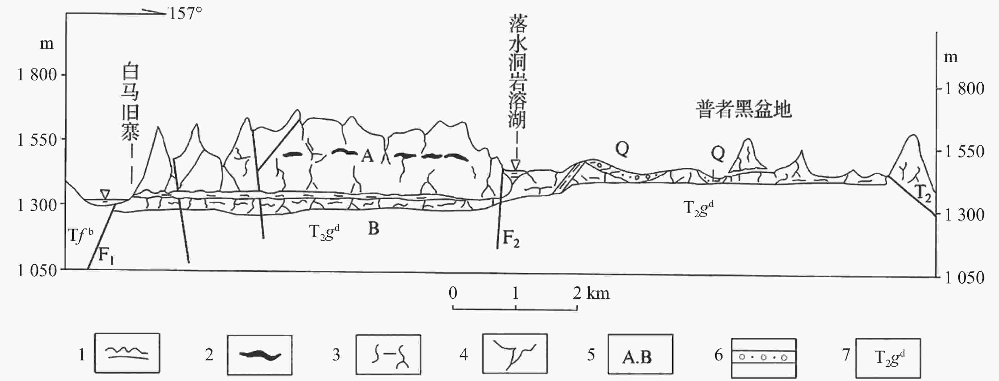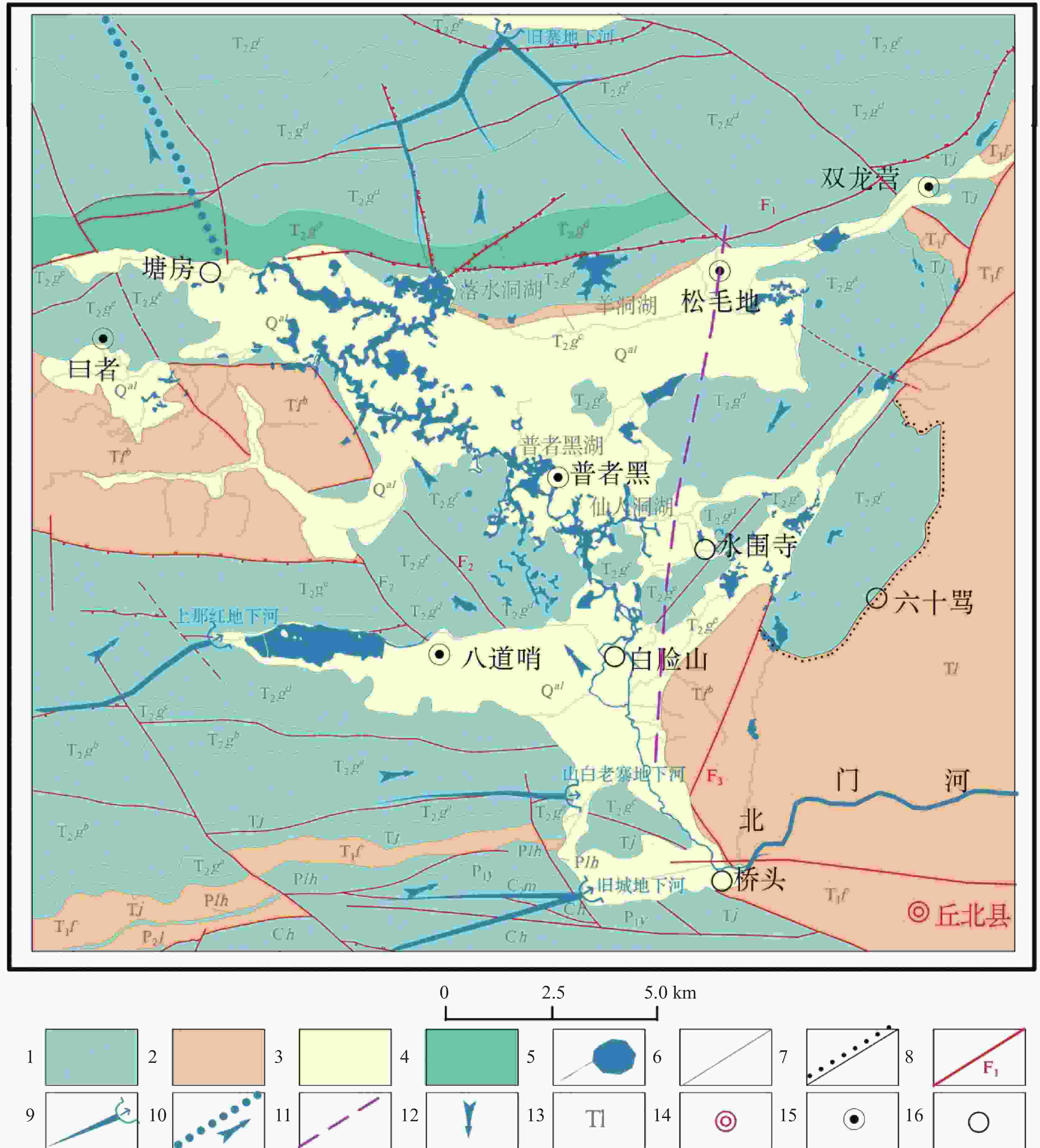 图 3 普者黑盆地水文地质图 1.岩溶含水层 2.裂隙含水层 3.孔隙含水层 4.碎裂状白云岩 5.水系湖泊湿地 6.地层界线 7.相变界线 8.断层及编号 9.地下河管道及出口 10.盆地原地表水系出流位置及流向 11.湖群分界线 12.地下水流向 13.地层代号 14.县城驻地 15.乡镇驻地 16.村驻地 Figure 3. Hydrogeological map of the Puzhehei basin 1. karst aquifer; 2. fractured aquifer; 3. pore aquifer; 4. cataclastic dolomite; 5. drainage lake wetland; 6. stratigraphic boundary; 7. phase change boundary; 8. faults and numbering; 9. pipeline and outlet of the underground river; 10. outflow location and direction of the original surface water system in the basin; 11. boundary lines of lake group; 12. direction of groundwater flow; 13. stratigraphic code; 14. county site; 15. township site; 16. village site 表 1 普者黑峰林展布特征一览表 Table 1. Distribution characteristics of peak forest in Puzhehei 展布