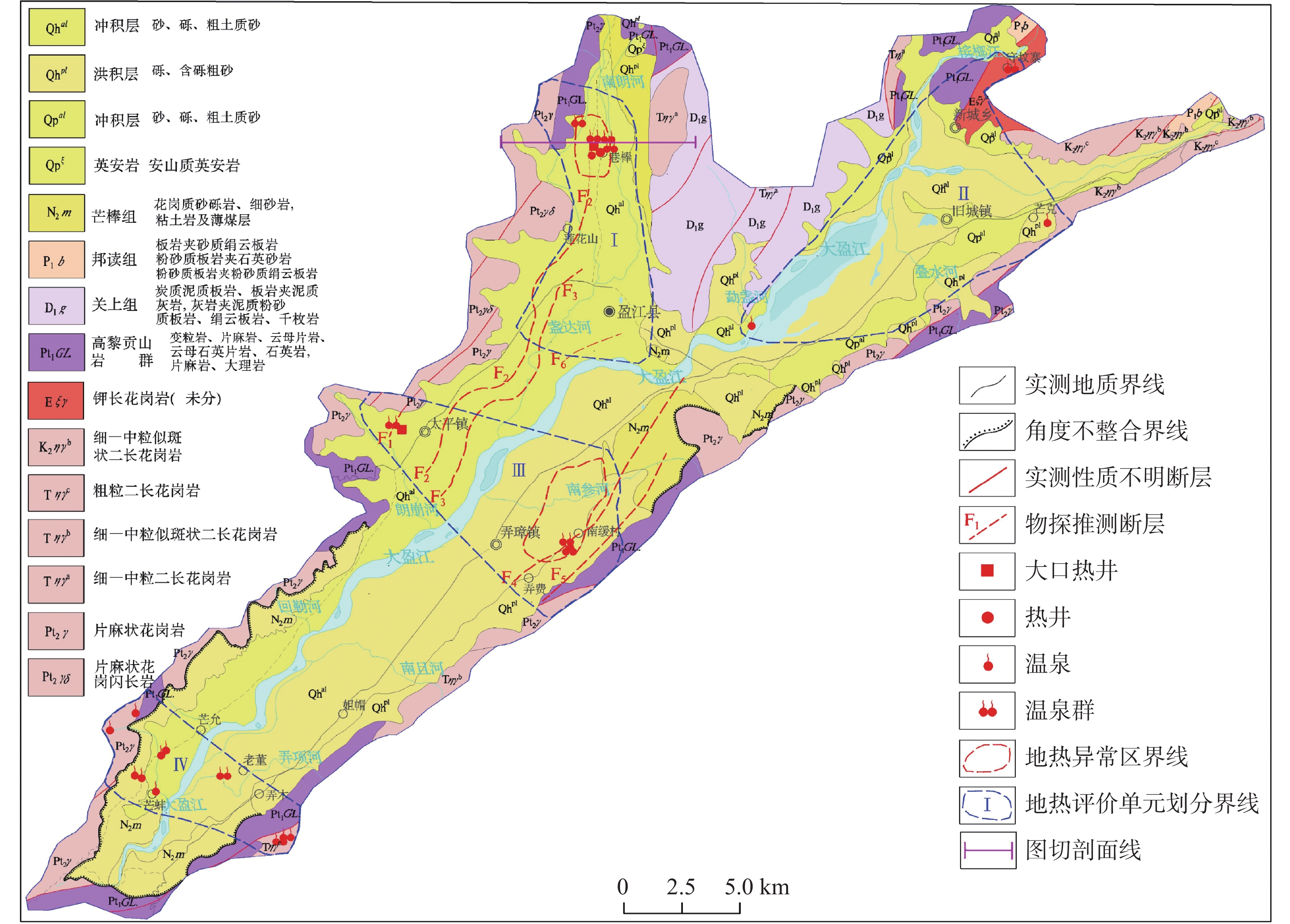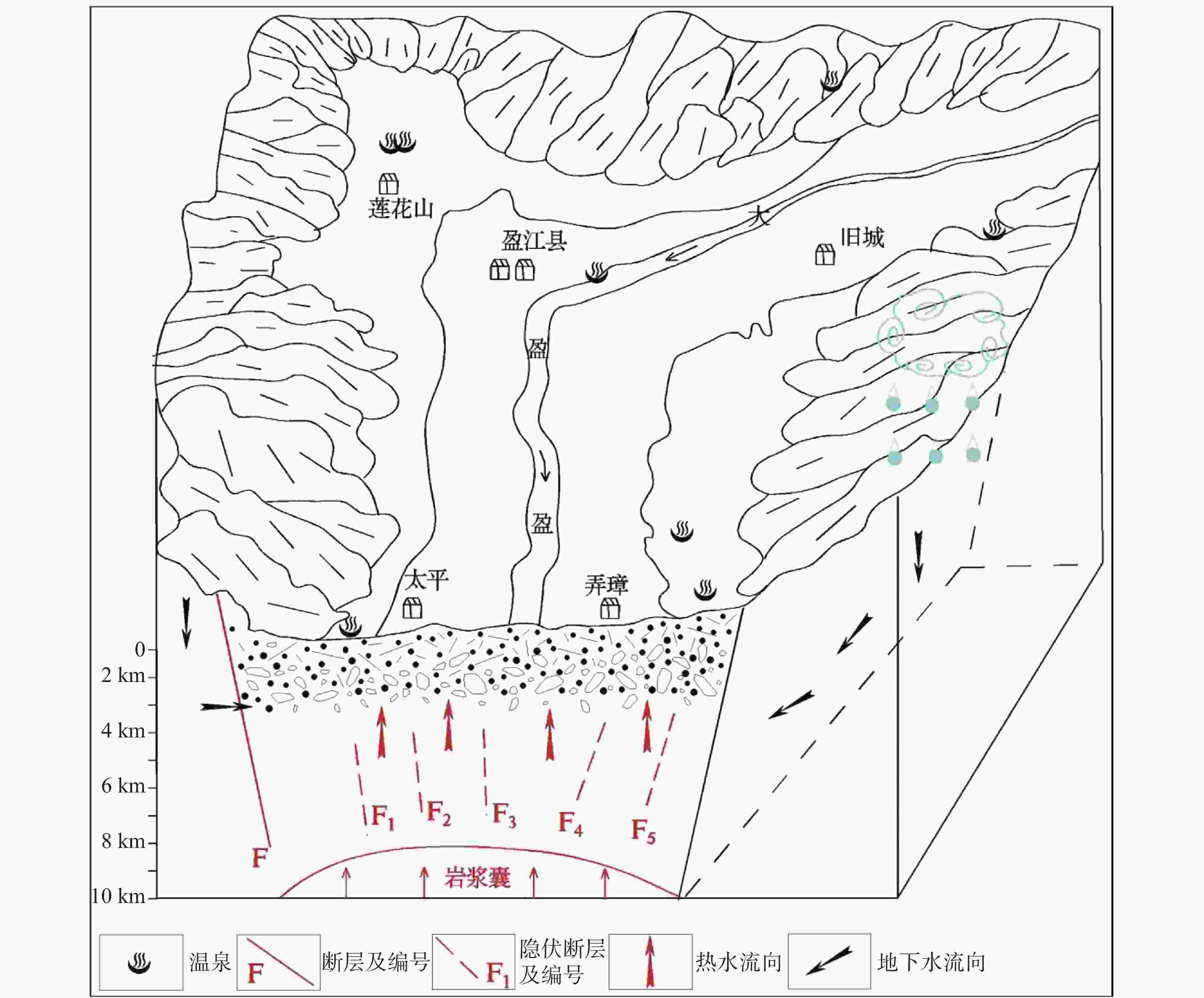 摘要: 滇西盈江盆地地热位于盈江—陇川高温热水带,属滇西高温热水区高黎贡山—腾冲亚区,地热资源丰富,但调查和研究程度低,地热资源补给来源、资源量和潜力不清。文章通过野外调查、基础地质分析、数学模型、中国大气降水线方程等方法分析地热地质构造特征、储热层结构和边界、地热水补给来源和途径,应用温泉放热量法、泉流汇总法计算地热资源量。研究表明:盈江盆地新构造运动强烈,构造发育,深部有较强的热流活动,推测岩浆囊为主要热能来源;盆周山区大气降水入渗深循环补给地下水,补给距离2.0~9.9 km,补给深度1.6~3.0 km;地下水沿着风化花岗岩、变质岩原生裂隙和后期构造断裂带下渗到地壳深部,经深部热源加热后向上运移形成地热流体,储存于盆地底部及边缘孔隙、裂隙含水层和断裂破碎带,在地貌和构造有利部位出露形成温泉和热泉;地热流体储存的热量为484.63×106 MJ,可开采量317.8万m3·a−1。Abstract:The geothermal energy of the Yingjiang basin is located within Yingjiang–Longchuan high-temperature hot water belt, which is part of Gaoligongshan–Tengchong sub-area of high-temperature hot water region of western Yunnan. The study area belongs to the southern extension of Gaoligong mountain, where the terrain gradually descends from the northeast to the southwest, resulting in an overall spatial pattern characterized by valleys and ridges. Basins, mountains, and rivers in the area are controlled by structure, showing a NE-SW trend. In addition, the Yingjiang basin is a fault basin formed by geological structure. Its geomorphology are divided into five categories: fault accumulations, low hills of lake terraces, shallow cutting gentle slopes of low or middle-height mountains, medium cutting steep slopes of middle-height mountains, and karst middle-height mountains. The Yingjiang basin is located in the eastern margin of the collision zone between the Indian Plate and the Eurasian Plate. Due to the active crustal movement for a long time, the geological structure in this area is complicated, the rock fold is broken and the stratum is missing. The outcrop strata are mainly composed of Lower Proterozoic Gaoligongshan Group (Pt1GL.), Devonian Guanguan Formation (D1g), Permian Bangdu Formation (P1b), Neogene Mangbang Formation (N2m) and alluvial and pluvial strata of the Quaternary (Q). The Yingjiang basin is rich in geothermal resources with a total of 38 geothermal points, and the geothermal outcrops can primarily be classified into 3 types: hot springs, hot wells, and open wells. However, the investigations and studies on geothermal resources are not sufficient, and especially the source of geothermal resources recharge, and the amount and potential of geothermal resources need to be illuminated. In this study, the geothermal geological structures, geothermal structures, boundaries, sources and pathways of geothermal recharge of the study area have been analyzed and studied through field investigations, basic geological analyses, mathematical models, and equations of atmospheric precipitation lines in China. Geothermal resources have been calculated by the method of heat release for hot springs and the summary of spring flow. According to the research findings, the cover layer in the study area is composed of multiple cycles from the coarse to the fine, arranged from bottom to top. The sedimentary environment is dominated by fluvial facies and lakefront facies, with a total thickness of 100–2,000 m, and some of them are more than 2,400 m, providing an environment for geothermal heat storage and preservation. The heat storage structure is belt-shaped, and its conditions are controlled by principle faults and concealed faults. The main layers for heat storage are composed of magmatic rocks, metamorphic rocks, granitic sand conglomerate, fine sandstone, magmatic rocks and metamorphic rocks of Neogene Manbang Formation, which provide the necessary conditions for the exposure of hot springs. At present, the highest temperature is shown in the borehole drilled by Dimete Company in the geothermal anomaly area of Lianhua mountain. The temperature in the borehole reaches 155 ℃. The layers of heat storage are composed of magmatic rocks, metamorphic rocks, granitic sand conglomerate and fine sandstone of Neogene Manangba Formation. The Yingjiang basin is characterized by strong neotectonic movements, structural development, and heat flow activities in the depth, which suggests that magma pocket is the source of heat energy in this area. Combined with the terrain conditions around the basin, it is considered that groundwater is recharged by the deep circulation of atmospheric precipitation infiltration in the mountainous areas around the basin, with the recharge distance of 2.0–9.9 km, and the recharge depth of 1.6–3.0 km. Groundwater permeates to the deep crust along the primary fissures and late tectonic fracture zones of weathered granite and metamorphic rocks, and then moves upward after being heated by deep heat sources to form geothermal fluids, which are stored in the pores, fractured aquifers and fracture zones at the bottom and edge of the basin, and are exposed to form hot springs and geothermal springs at the parts where geomorphologic features and structures are favorable. According to the principles of geology, structure, temperature and concentration of geothermal resources, four evaluation units are divided. They are the unit of geothermal resources at medium-high temperature (I) in Lianhua mountain of the Yingjiang river in the northwest of the basin, the unit of warm water resources at low temperature (II) in the Yingjiang river in the northeast of the basin, the unit of warm water resources at low temperature (III) in Taiping–south slope in the middle of the basin, and the unit of warm water resources at low tem