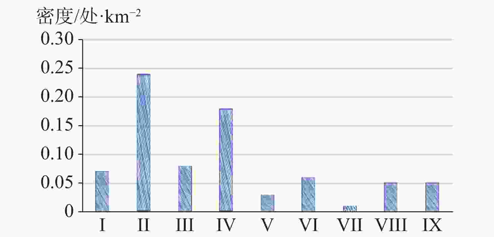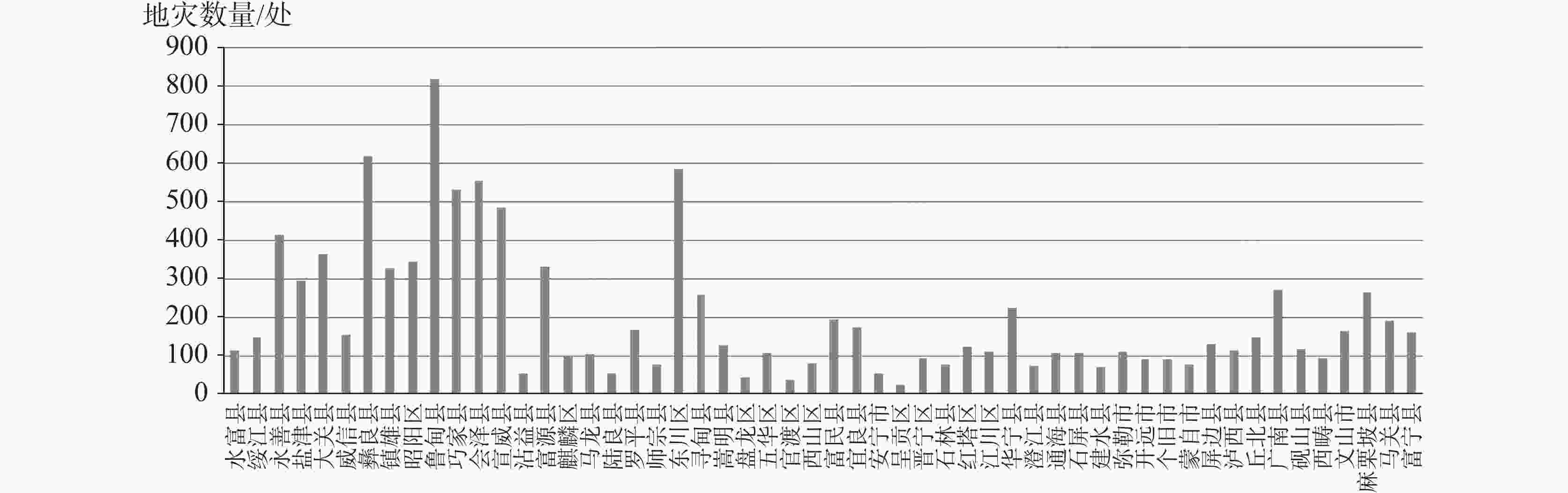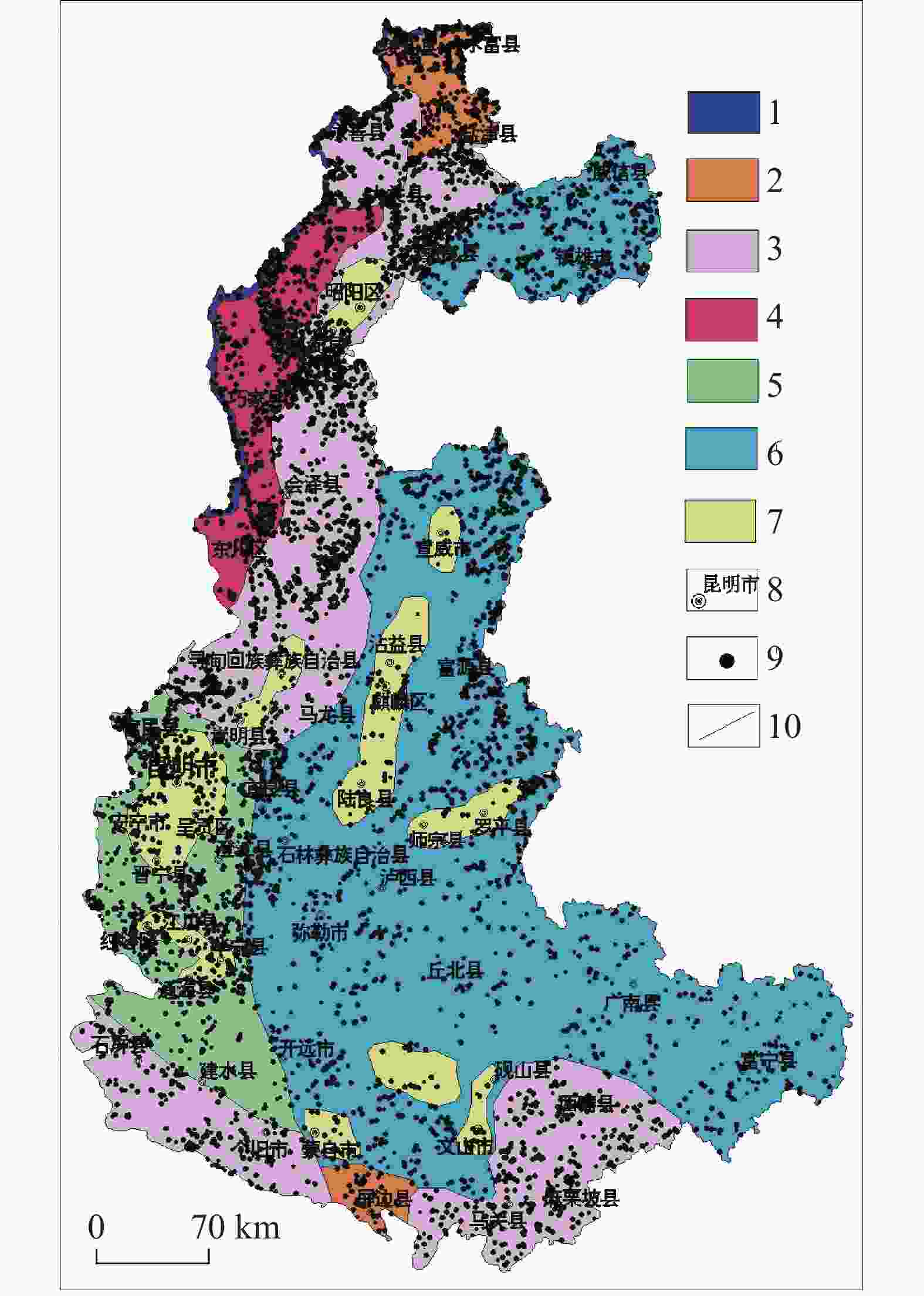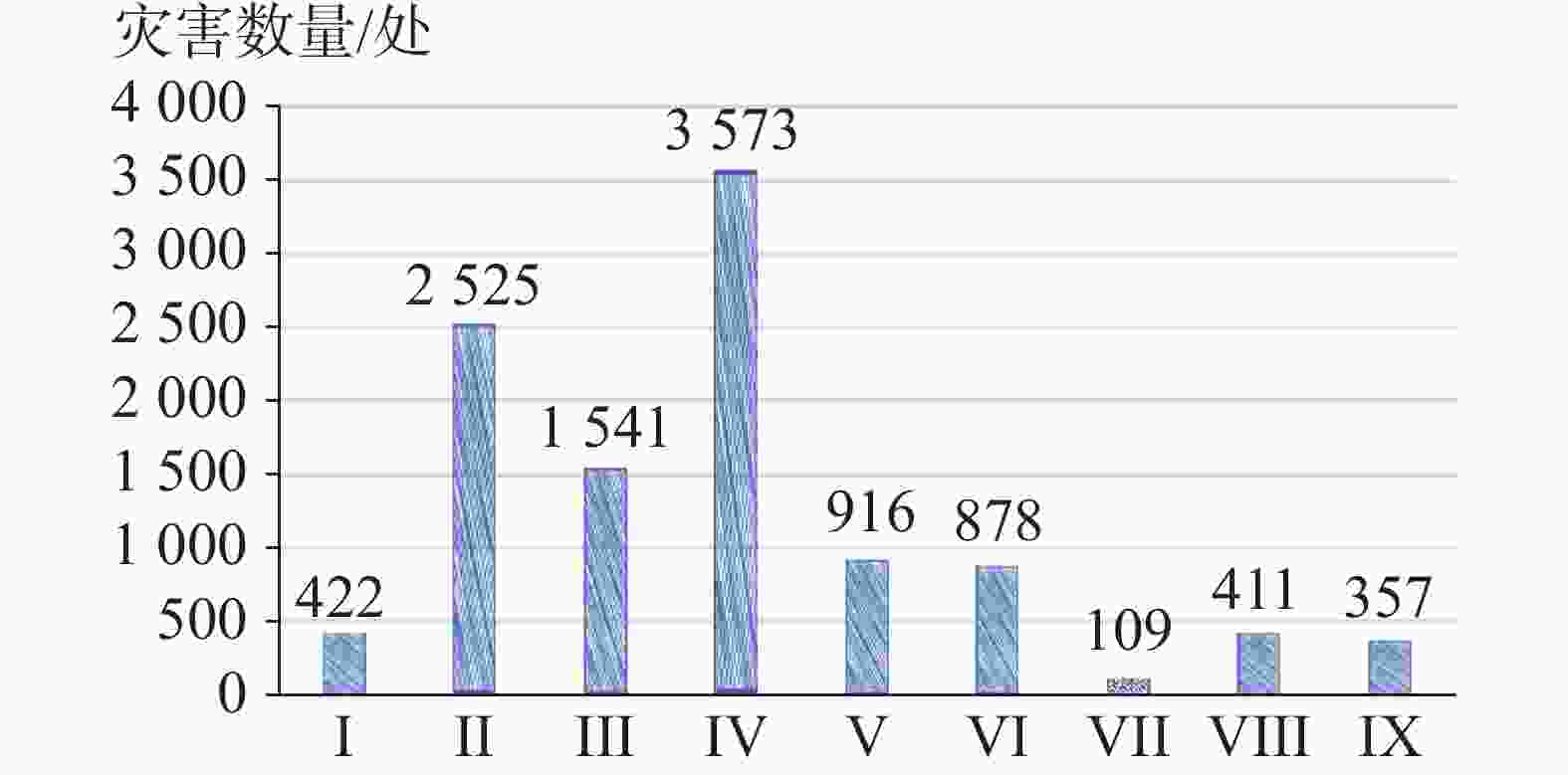 图 1 云南省大地构造分区图 1.一级构造单元界线 2.二级构造单元界线 3.一级构造单元代号 4.二级构造单元代号 5.哀牢山变质带 6.州市政府驻地 7.研究区(Ⅰ.扬子准地台构造单元;Ⅱ.华南褶皱系构造单元;Ⅲ.松潘—甘孜褶皱系构造单元;Ⅳ.唐古拉—昌都—兰坪—思茅褶皱系构造单元;Ⅴ.冈底斯—念青唐古拉褶皱系构造单元) Figure 1. Geotectonic zoning of Yunnan Province 1. boundary of first-level tectonic unit 2. boundary of secondary tectonic unit 3. code of first-level tectonic unit 4. code of secondary tectonic unit 5. metamorphic belt of Ailao mountain 6. municipal governments of autonomous prefectures 7. the study area (Ⅰ. tectonic unit of the Yangtze platform; Ⅱ. tectonic unit of South China fold system; Ⅲ. tectonic unit of Songpan–Ganzi fold system; Ⅳ. tectonic unit of Tanggula–Changdu–Lanping–Simao fold system; V. tectonic unit of Gangdisi–Nyainqentanglha fold system) 图 2 滇东北高原面边缘(河谷斜坡)示意图[5] 1.泥页岩 2.灰岩 3.白云岩 4.岩溶洞穴 5.地下水流向 6.岩溶分带界线(A.强岩溶发育带, B.弱岩溶发育带) Figure 2. Schematic diagram of the plateau edge (valley slope) in northeast Yunnan 1. mud shale 2. limestone 3. dolomite 4. karst cave 5. groundwater flow direction 6. karst zoning boundary (A. zone of strong karst development,B.zone of weak karst development) 图 7 研究区各地貌区地质灾害分布图 1.构造溶蚀高山峡谷地貌区 2.构造侵蚀低中山地貌区 3.构造溶蚀高中山地貌区 4.构造剥蚀高中山地貌区 5.构造溶蚀低中山地貌区 6.构造溶蚀峰丛洼地地貌区 7.高原盆地地貌区 8.地名 9.灾害点 10.分区界线 Figure 7. Distribution of geological disasters in various landforms of the study area 1.geomorphic area of tectonic erosion alpine canyon 2.geomorphic area of tectonic erosion low-medium mountain 3.geomorphic area of tectonic erosion high-medium mountain 4.geomorphic area of tectonic denudation high-medium mountain 5.geomorphic area of tectonic dissolution low-medium mountain 6.area of tectonic dissolution peak-cluster depression 7.geomorphic area of plateau basin 8.geographical names 9.disaster sites 10.zoning boundaries 图 12 研究区地质灾害与地质构造关系分布图 ①巧家—莲峰断裂 ②昭鲁断裂 ③会泽断裂 ④寻甸—来宾铺断裂 ⑤弥勒—富源断裂 ⑥曲靖—昭通断裂 ⑦小江断裂 ⑧普渡河断裂 ⑨文麻断裂 ⑩建水—蒙自断裂 Figure 12. Distribution of geological disasters and geological structures in the study area ① Qiaojia–Lianfeng fracture ② Zhaolu fracture ③ Huize fracture ④ Xundian–Laibinpu fracture ⑤ Mile–Fuyuan fracture ⑥ Qujing–Zhaotong fracture ⑦ Xiaojiang fracture ⑧ Puduhe fracture ⑨ Wenma fracture ⑩ Jianshui–Mengzi fracture 图 14 研究区地质灾害与工程地质岩组关系分布图 1.松散土体 2.层状碎屑岩岩组 3.层状碎屑岩夹碳酸盐岩岩组 4.层状中等岩溶化碳酸盐岩夹碎屑岩岩组 5.层状强岩溶化碳酸盐岩岩组 6.层状软硬相间的碳酸盐岩碎屑岩岩组 7.层状坚硬中等风化变质岩岩组 8.块状坚硬弱风化侵入岩岩组 9.碎裂状较坚硬中等风化喷出岩岩组 10.地名 11.地质灾害点 Figure 14. Relationship between geological disasters and engineering geological rock groups in the study area 1.loose soil 2.stratified clastic rock group 3.stratified rock group of clastic rocks interbedded with carbonate rocks 4.stratified and moderately karstified rock group of carbonate rocks interbedded with clastic rocks 5.stratified and strongly karstified carbonate rock group 6.stratified carbonate clastic rock group with alternating hard and soft layers 7.stratified hard metamorphic rock group weathered moderately 8.massive hard intrusive rock group weathered weakly 9.hard and moderately weathered extrusive rock group in the form of fragmentation 10.place names 11.geological disaster sites 图 15 研究区各岩组灾害分布对比图 Ⅰ.松散土体 Ⅱ.层状碎屑岩岩组 Ⅲ.层状碎屑岩夹碳酸盐岩岩组 Ⅳ.层状中等岩溶化碳酸盐岩夹碎屑岩岩组 Ⅴ.层状强岩溶化碳酸盐岩岩组 Ⅵ.层状软硬相间的碳酸盐岩碎屑岩岩组 Ⅶ.层状坚硬中等风化变质岩岩组 Ⅷ.块状坚硬弱风化侵入岩岩组 Ⅸ.碎裂状较坚硬中等风化喷出岩岩组 Figure 15. Comparison of geological disaster distribution of different rock groups in the study area Ⅰ.loose soil Ⅱ. stratified clastic rock group Ⅲ. stratified rock group of clastic rocks interbedded with carbonate rocks Ⅳ. stratified and moderately karstified rock group of carbonate rocks interbedded with clastic rocks V. stratified and strongly karstified carbonate rock group Ⅵ. stratified carbonate clastic rock group with alternating hard and soft layers Ⅶ. stratified hard metamorphic rock group weathered moderately Ⅷ. massive hard intrusive rock group weathered weakly Ⅸ. hard and moderately weathered extrusive rock group in the form of fragmentation 图 17 研究区各岩组灾害发育密度对比图 Ⅰ.松散土体 Ⅱ.层状碎屑岩岩组 Ⅲ.层状碎屑岩夹碳酸盐岩岩组 Ⅳ.层状中等岩溶化碳酸盐岩夹碎屑岩岩组 Ⅴ.层状强岩溶化碳酸盐岩岩组 Ⅵ.层状软硬相间的碳酸盐岩碎屑岩岩组 Ⅶ.层状坚硬中等风化变质岩岩组 Ⅷ.块状坚硬弱风化侵入岩岩组 Ⅸ.碎裂状较坚硬中等风化喷出岩岩组 Figure 17. Comparison of density of geological disaster development of different rock groups in the study area Ⅰ.loose soil Ⅱ.stratified clastic rock group Ⅲ. stratified rock group of clastic rocks interbedded with carbonate rocks Ⅳ.stratified and moderately karstified rock group of carbonate rocks interbedded with clastic rocks V.stratified and strongly karstified carbonate rock group Ⅵ.stratified carbonate