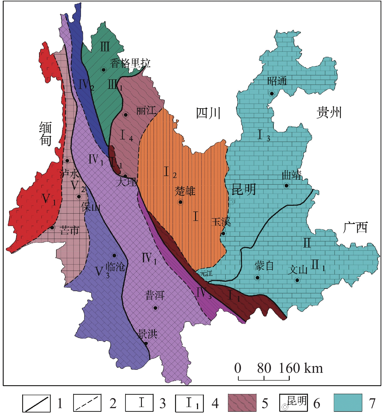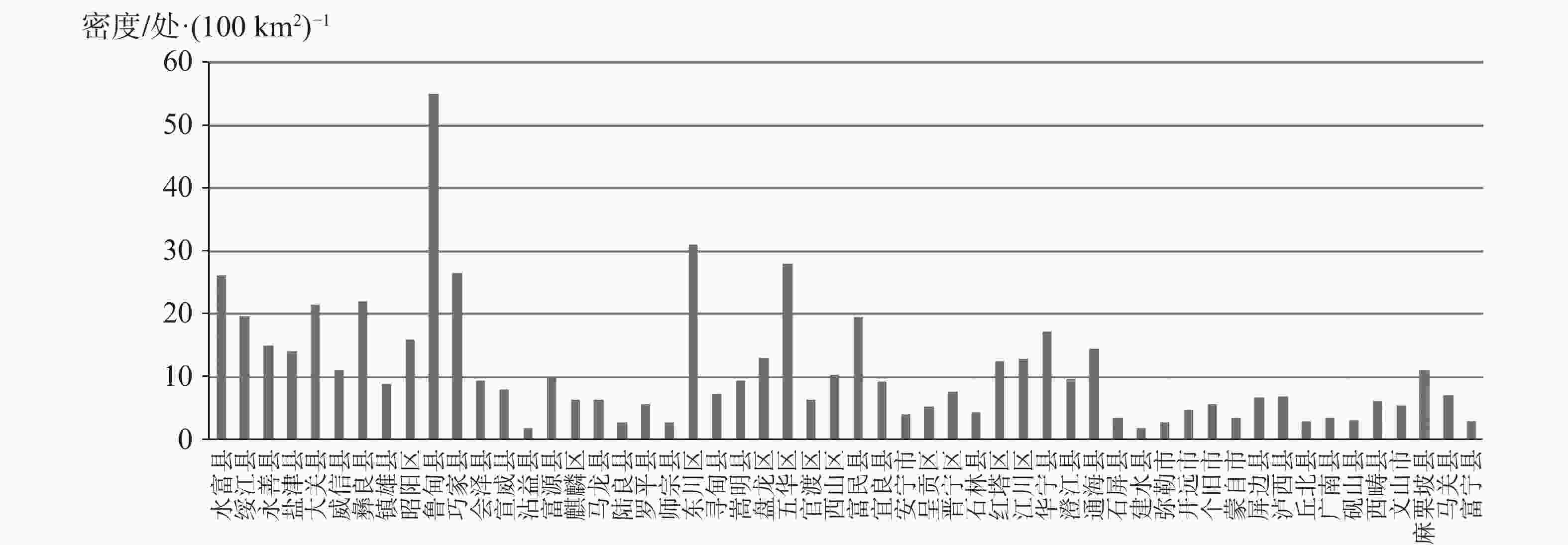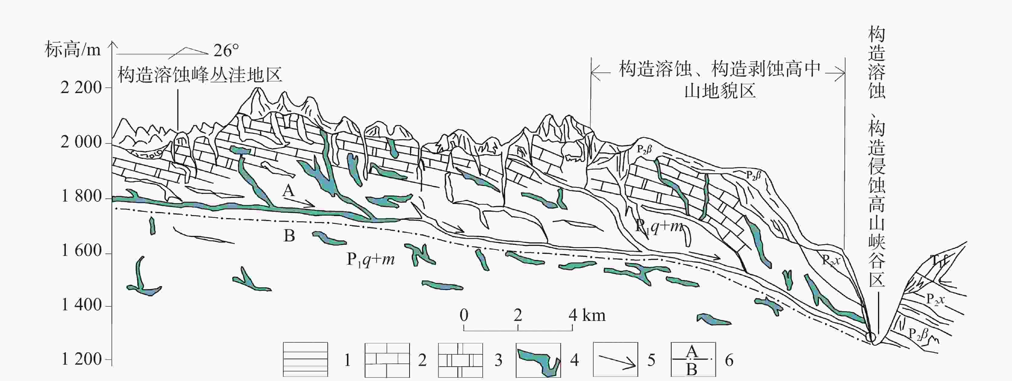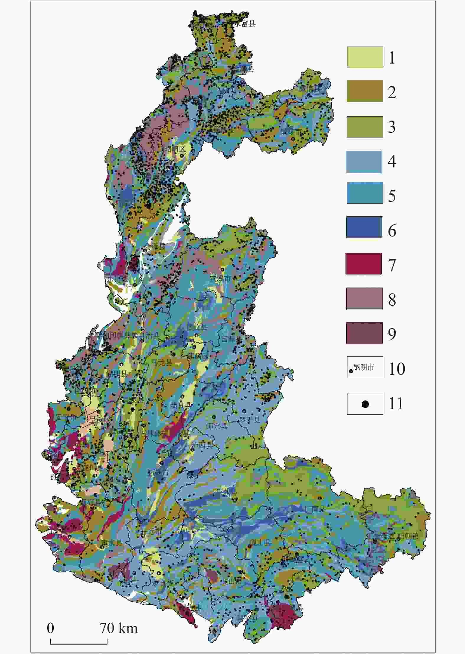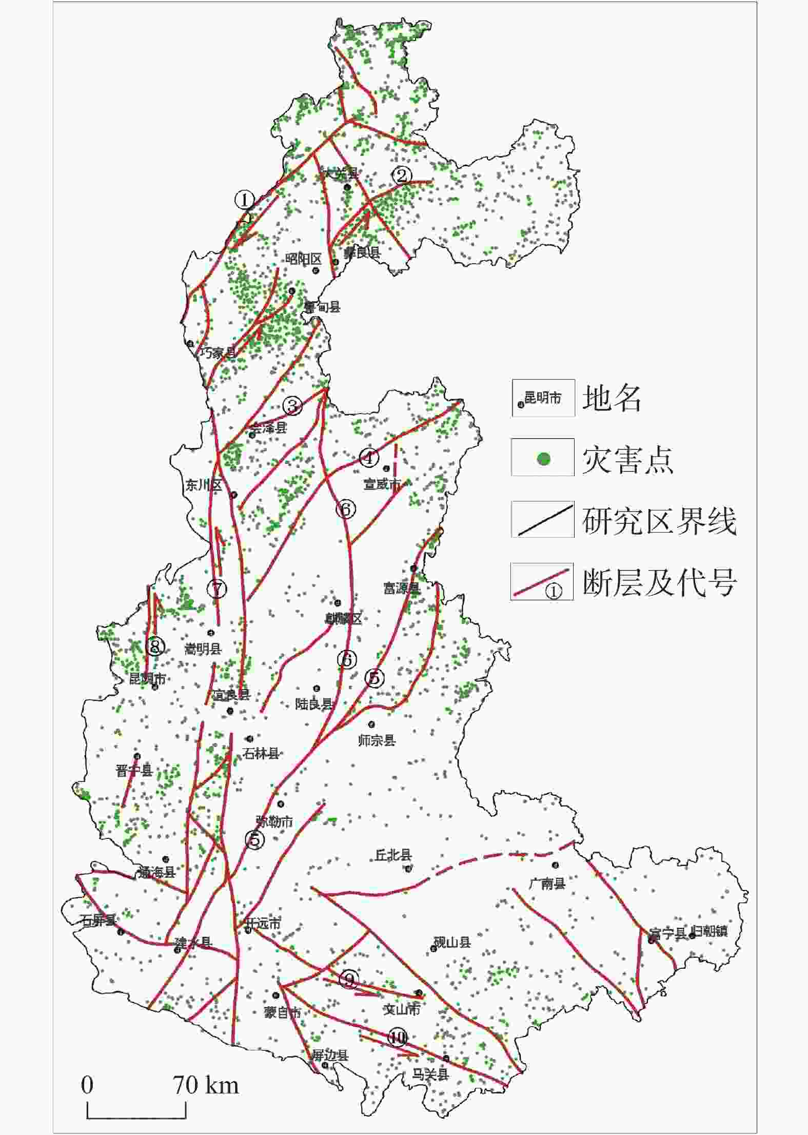 图 1 云南省大地构造分区图 1.一级构造单元界线 2.二级构造单元界线 3.一级构造单元代号 4.二级构造单元代号 5.哀牢山变质带 6.州市政府驻地 7.研究区(Ⅰ.扬子准地台构造单元;Ⅱ.华南褶皱系构造单元;Ⅲ.松潘—甘孜褶皱系构造单元;Ⅳ.唐古拉—昌都—兰坪—思茅褶皱系构造单元;Ⅴ.冈底斯—念青唐古拉褶皱系构造单元) Figure 1. Geotectonic zoning of Yunnan Province 1. boundary of first-level tectonic unit 2. boundary of secondary tectonic unit 3. code of first-level tectonic unit 4. code of secondary tectonic unit 5. metamorphic belt of Ailao mountain 6. municipal governments of autonomous prefectures 7. the study area (Ⅰ. tectonic unit of the Yangtze platform; Ⅱ. tectonic unit of South China fold system; Ⅲ. tectonic unit of Songpan–Ganzi fold system; Ⅳ. tectonic unit of Tanggula–Changdu–Lanping–Simao fold system; V. tectonic unit of Gangdisi–Nyainqentanglha fold system) 图 2 滇东北高原面边缘(河谷斜坡)示意图[5] 1.泥页岩 2.灰岩 3.白云岩 4.岩溶洞穴 5.地下水流向 6.岩溶分带界线(A.强岩溶发育带, B.弱岩溶发育带) Figure 2. Schematic diagram of the plateau edge (valley slope) in northeast Yunnan 1. mud shale 2. limestone 3. dolomite 4. karst cave 5. groundwater flow direction 6. karst zoning boundary (A. zone of strong karst development,B.zone of weak karst development) 图 7 研究区各地貌区地质灾害分布图 1.构造溶蚀高山峡谷地貌区 2.构造侵蚀低中山地貌区 3.构造溶蚀高中山地貌区 4.构造剥蚀高中山地貌区 5.构造溶蚀低中山地貌区 6.构造溶蚀峰丛洼地地貌区 7.高原盆地地貌区 8.地名 9.灾害点 10.分区界线 Figure 7. Distribution of geological disasters in various landforms of the study area 1.geomorphic area of tectonic erosion alpine canyon 2.geomorphic area of tectonic erosion low-medium mountain 3.geomorphic area of tectonic erosion high-medium mountain 4.geomorphic area of tectonic denudation high-medium mountain 5.geomorphic area of tectonic dissolution low-medium mountain 6.area of tectonic dissolution peak-cluster depression 7.geomorphic area of plateau basin 8.geographical names 9.disaster sites 10.zoning boundaries 图 12 研究区地质灾害与地质构造关系分布图 ①巧家—莲峰断裂 ②昭鲁断裂 ③会泽断裂 ④寻甸—来宾铺断裂 ⑤弥勒—富源断裂 ⑥曲靖—昭通断裂 ⑦小江断裂 ⑧普渡河断裂 ⑨文麻断裂 ⑩建水—蒙自断裂 Figure 12. Distribution of geological disasters and geological structures in the study area ① Qiaojia–Lianfeng fracture ② Zhaolu fracture ③ Huize fracture ④ Xundian–Laibinpu fracture ⑤ Mile–Fuyuan fracture ⑥ Qujing–Zhaotong fracture ⑦ Xiaojiang fracture ⑧ Puduhe fracture ⑨ Wenma fracture ⑩ Jianshui–Mengzi fracture 图 14 研究区地质灾害与工程地质岩组关系分布图 1.松散土体 2.层状碎屑岩岩组 3.层状碎屑岩夹碳酸盐岩岩组 4.层状中等岩溶化碳酸盐岩夹碎屑岩岩组 5.层状强岩溶化碳酸盐岩岩组 6.层状软硬相间的碳酸盐岩碎屑岩岩组 7.层状坚硬中等风化变质岩岩组 8.块状坚硬弱风化侵入岩岩组 9.碎裂状较坚硬中等风化喷出岩岩组 10.地名 11.地质灾害点 Figure 14. Relationship between geological disasters and engineering geological rock groups in the study area 1.loose soil 2.stratified clastic rock group 3.stratified rock group of clastic rocks interbedded with carbonate rocks 4.stratified and moderately karstified rock group of carbonate rocks interbedded with clastic rocks 5.stratified and strongly karstified carbonate rock group 6.stratified carbonate clastic rock group with alternating hard and soft layers 7.stratified hard metamorphic rock group weathered moderately 8.massive hard intrusive rock group weathered weakly 9.hard and moderately weathered extrusive rock group in the form of fragmentation 10.place names 11.geological disaster sites 图 15 研究区各岩组灾害分布对比图 Ⅰ.松散土体 Ⅱ.层状碎屑岩岩组 Ⅲ.层状碎屑岩夹碳酸盐岩岩组 Ⅳ.层状中等岩溶化碳酸盐岩夹碎屑岩岩组 Ⅴ.层状强岩溶化碳酸盐岩岩组 Ⅵ.层状软硬相间的碳酸盐岩碎屑岩岩组 Ⅶ.层状坚硬中等风化变质岩岩组 Ⅷ.块状坚硬弱风化侵入岩岩组 Ⅸ.碎裂状较坚硬中等风化喷出岩岩组 Figure 15. Comparison of geological disaster distribution of different rock groups in the study area Ⅰ.loose soil Ⅱ. stratified clastic rock group Ⅲ. stratified rock group of clastic rocks interbedded with carbonate rocks Ⅳ. stratified and moderately karstified rock group of carbonate rocks interbedded with clastic rocks V. stratified and strongly karstified carbonate rock group Ⅵ. stratified carbonate clastic rock group with alternating hard and soft layers Ⅶ. stratified hard metamorphic rock group weathered moderately Ⅷ. massive hard intrusive rock group weathered weakly Ⅸ. hard and moderately weathered extrusive rock group in the form of fragmentation 图 17 研究区各岩组灾害发育密度对比图 Ⅰ.松散土体 Ⅱ.层状碎屑岩岩组 Ⅲ.层状碎屑岩夹碳酸盐岩岩组 Ⅳ.层状中等岩溶化碳酸盐岩夹碎屑岩岩组 Ⅴ.层状强岩溶化碳酸盐岩岩组 Ⅵ.层状软硬相间的碳酸盐岩碎屑岩岩组 Ⅶ.层状坚硬中等风化变质岩岩组 Ⅷ.块状坚硬弱风化侵入岩岩组 Ⅸ.碎裂状较坚硬中等风化喷出岩岩组 Figure 17. Comparison of density of geological disaster development of different rock groups in the study area Ⅰ.loose soil Ⅱ.stratified clastic rock group Ⅲ. stratified rock group of clastic rocks interbedded with carbonate rocks Ⅳ.stratified and moderately karstified rock group of carbonate rocks interbedded with clastic rocks V.stratified and strongly karstified carbonate rock group Ⅵ.stratified carbonate