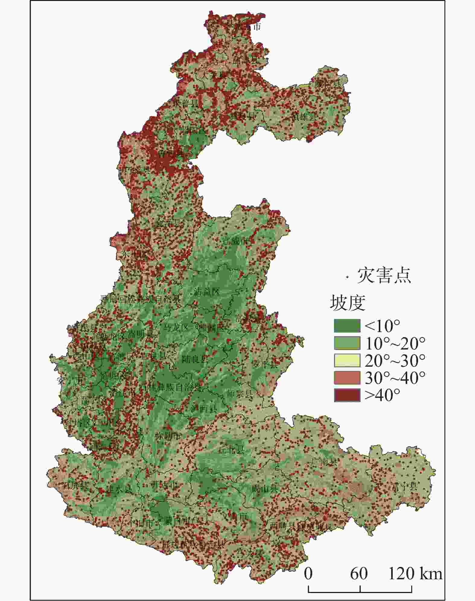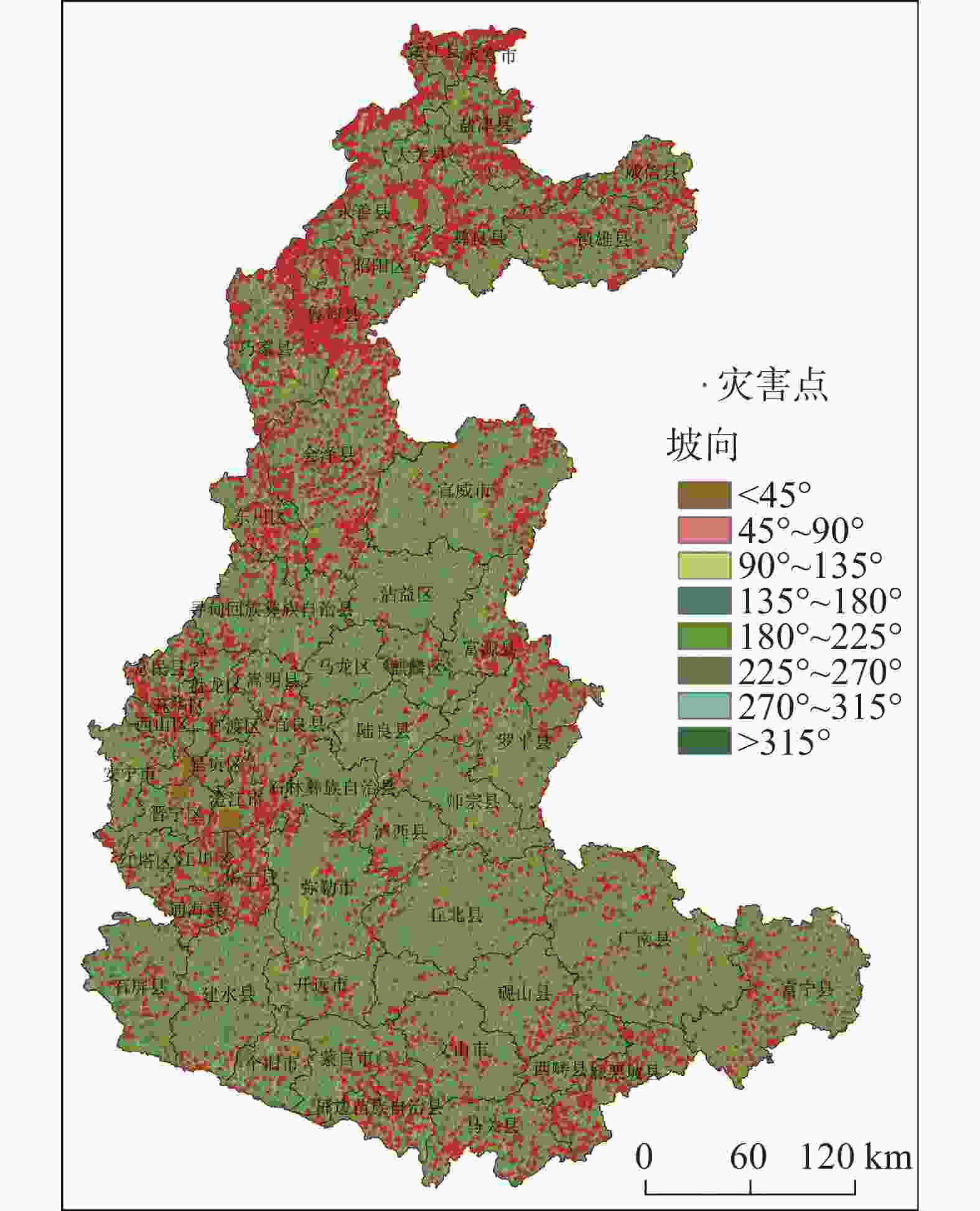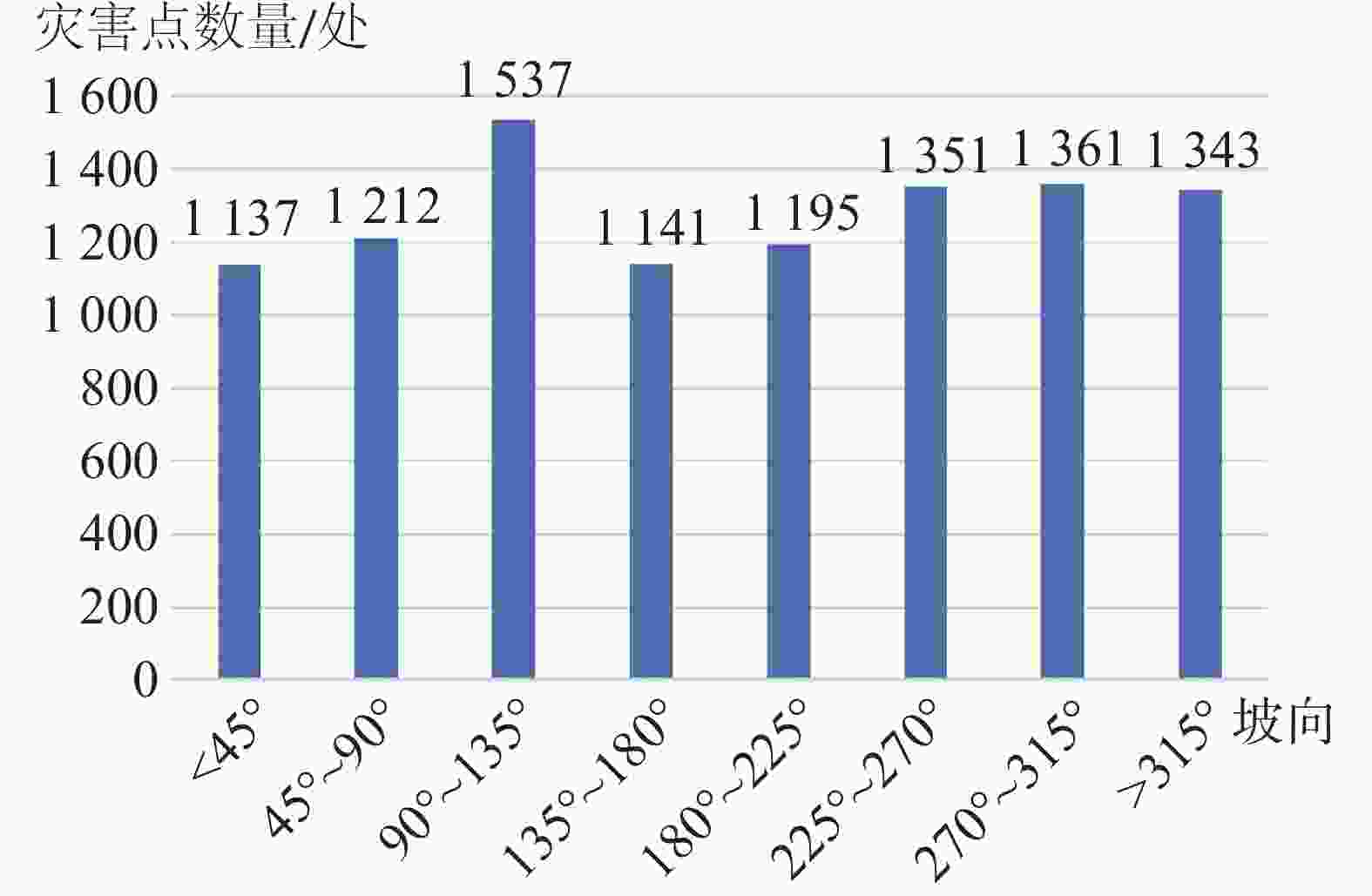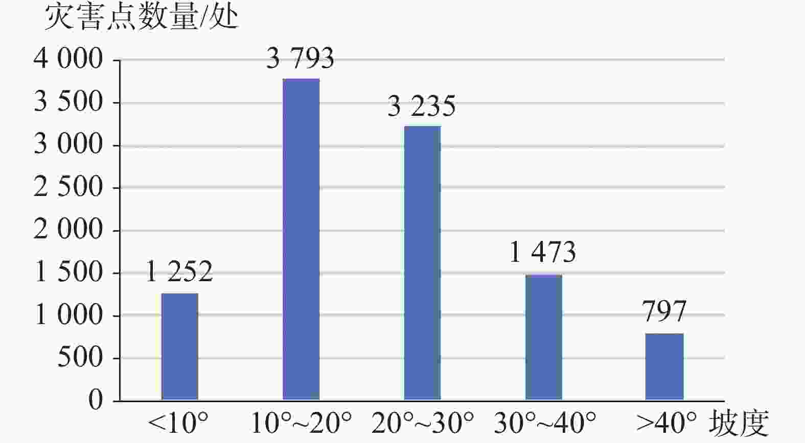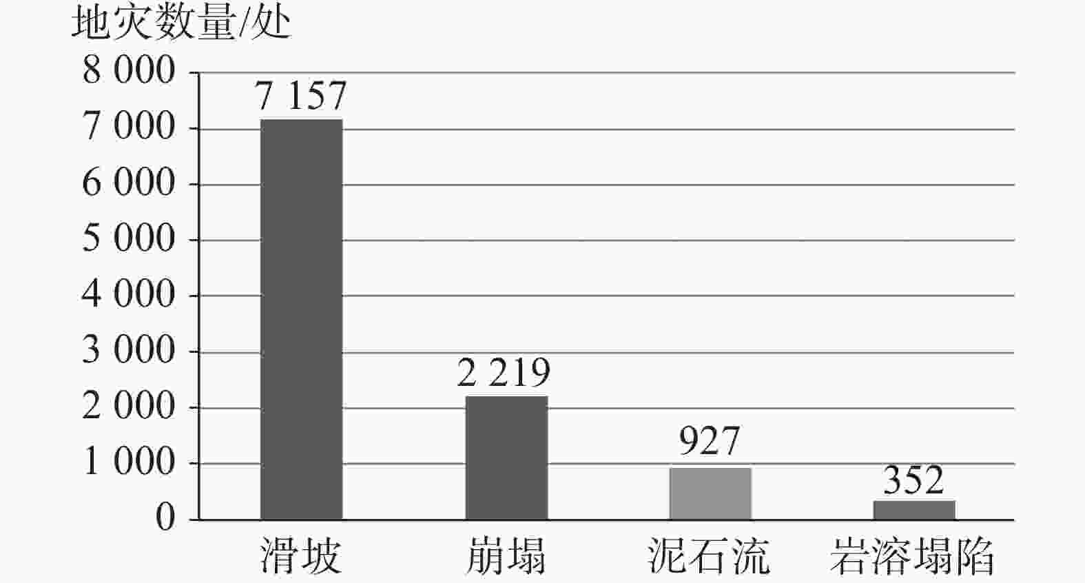 /个·km−2滑坡 崩塌 泥石流 岩溶塌陷 小计 构造溶蚀高山峡谷地貌区 3 581 356 214 237 0 807 7.57 0.23 构造侵蚀低中山地貌区 6 813 932 98 59 0 1 089 10.22 0.16 构造溶蚀高中山地貌区 15 937 1 894 841 287 139 3 161 29.67 0.2 构造剥蚀高中山地貌区 9 766 1 368 553 149 0 2 070 19.43 0.21 构造溶蚀低中山地貌区 9 275 984 379 54 98 1 515 14.22 0.16 构造溶蚀峰丛洼地地貌区 66 349 1 577 134 141 74 1 926 18.08 0.03 高原盆地地貌区 12 737 46 0 0 41 87 0.82 0.01 合计 124 458 7 157 2 219 927 352 10 655 100 0.09 表 2 研究区不同斜坡结构类型地质灾害数量对比表 Table 2. Comparison of quantity of geological disasters in different types of slope structures in the study area 斜坡结构类型 滑坡 崩塌 合计 数量 百分比 数量 百分比 数量 百分比 横向斜坡 845 11.81 78 3.52 923 9.84 顺向斜坡 1 638 22.89 1 357 61.15 2995 31.94 正交斜坡 847 11.83 54 2.43 901 9.61 斜交斜坡 2 264 31.63 689 31.05 2953 31.50 逆向斜坡 1 563 21.84 41 1.85 1604 17.11 合计 7 157 100.00 2 219 100.00 9376 100.00