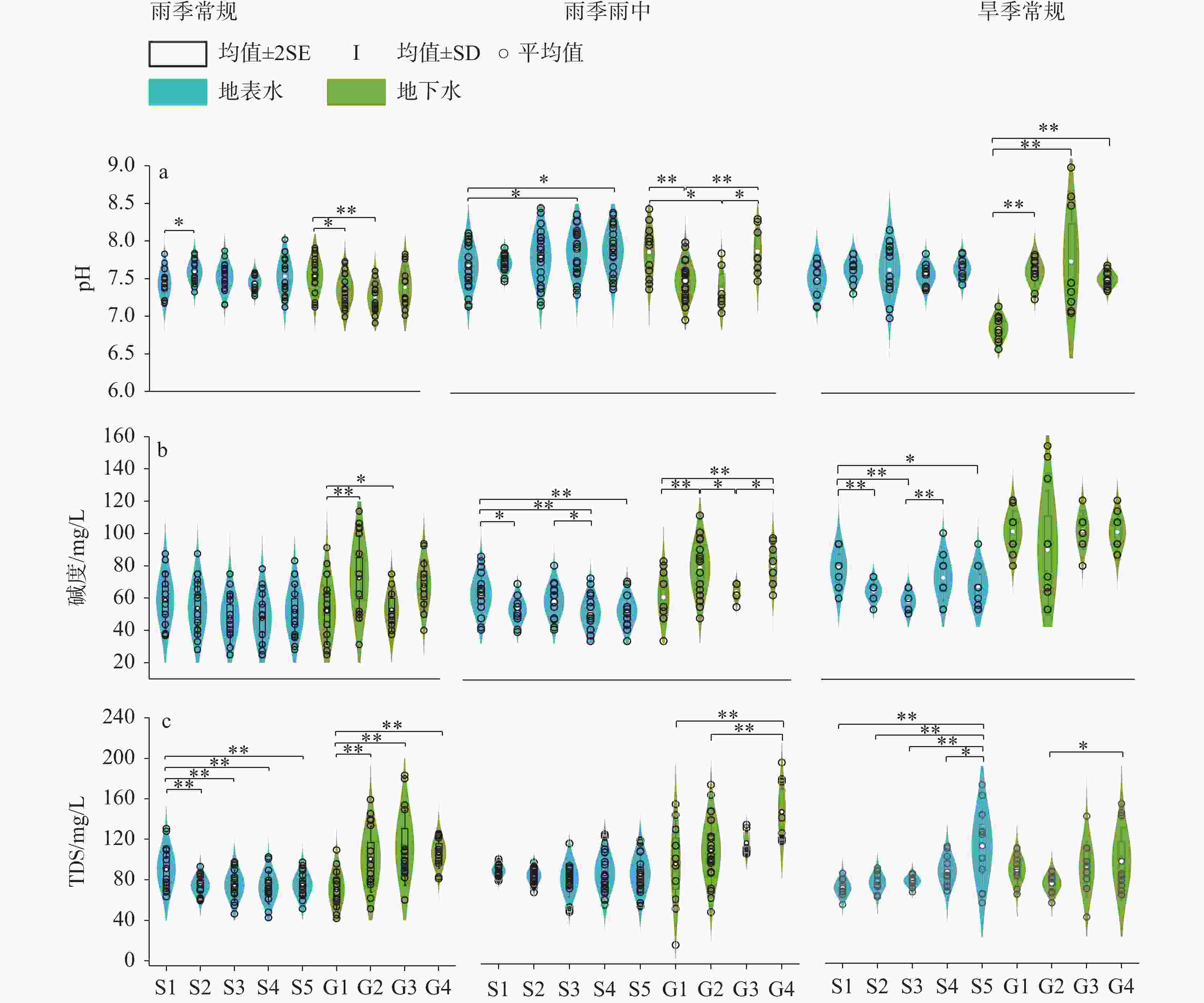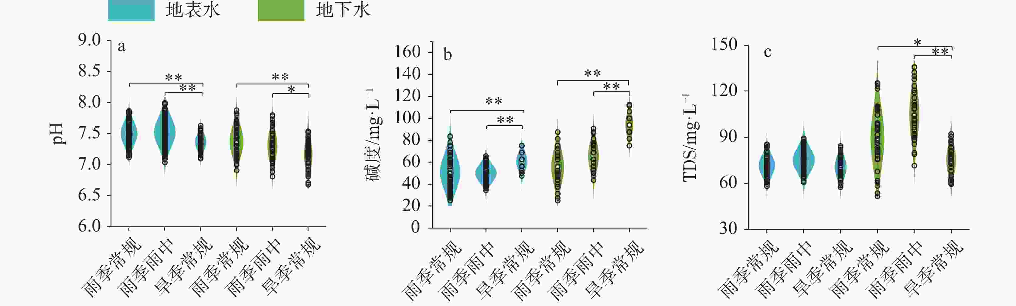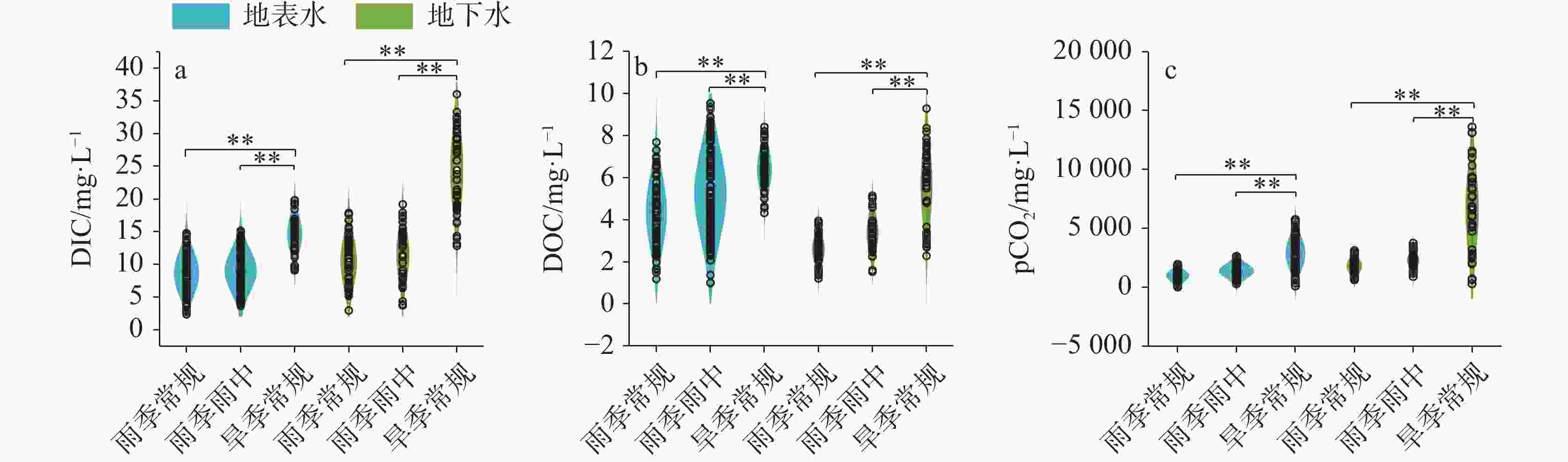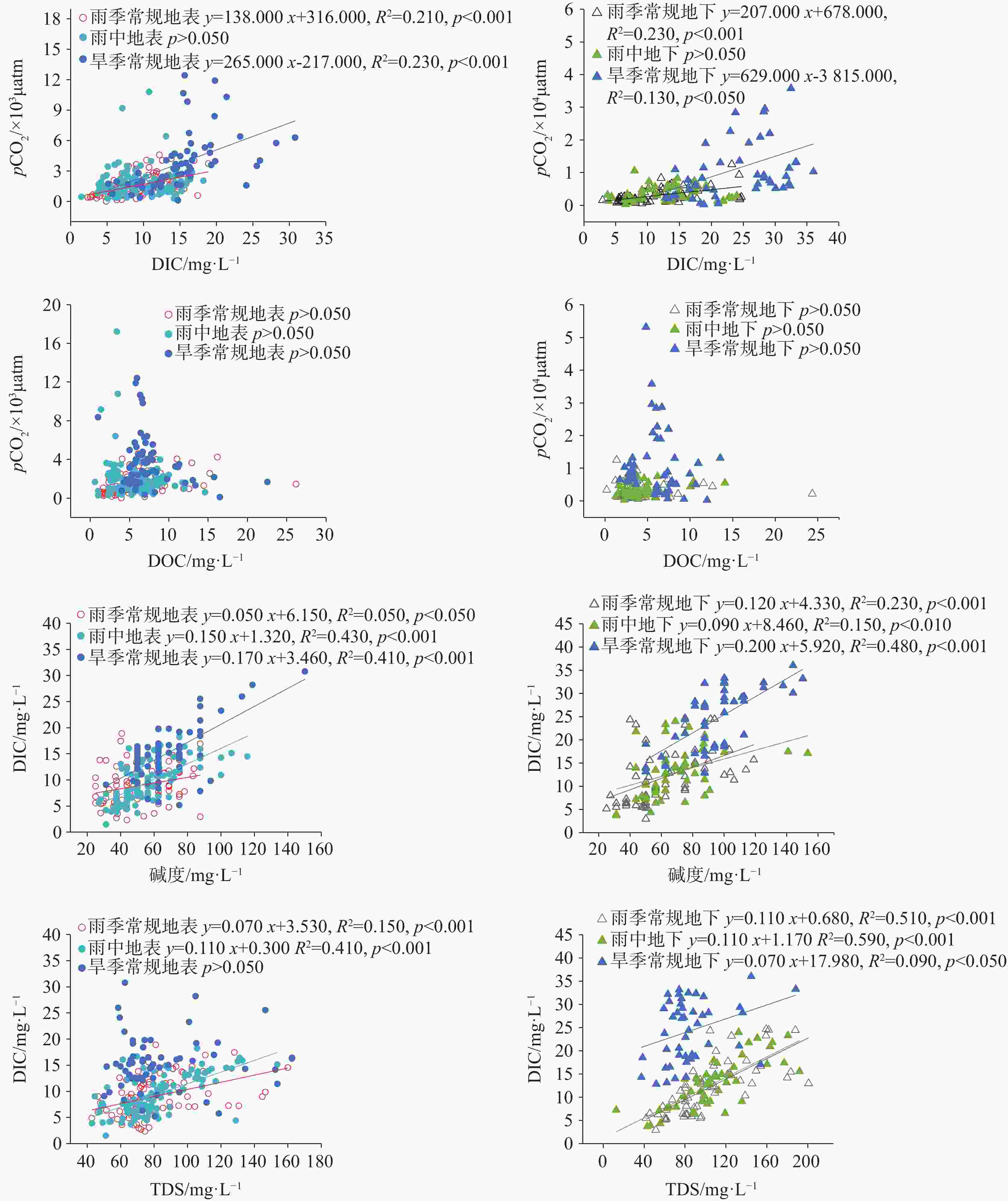 摘要: 喀斯特流域是岩石风化碳汇的关键区域,同时也是CO2逸散研究的热点区域。为探究喀斯特地下河涌出后CO2分压(pCO2)及其逸散通量的时空变化格局,选择喀斯特流域巴马盘阳河为对象,分析水体的pH、碱度、总溶解性固体(TDS)、溶解无机碳(DIC)、溶解有机碳(DOC)、pCO2的时空变化特征,探讨pCO2的调控因素并估算了CO2逸散通量。结果表明,流域内地下水碱度、TDS、DIC和pCO2显著高于地表水,表明喀斯特碳酸盐风化释放大量DIC进入地下水,地下水涌出后产生CO2逸散降低了地表水DIC含量和pCO2。在时间尺度上,旱季常规地表、地下水的碱度、TDS、DIC、pCO2、CO2逸散通量均显著高于雨季,主要归结于雨季雨水的稀释效应。然而次降雨事件下地表、地下水的pH、碱度、TDS、DIC、DOC、pCO2无显著性差异,可能由于降雨量不足或降雨持续时间短。研究期间,巴马盘阳河流域地表水、地下水CO2逸散通量范围分别为−0.10~9.20 kg C m−2 year−1,−0.12~17.28 kg C m−2 year−1,平均CO2逸散通量分别为1.06±1.46 kg C m−2 year−1和2.40±3.14 kg C m−2 year−1,远高于全球主要大型流域的平均CO2逸散通量(0.64 kg C m−2 year−1)。阐明喀斯特流域的CO2逸散通量及其时空变化特征对准确评估河流碳收支状况与评估岩石风化碳汇具有重要意义。Abstract: