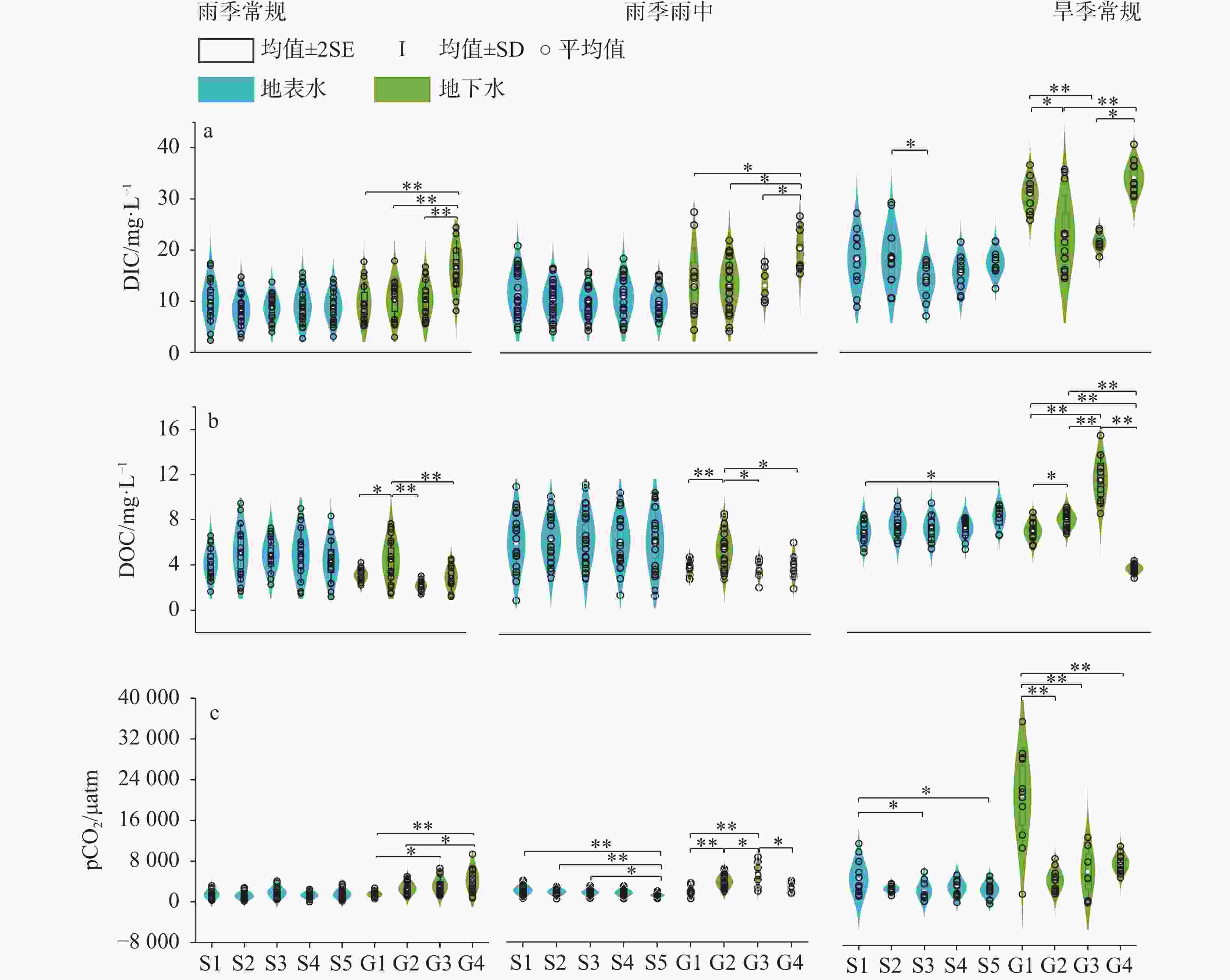 采样点 S1 S2 S3 S4 S5 G1 G2 G3 G4 旱季常规 3.08±2.98 1.74±0.86 1.83±1.72 1.99±1.47 1.59±1.18 9.55±4.94 3.42±2.66 2.15±2.24 4.76±2.50 雨季常规 0.41±0.36 0.23±0.0.25 0.58±0.44 0.37±0.27 0.51±0.44 0.41±0.25 0.89±0.48 1.29±0.84 1.39±0.80 雨季雨中 0.58±0.38 0.47±0.22 0.43±0.26 0.46±0.34 0.18±0.13 0.47±0.33 1.34±0.66 1.85±1.06 0.93±0.50 全年平均 1.52±2.34 0.82±0.93 1.03±1.24 0.99±1.23 0.90±0.95 4.07±5.46 1.76±2.00 1.60±1.56 2.74±2.37 注: CO2逸散通量单位为kg C m−2 year−1