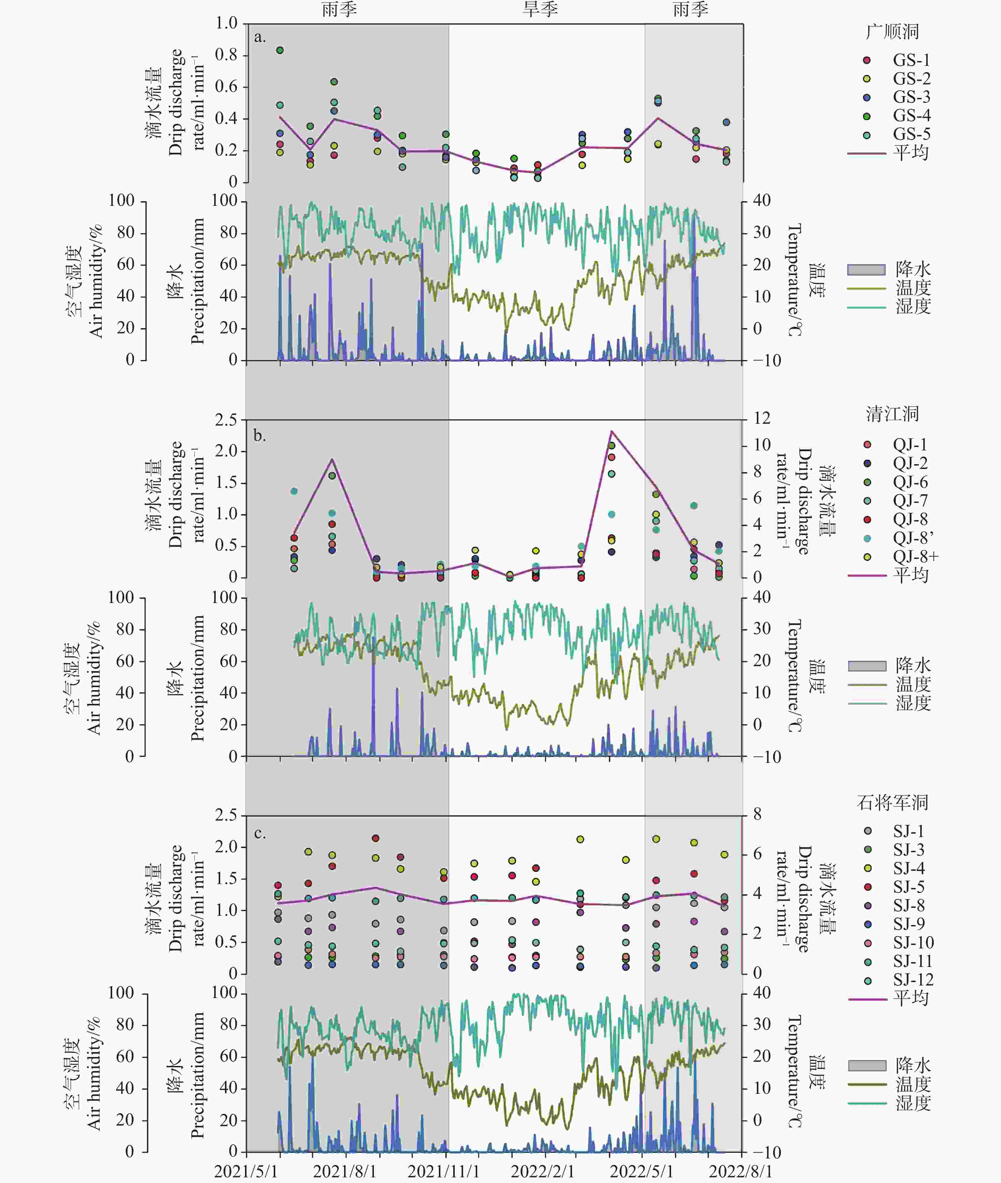 Figure  2.  Seasonal variations of drip discharge rates and meteorological data in Guangshun cave (a), Qingjiang cave (b), and Shijiangjun cave (c)