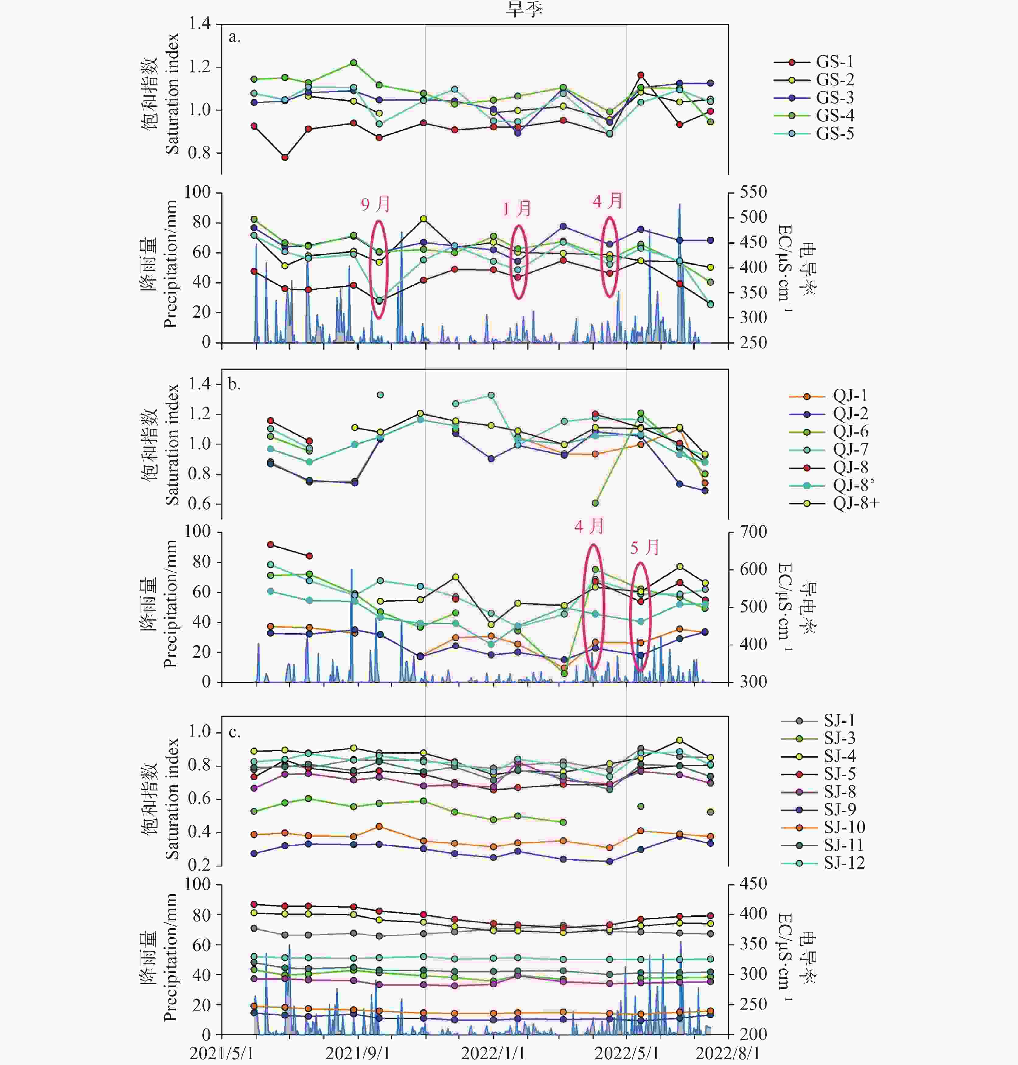 Figure  3.  Seasonal variations of drip conductivity, saturation index and precipitation in Gwangshun cave (a), Qingjiang cave (b) and Shijongjun cave (c)
