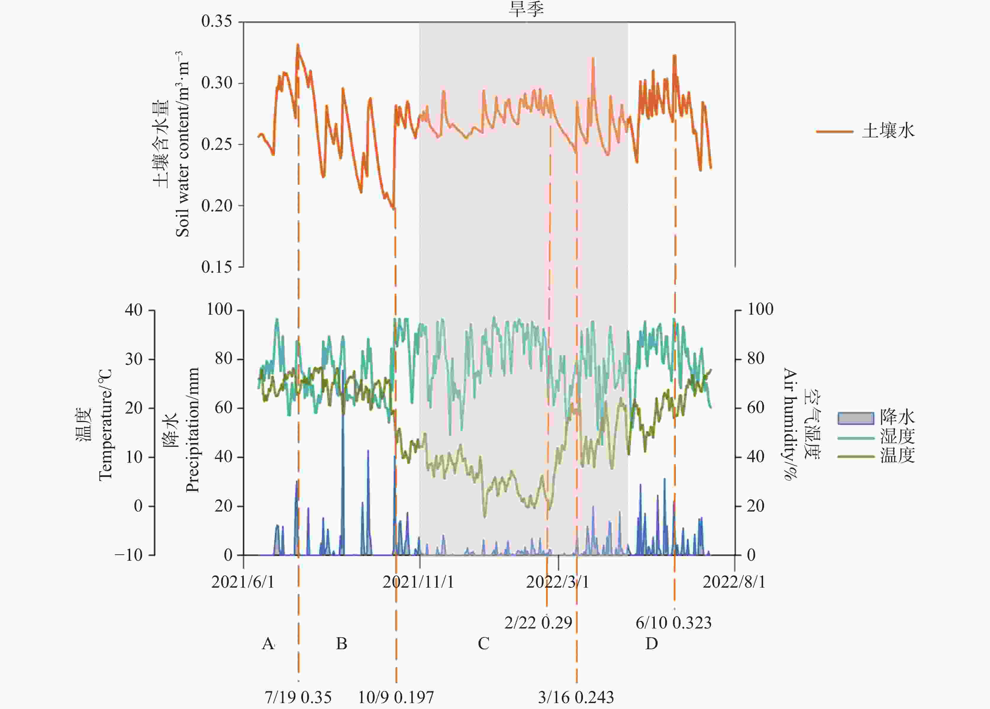 Figure  4.  Seasonal variations of soil water content and meteorological data in Qingjiang cave